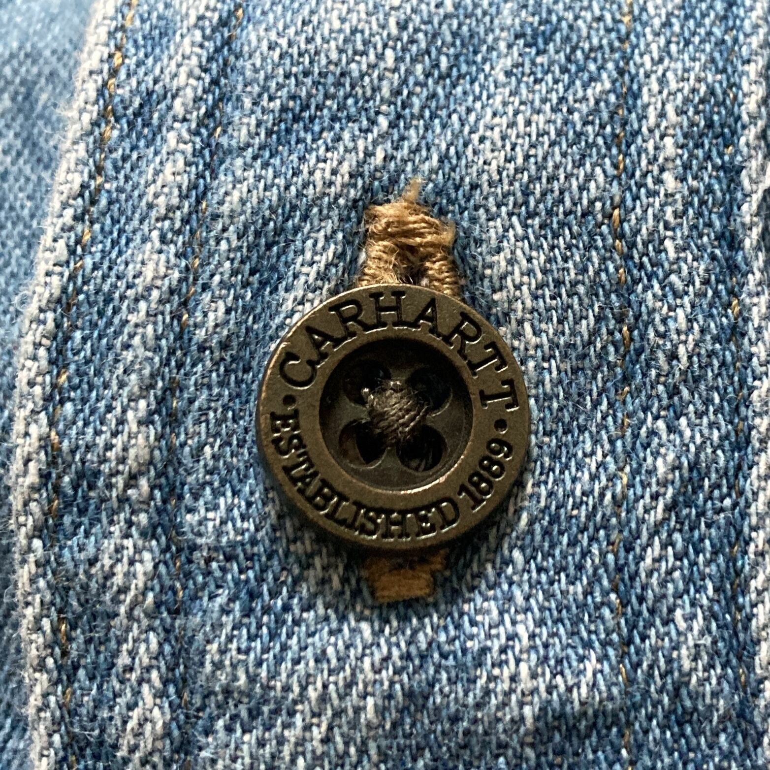 carhartt カーハート 表記M ワンポイントロゴ 刺繍 企業物 一点物 ブランドロゴボタン メタルボタン ビッグサイズ デニムシャツ