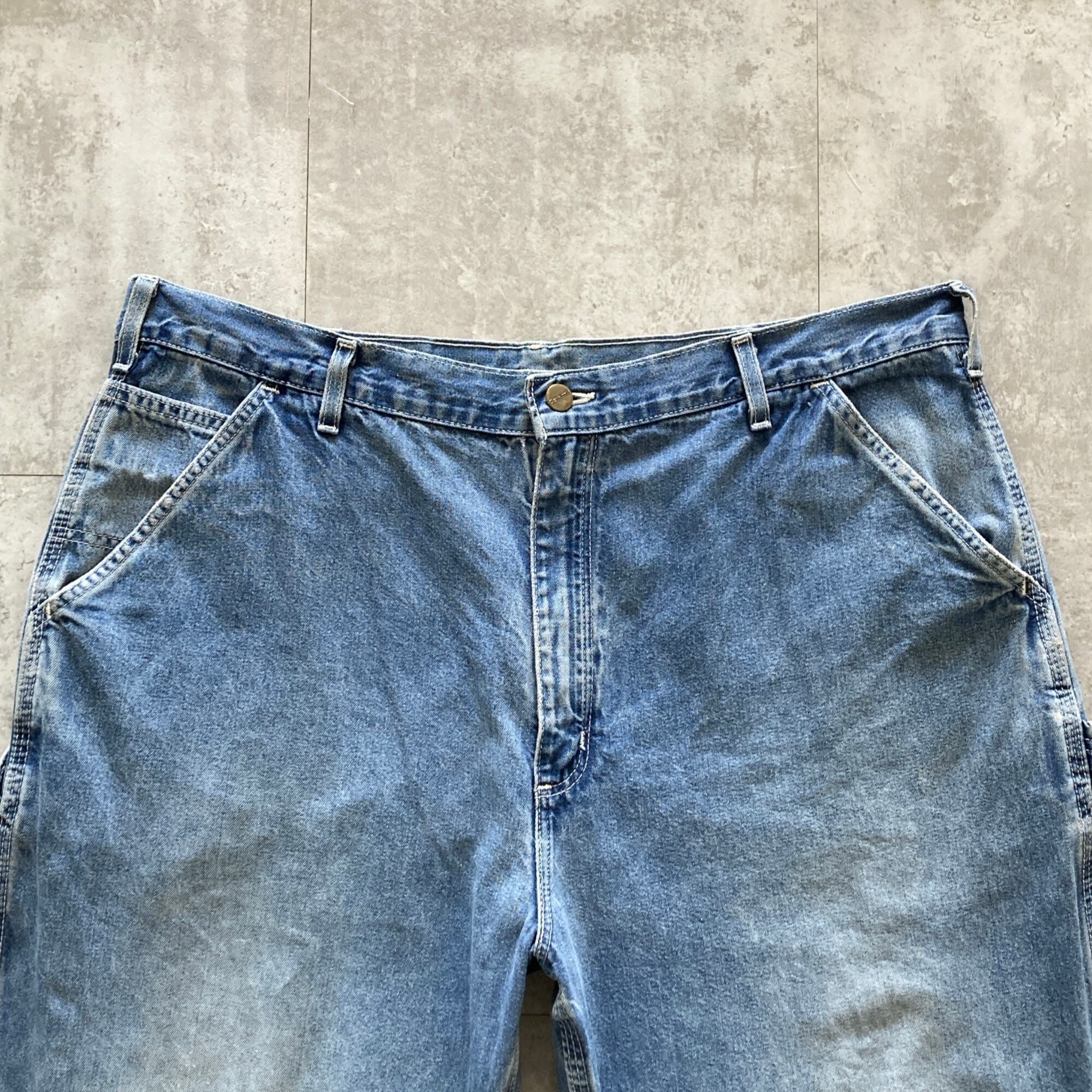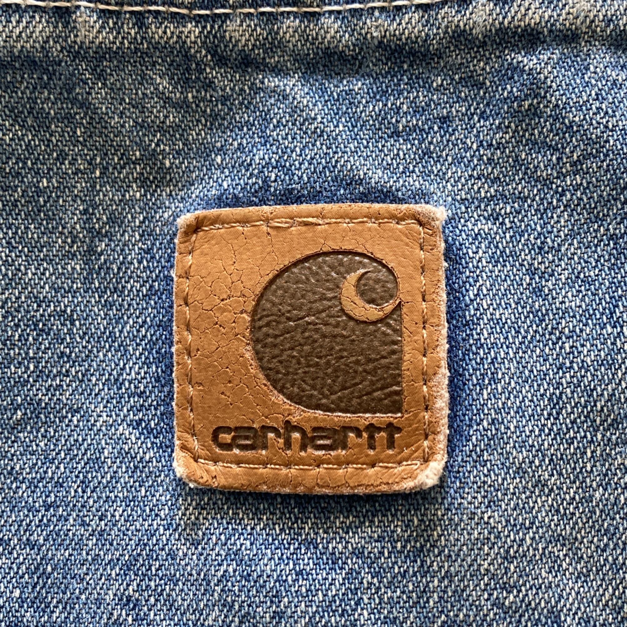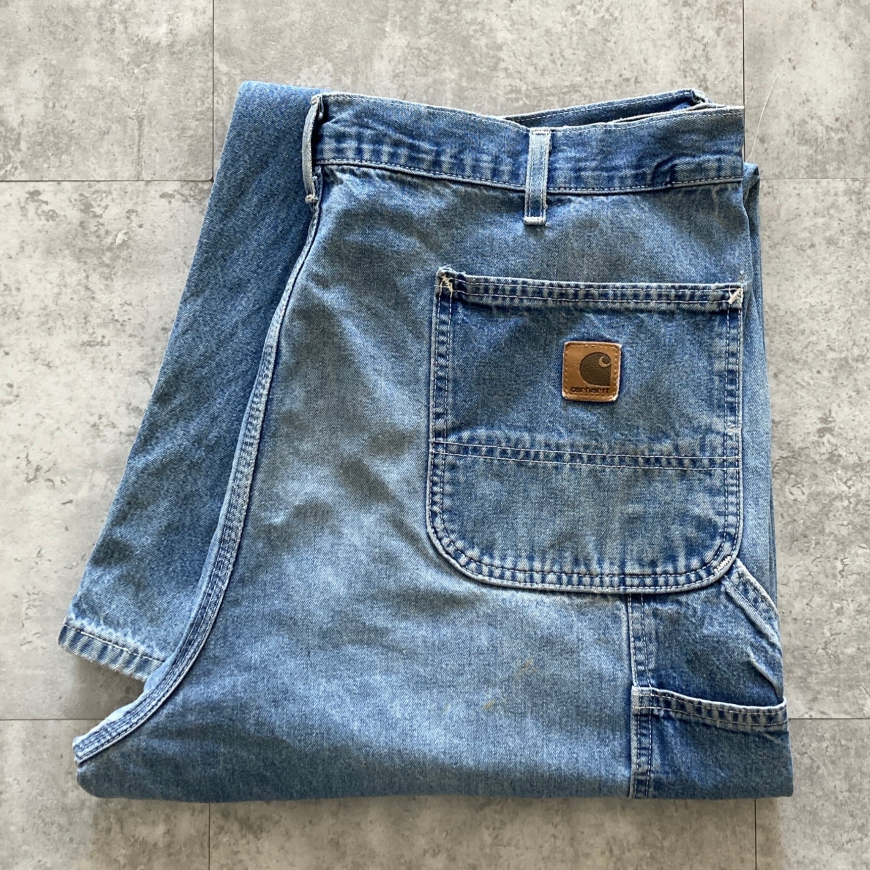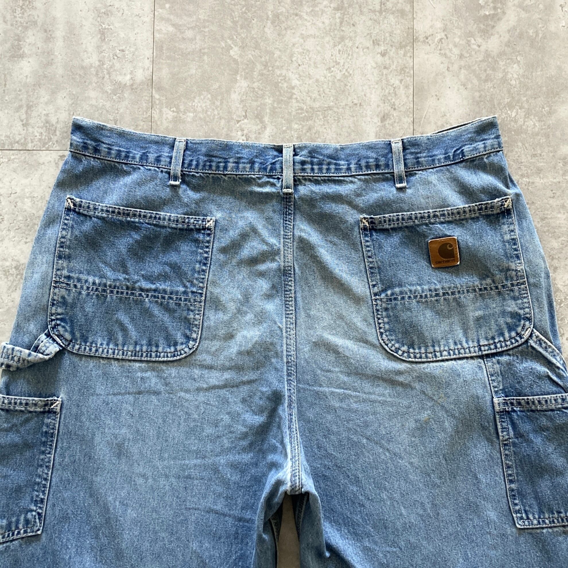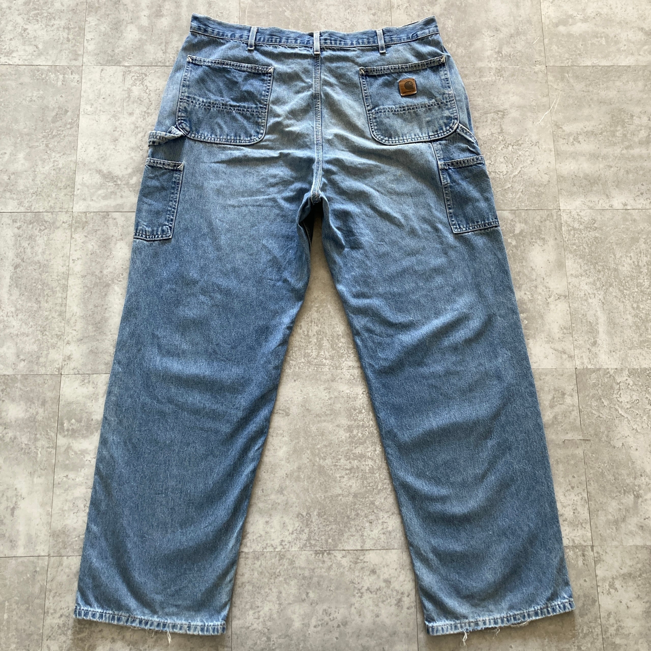 【40×32】carhartt カーハート ジッパーフライ ワンポイント レザーパッチ ビッグサイズ 縦落ち ヒゲ ペインターパンツ デニムパンツ