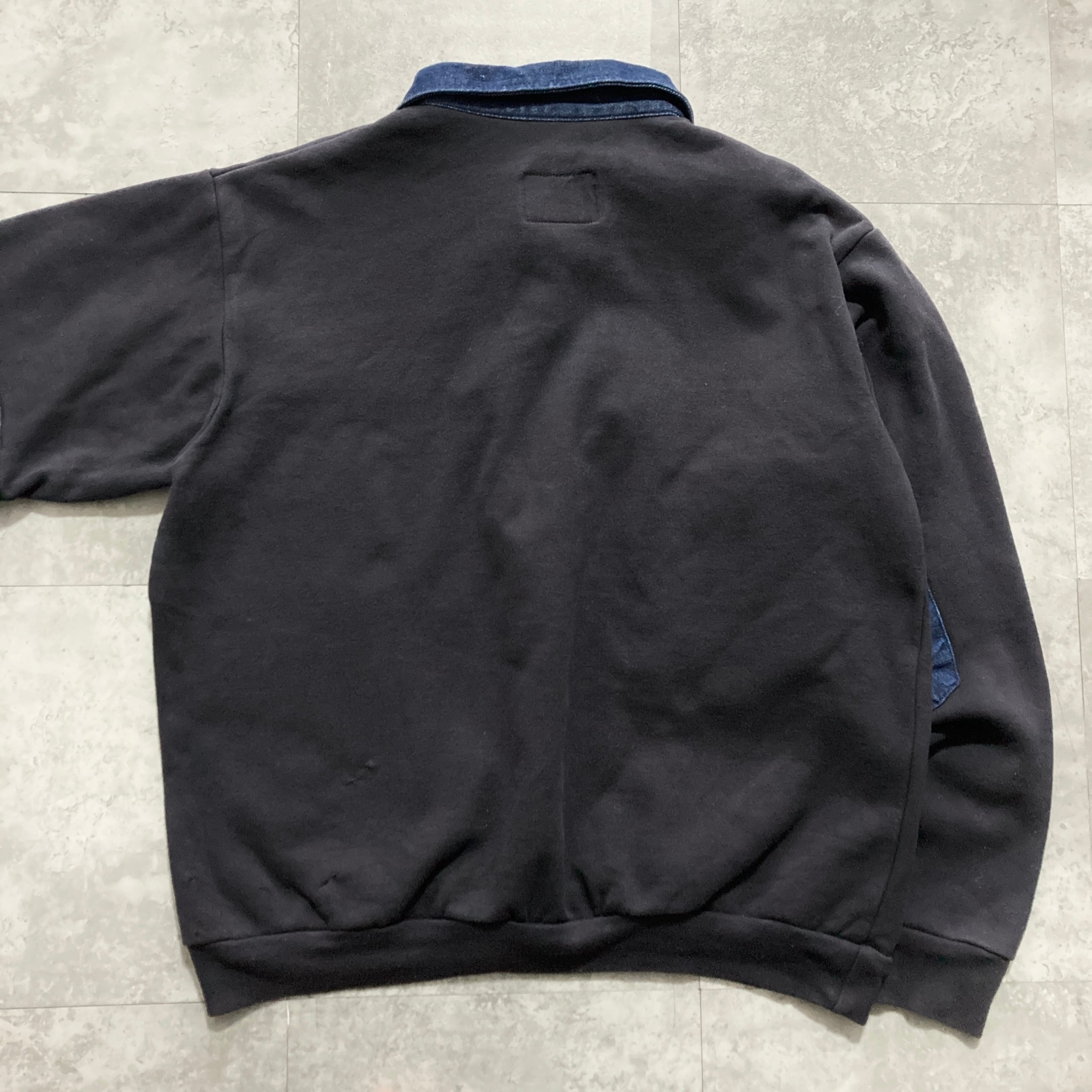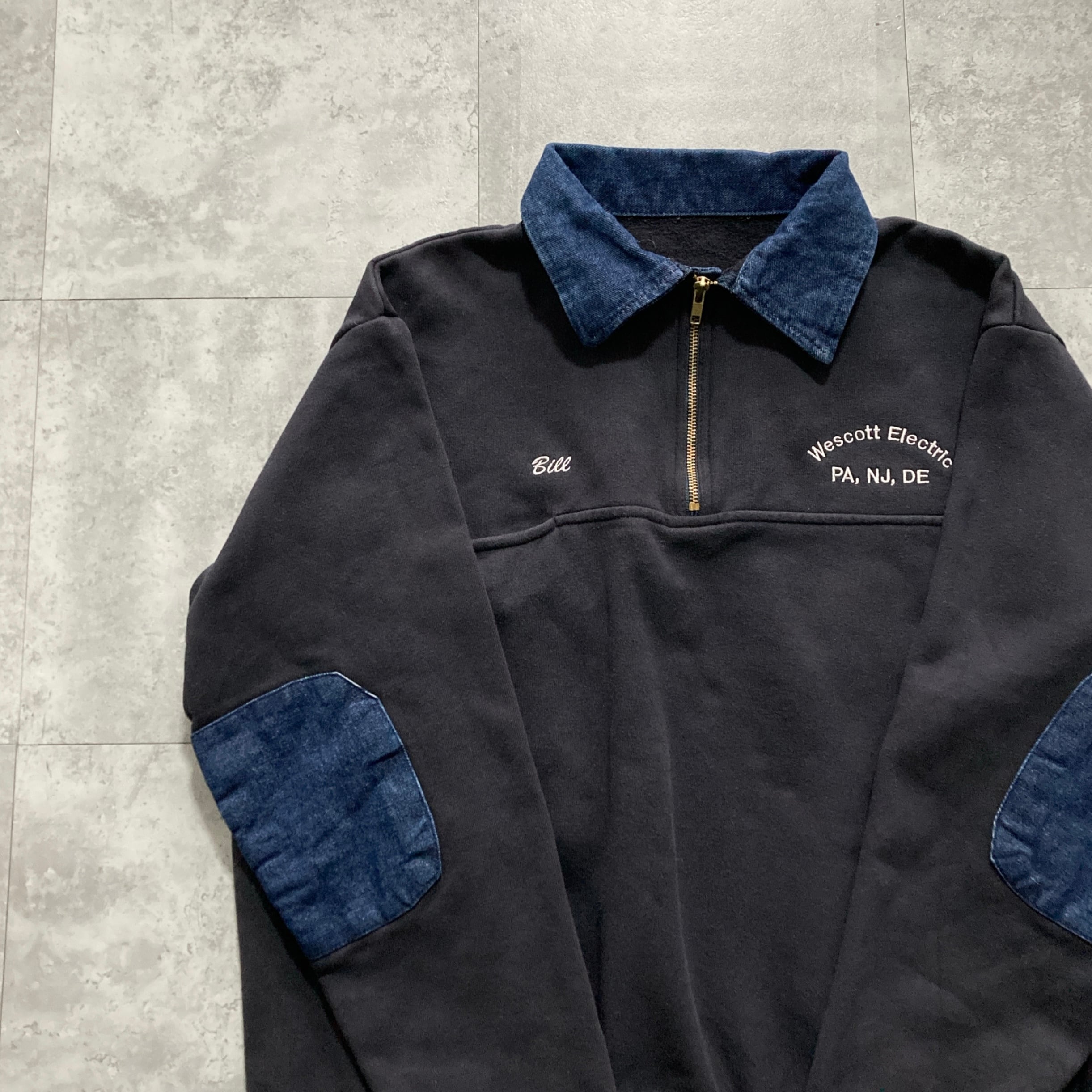 【USA製.企業物】90s GAME ハーフジップ 表記L 胸元刺繍 Wescott Electric Company アメリカ製 襟デニム エルボーパッチデニム スウェット | Only_Denim+