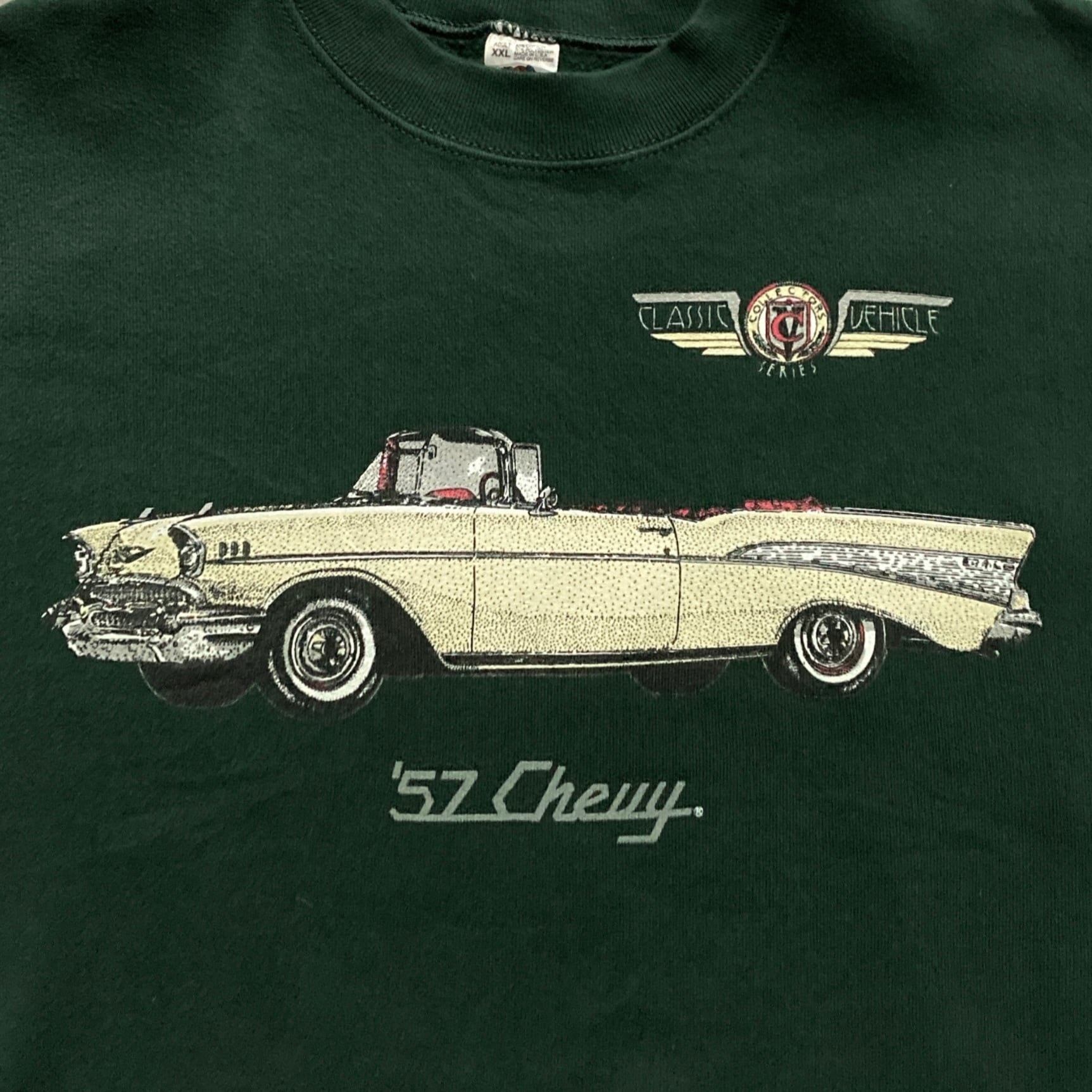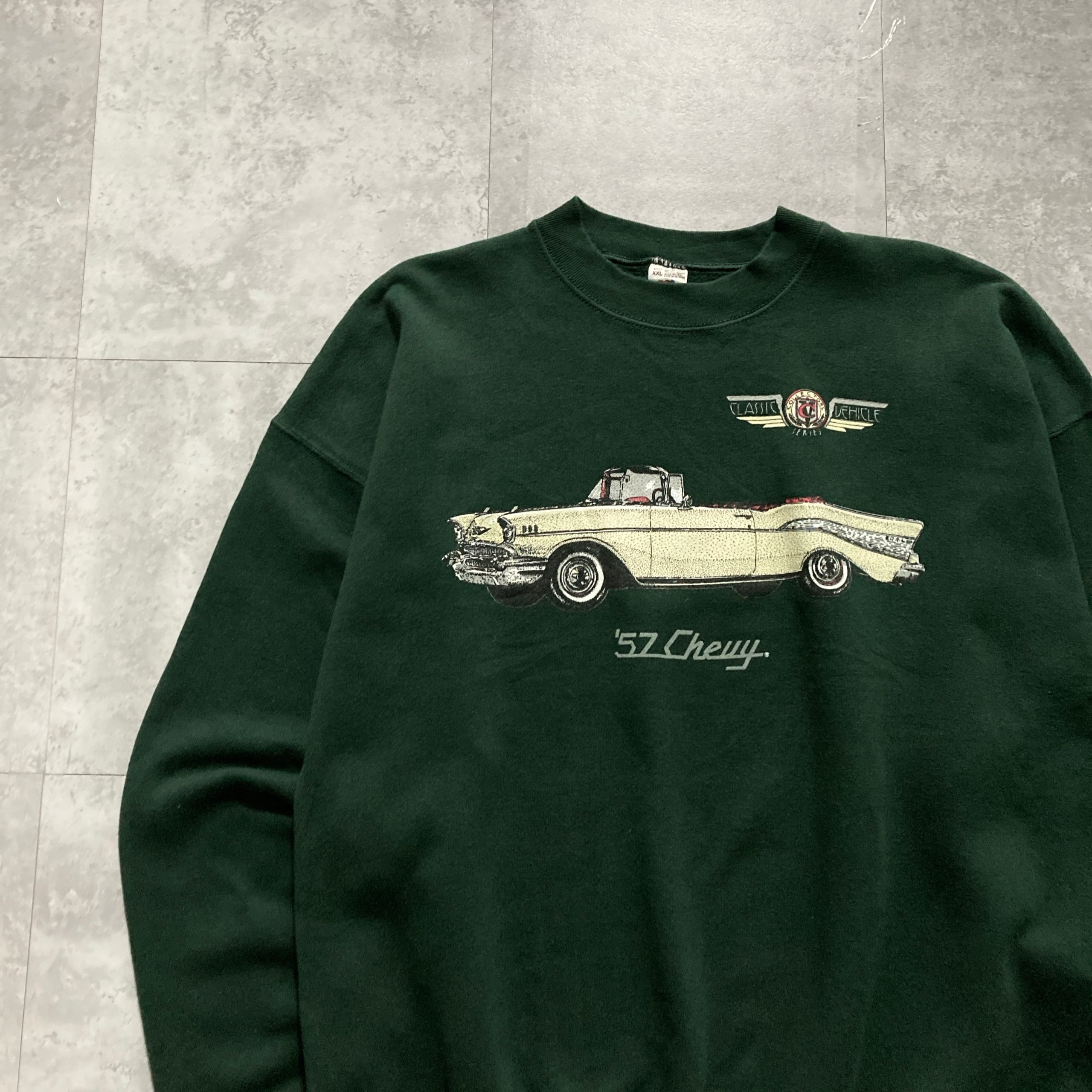 【USA製】90s FRUIT OF THE ROOM フルーツオブザルーム 表記XXL アメリカ製 CLASSIC COLLECTORS 57年型シボレーベルエア ダークグリーン スウェット | Only_Denim+