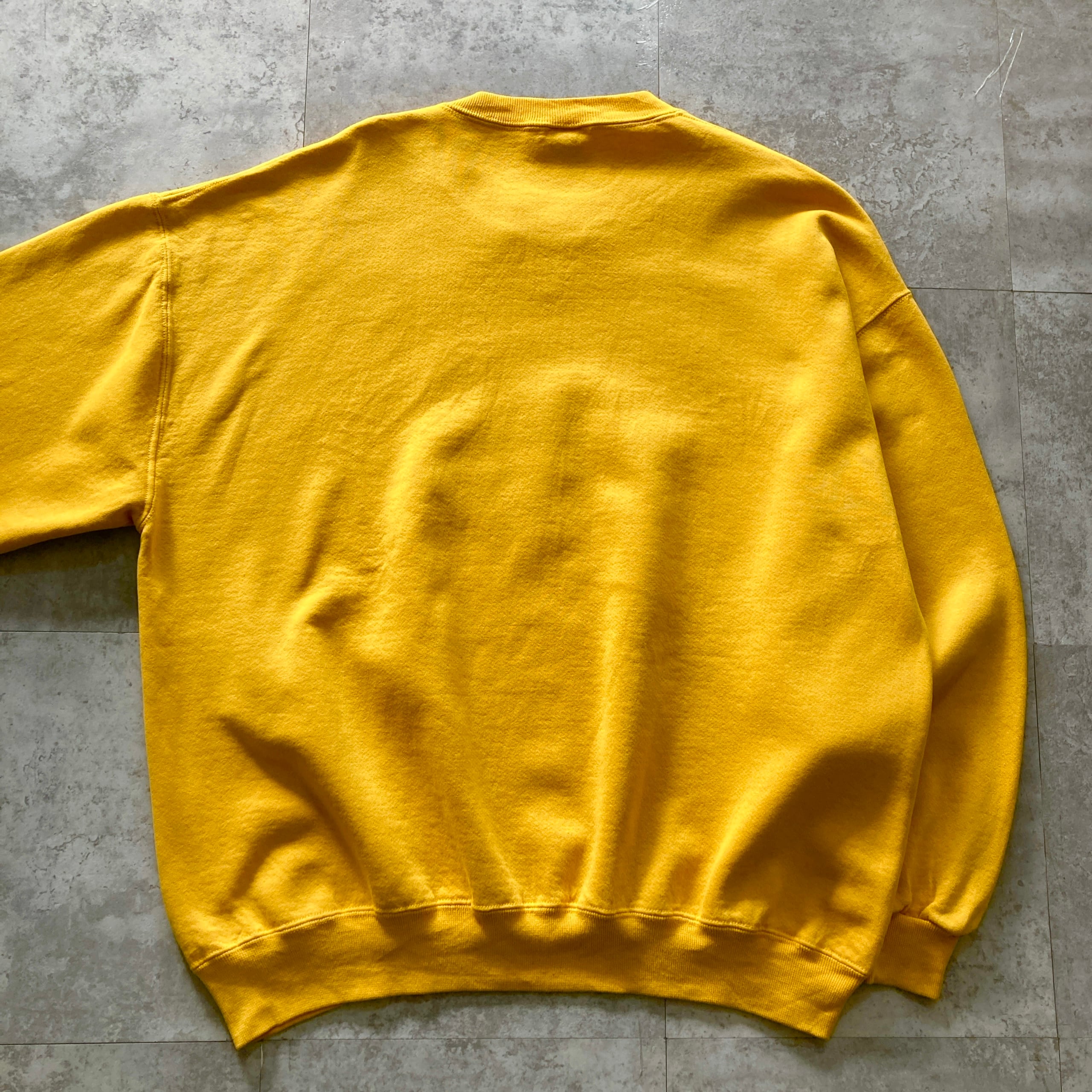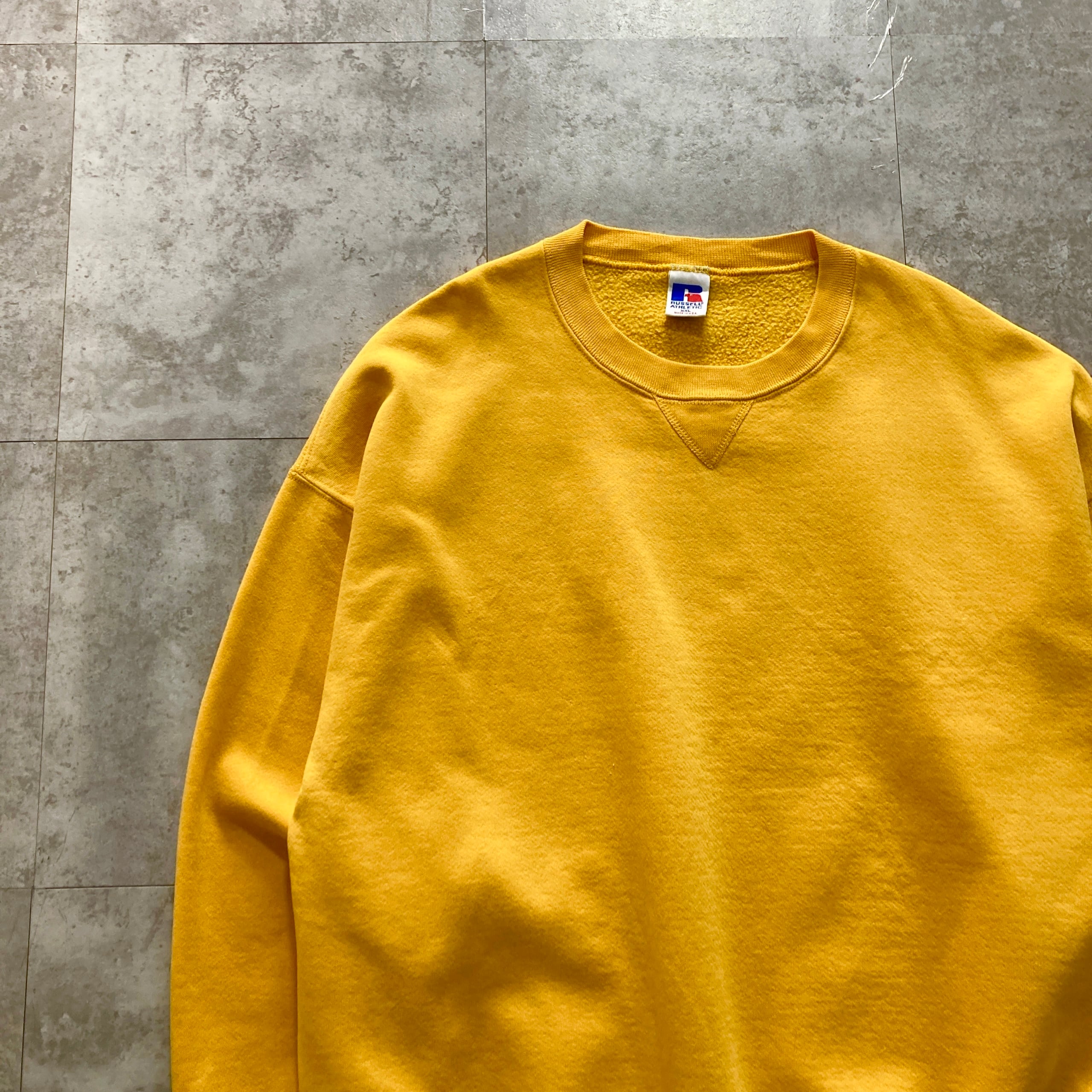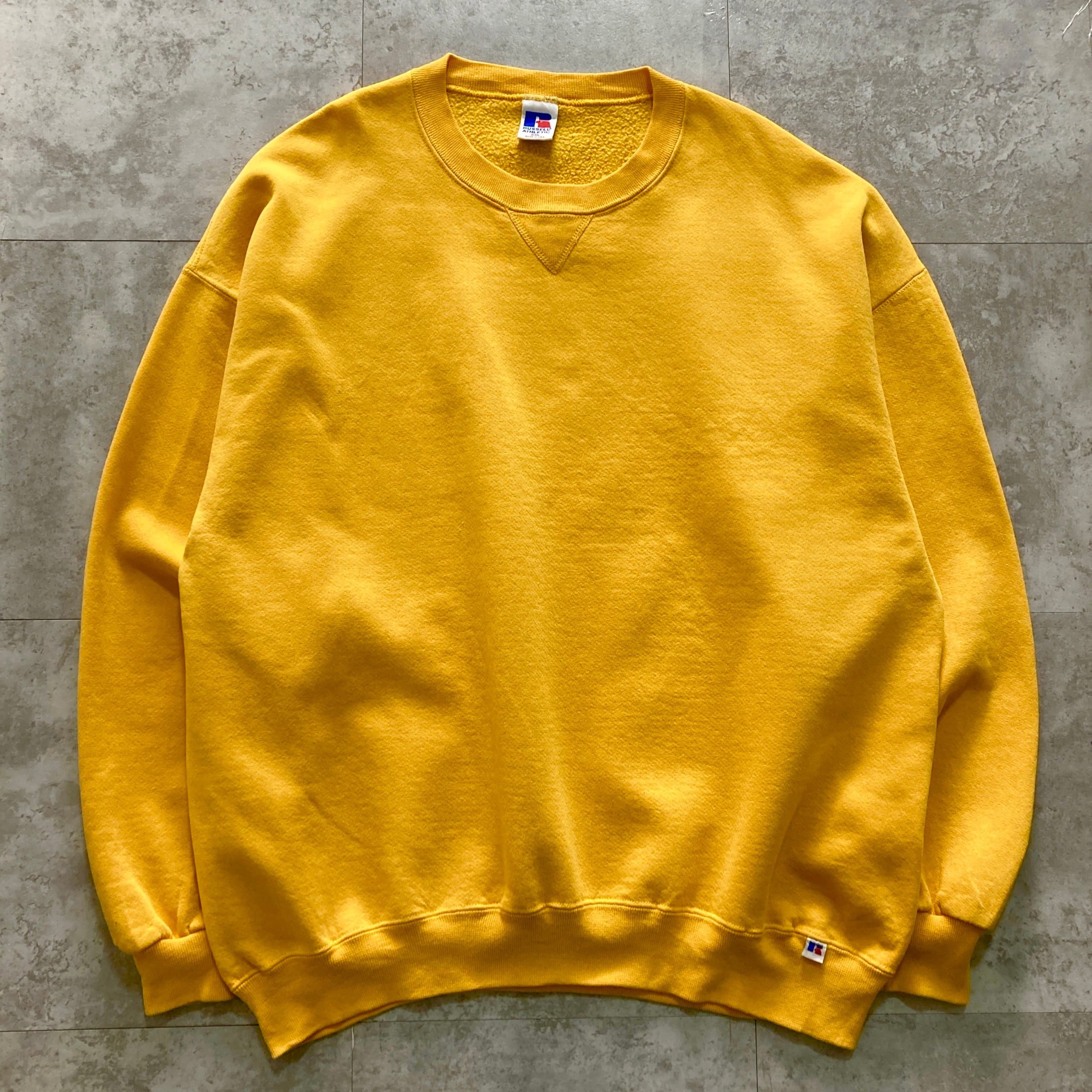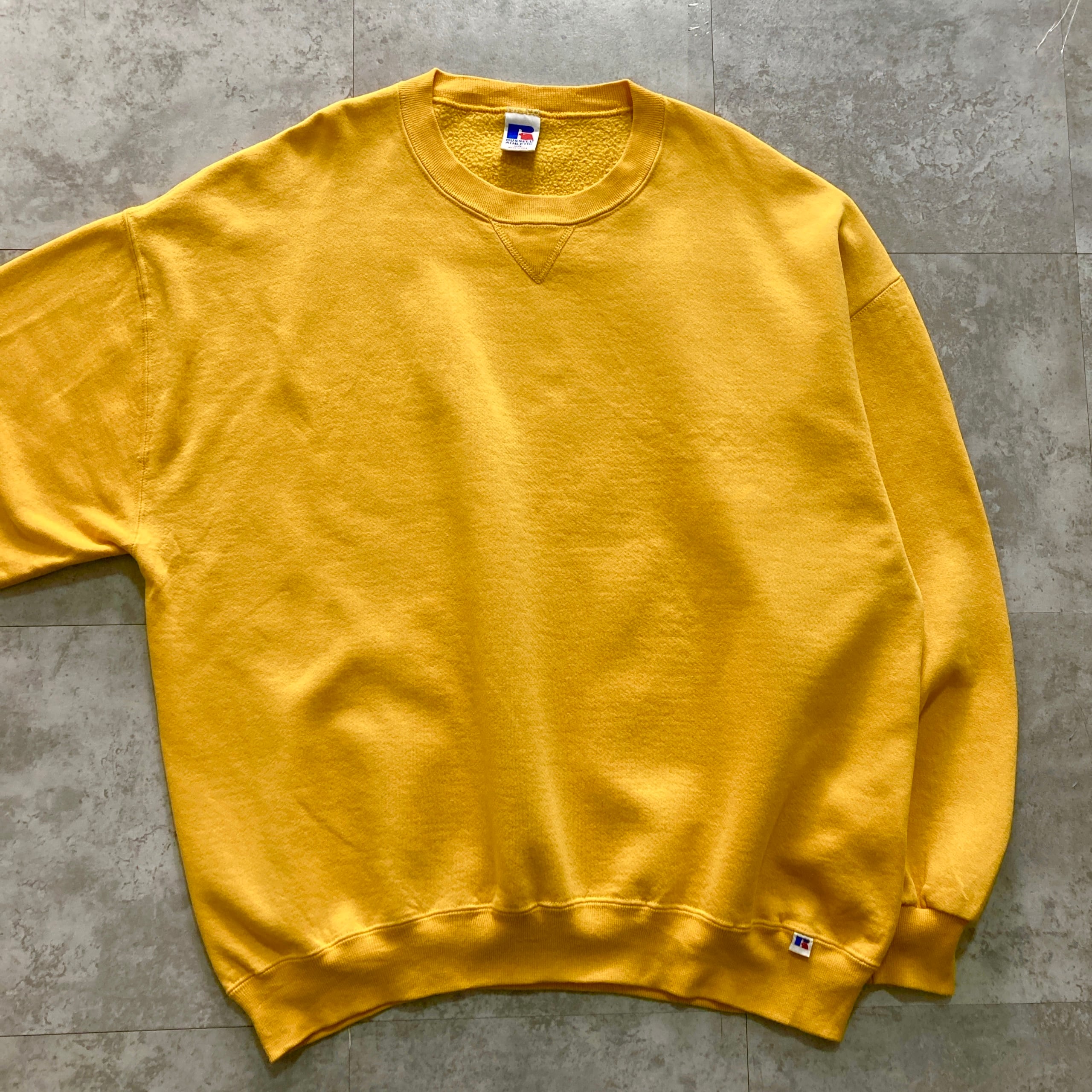 【USA製】90s RUSSELL ラッセル 表記XXL アメリカ製 前V イエロー 無地 スウェット
