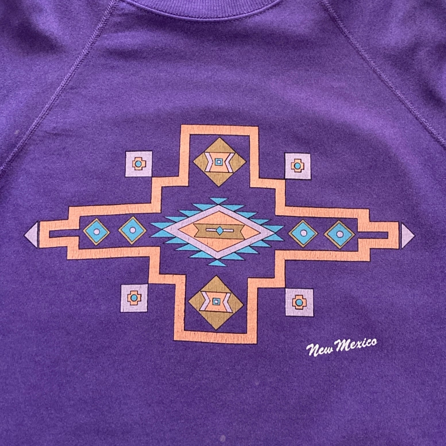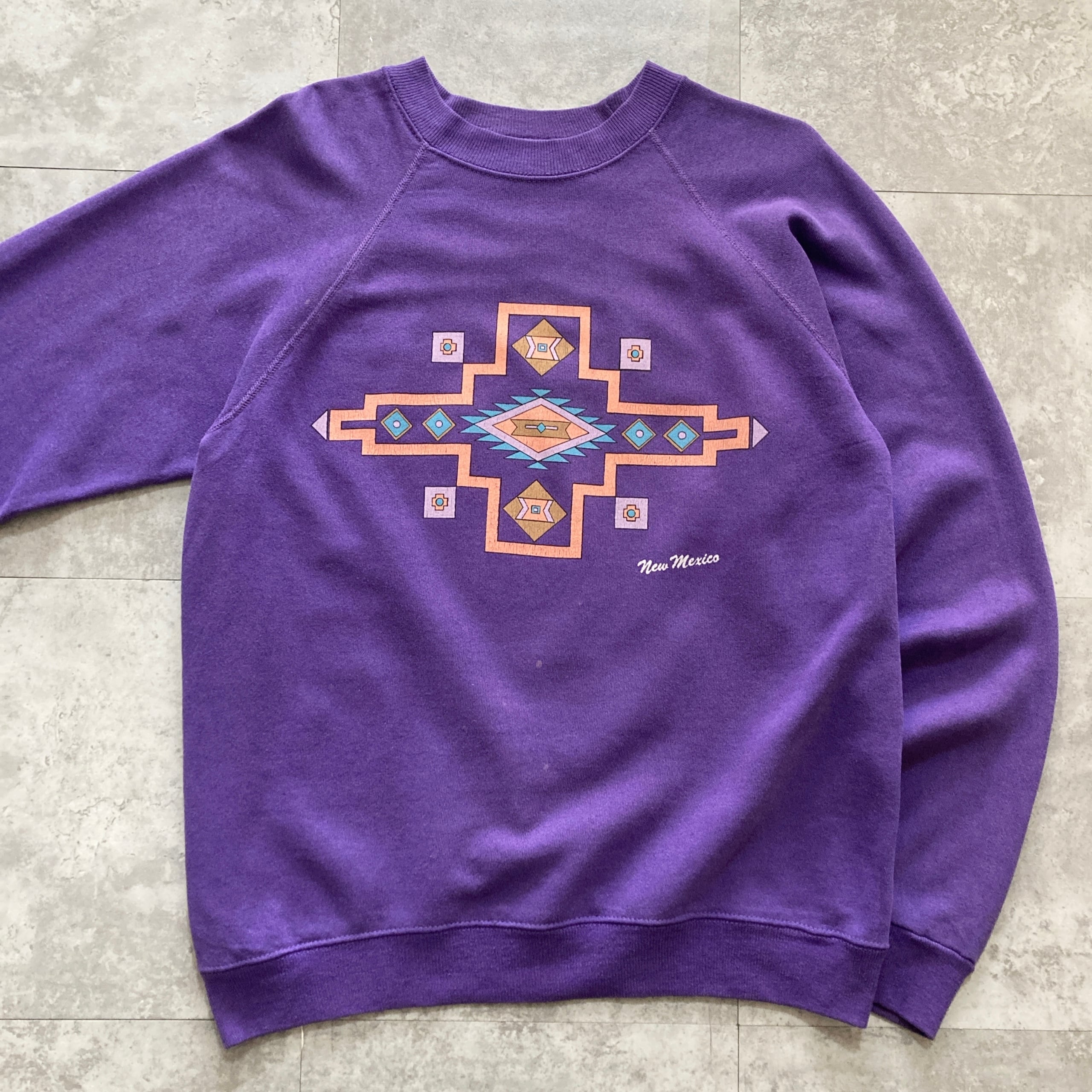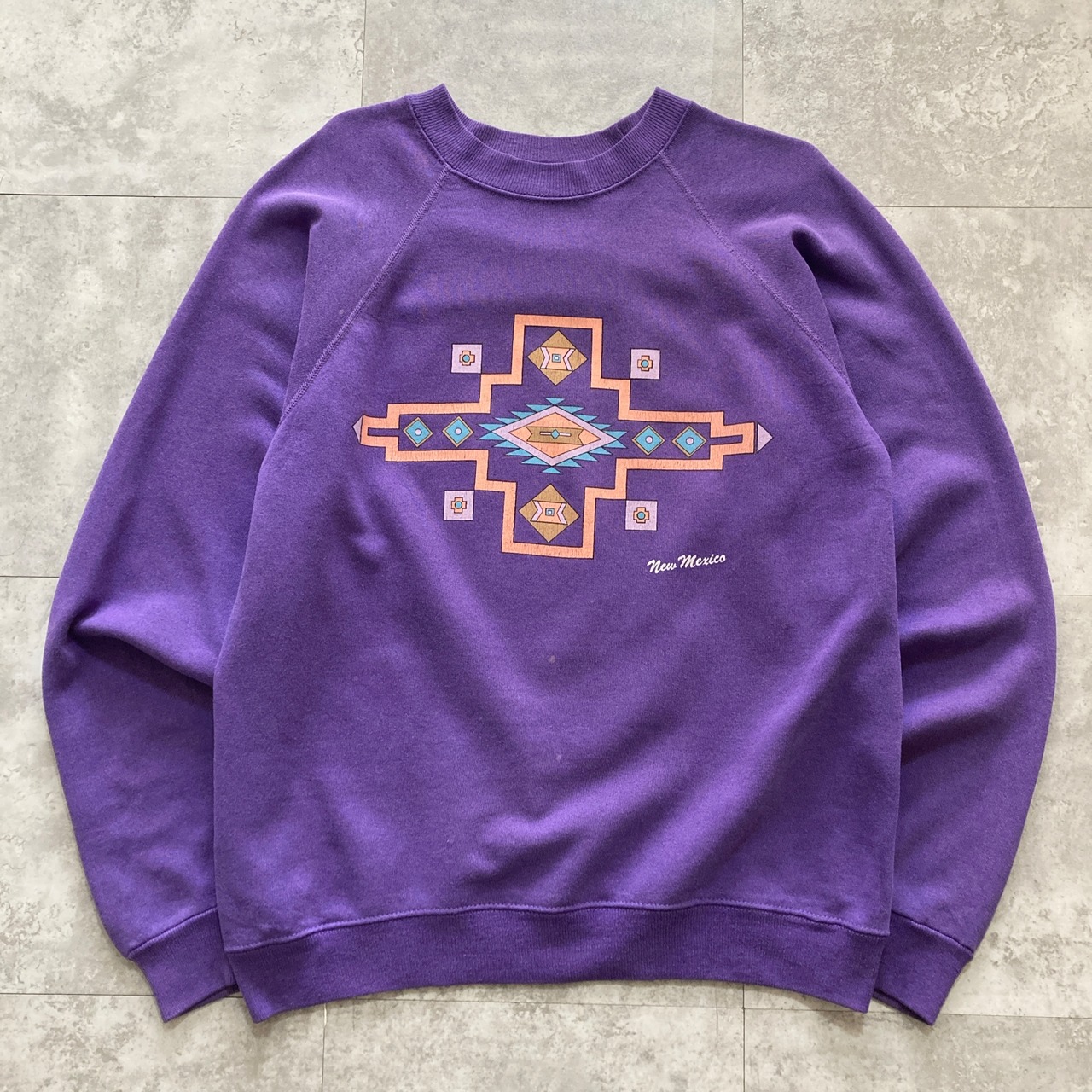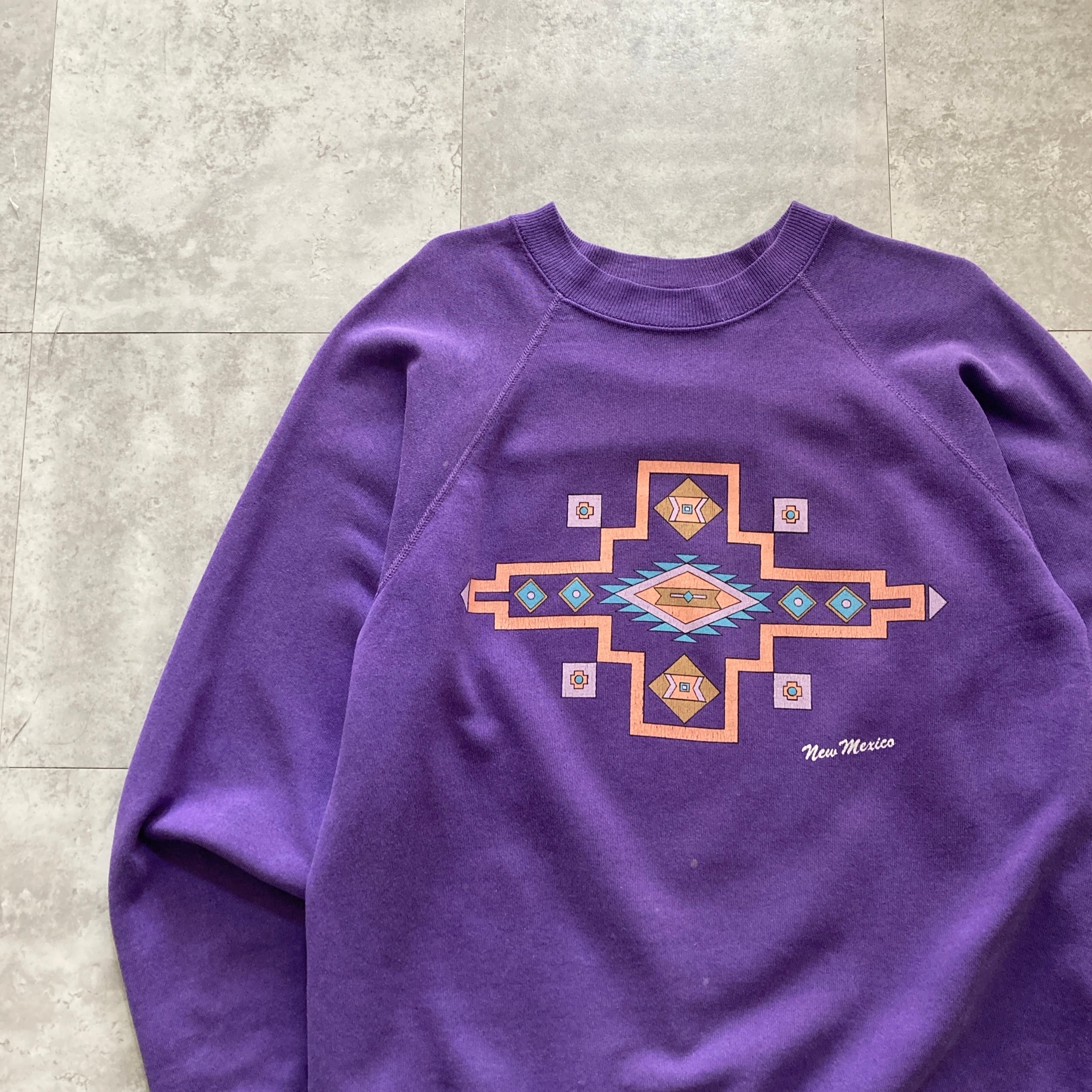 【USA製】80s Hanes ヘインズ 表記L アメリカ製 ビッグプリント ネイティブ オルテガ チマヨ パープル ラグラン スウェット