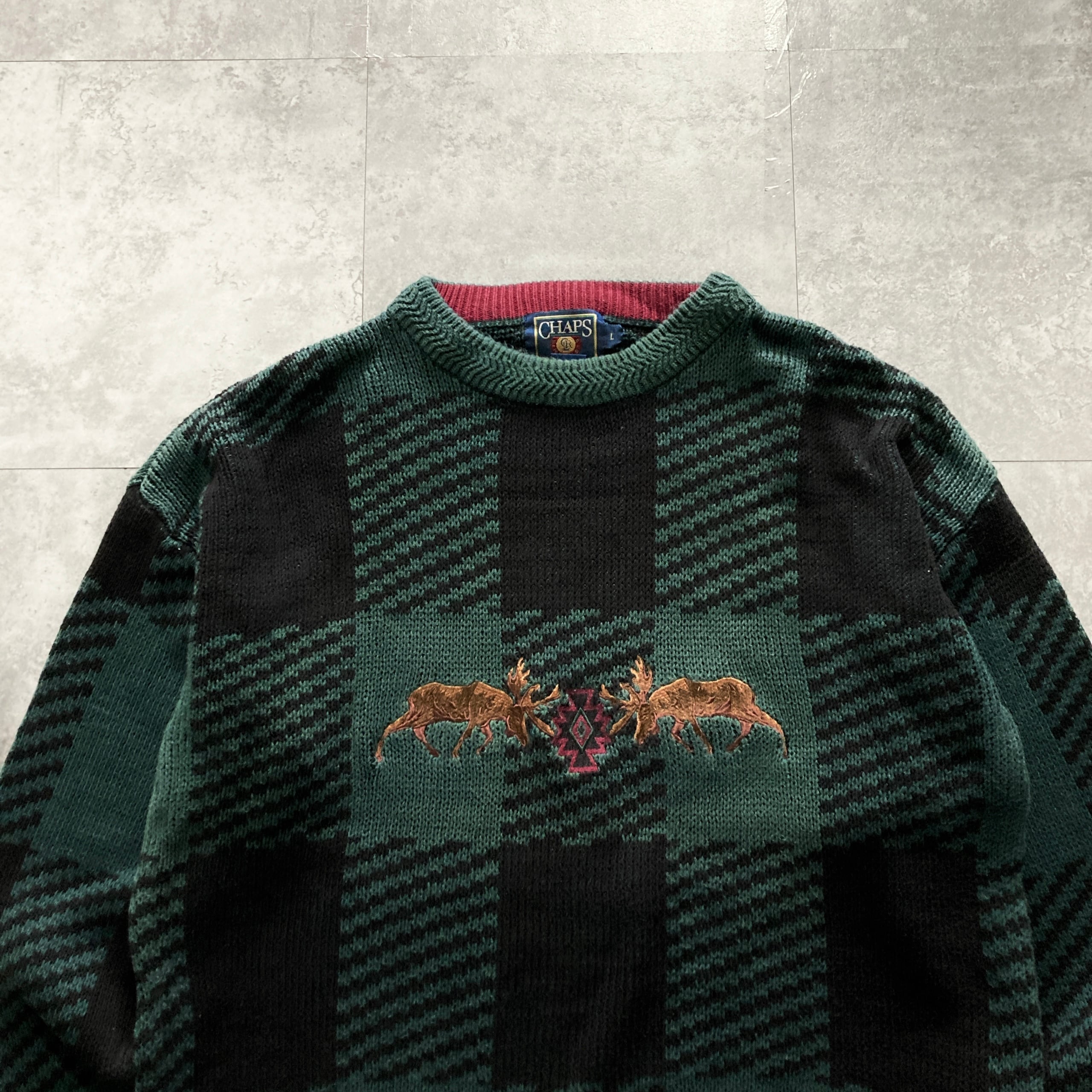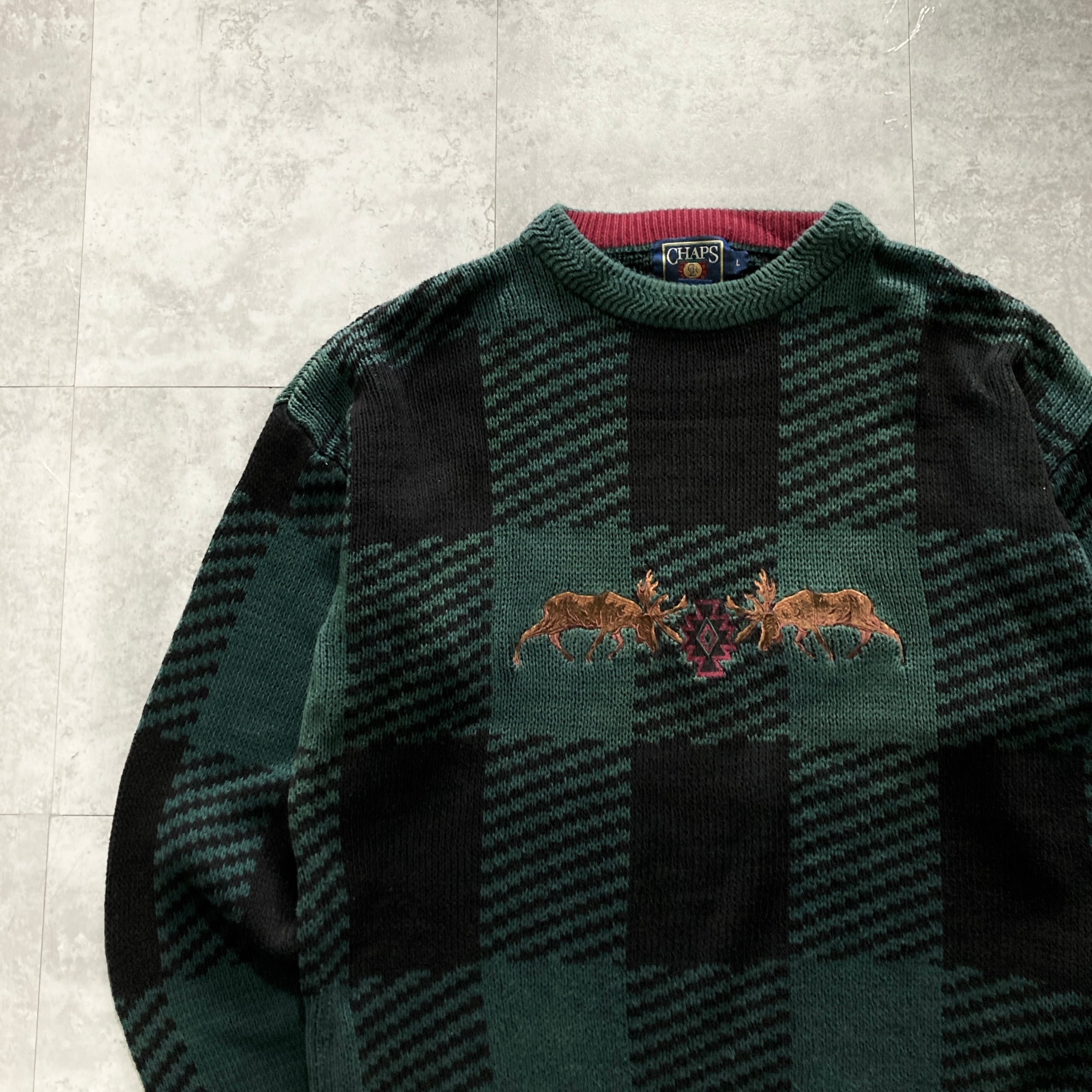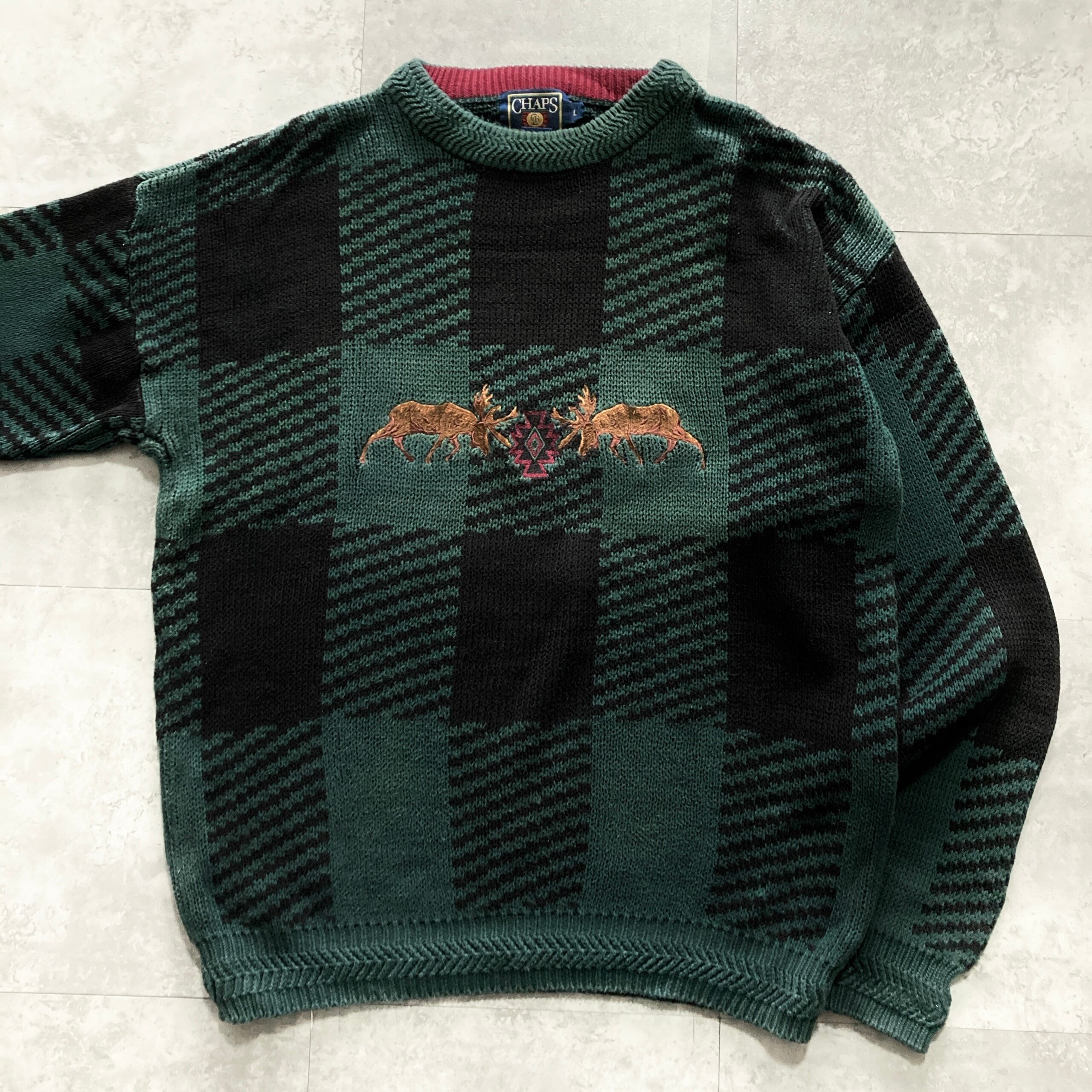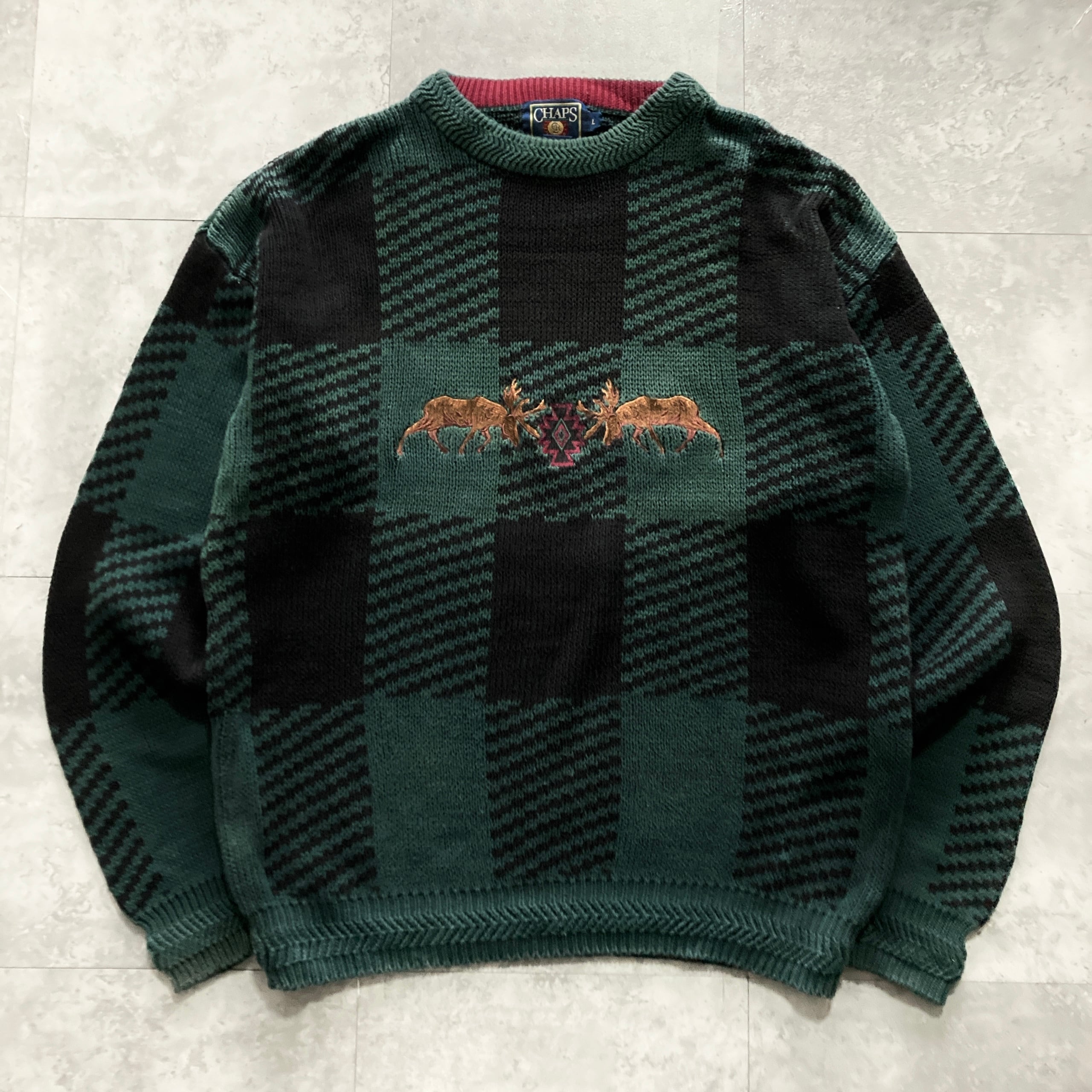 【80s】CHAPS RALPH LAUREN チャップスラルフローレン 表記L センター刺繍 トナカイ ノルディック柄 チェック柄 肉厚 コットン ニット/セーター