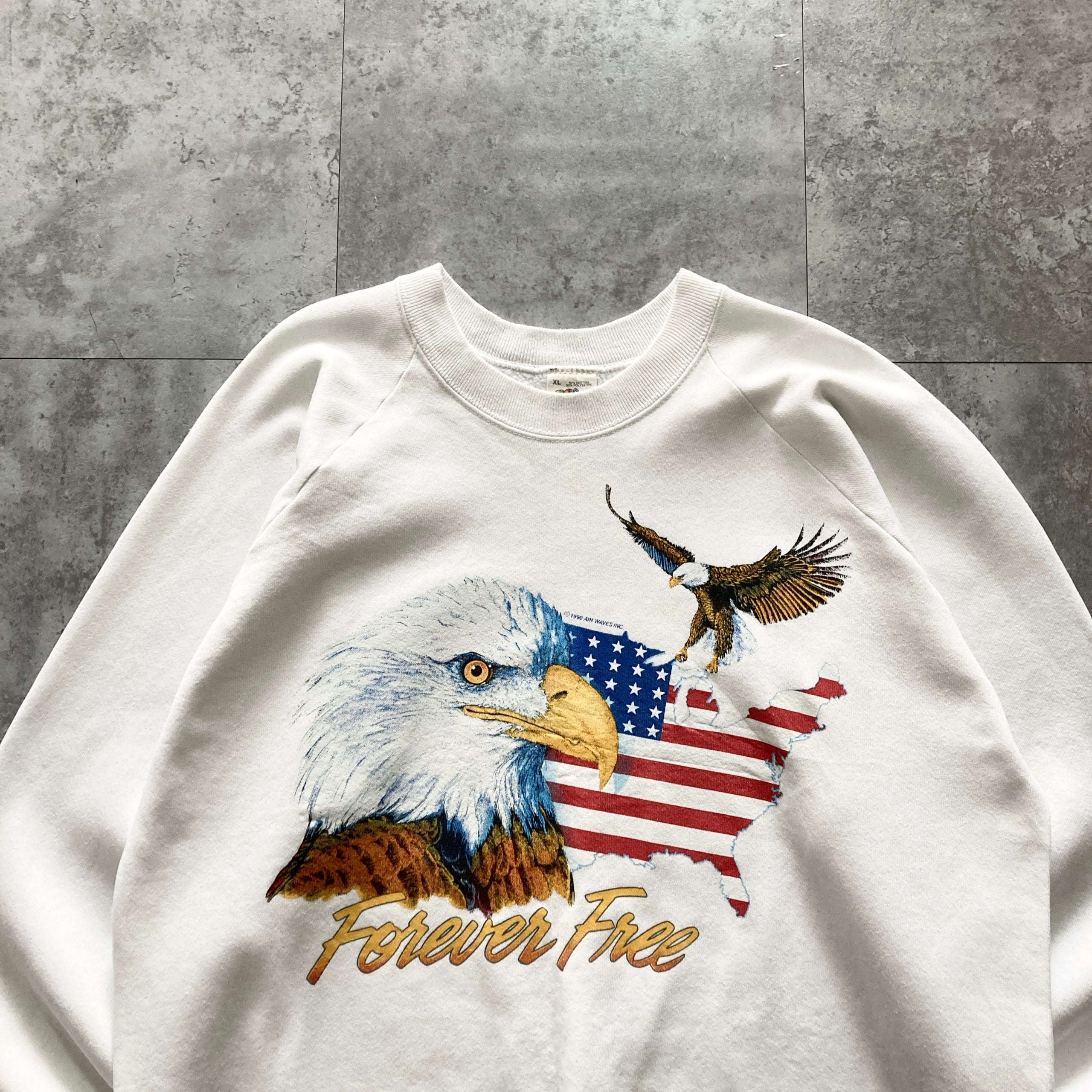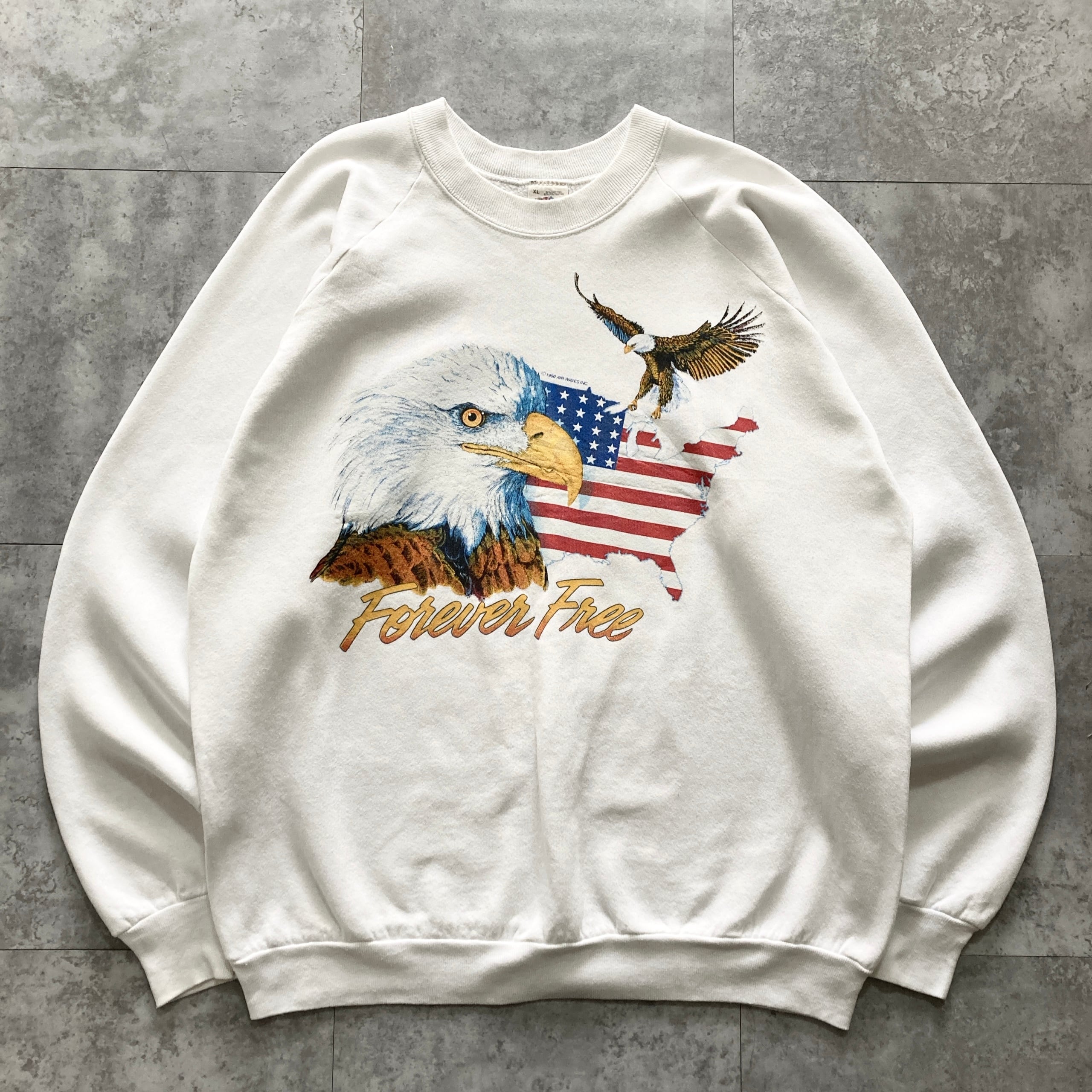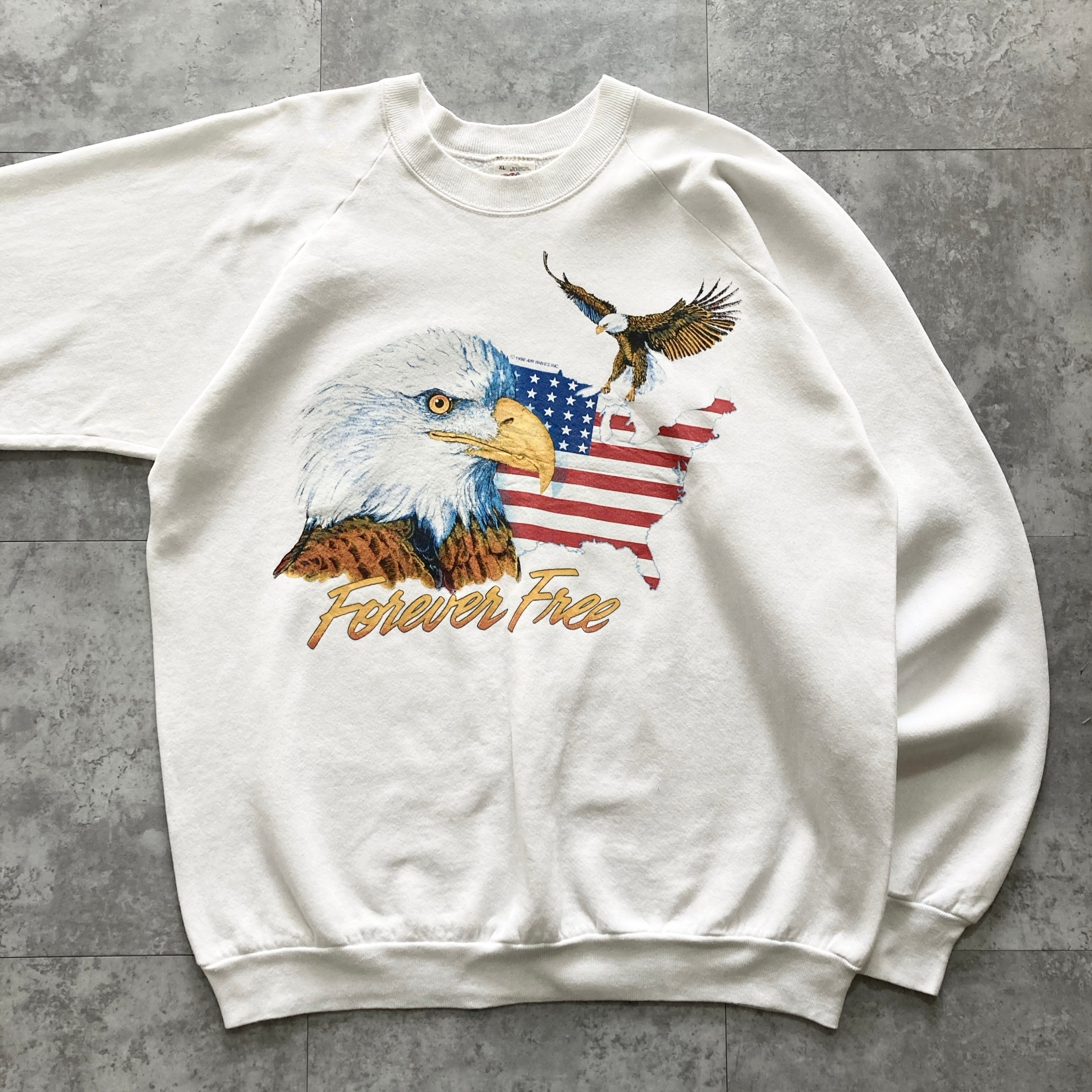 【USA製】90s FRUIT OF THE ROOM フルーツオブザルーム 表記XL アメリカ製 コピーライト1990年 Forever Free AIR WAVES INC. エアウェーブス社 星条旗 イーグル 鷹 鷲 ホワイト スウェット | Only_Denim+
