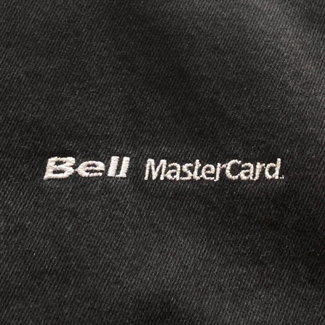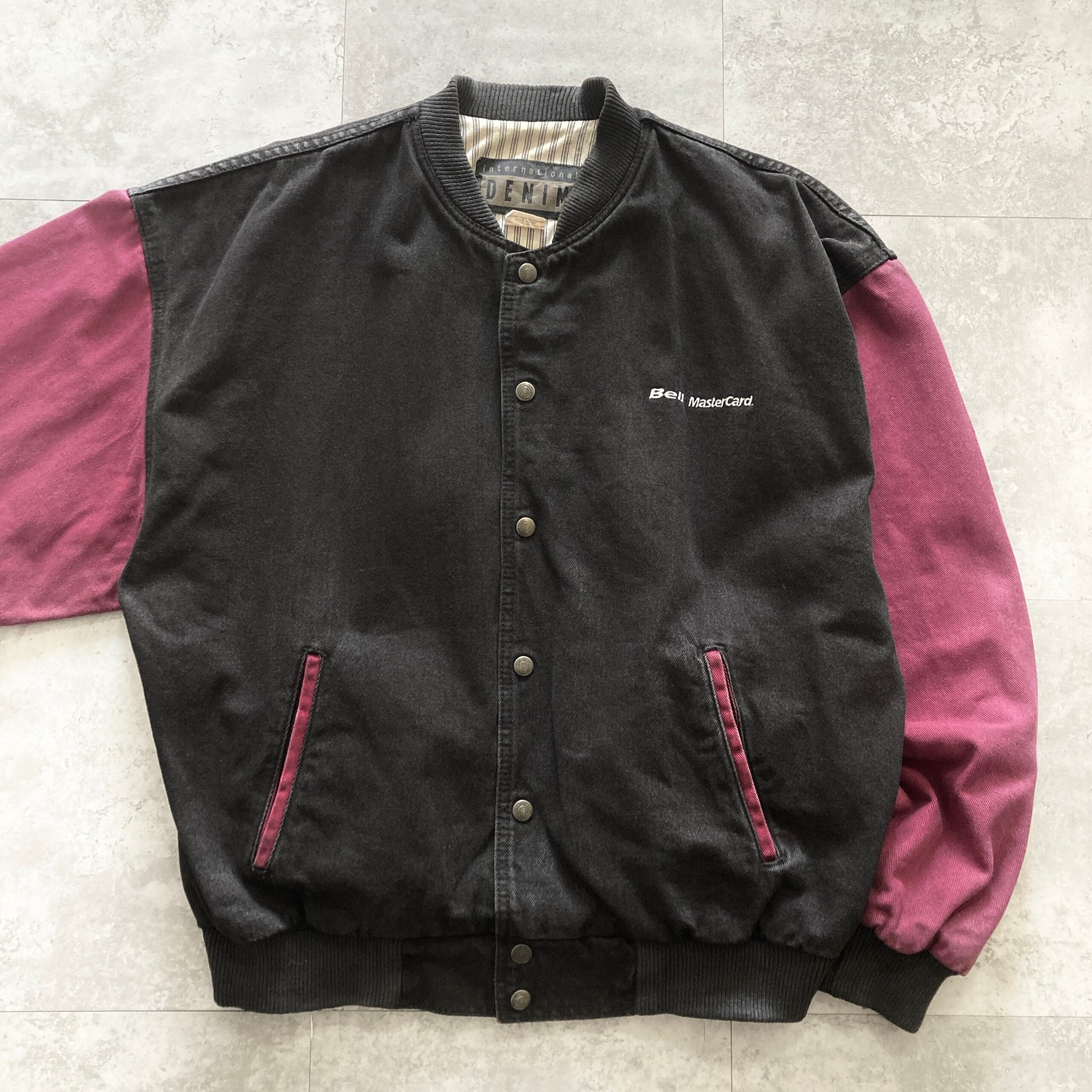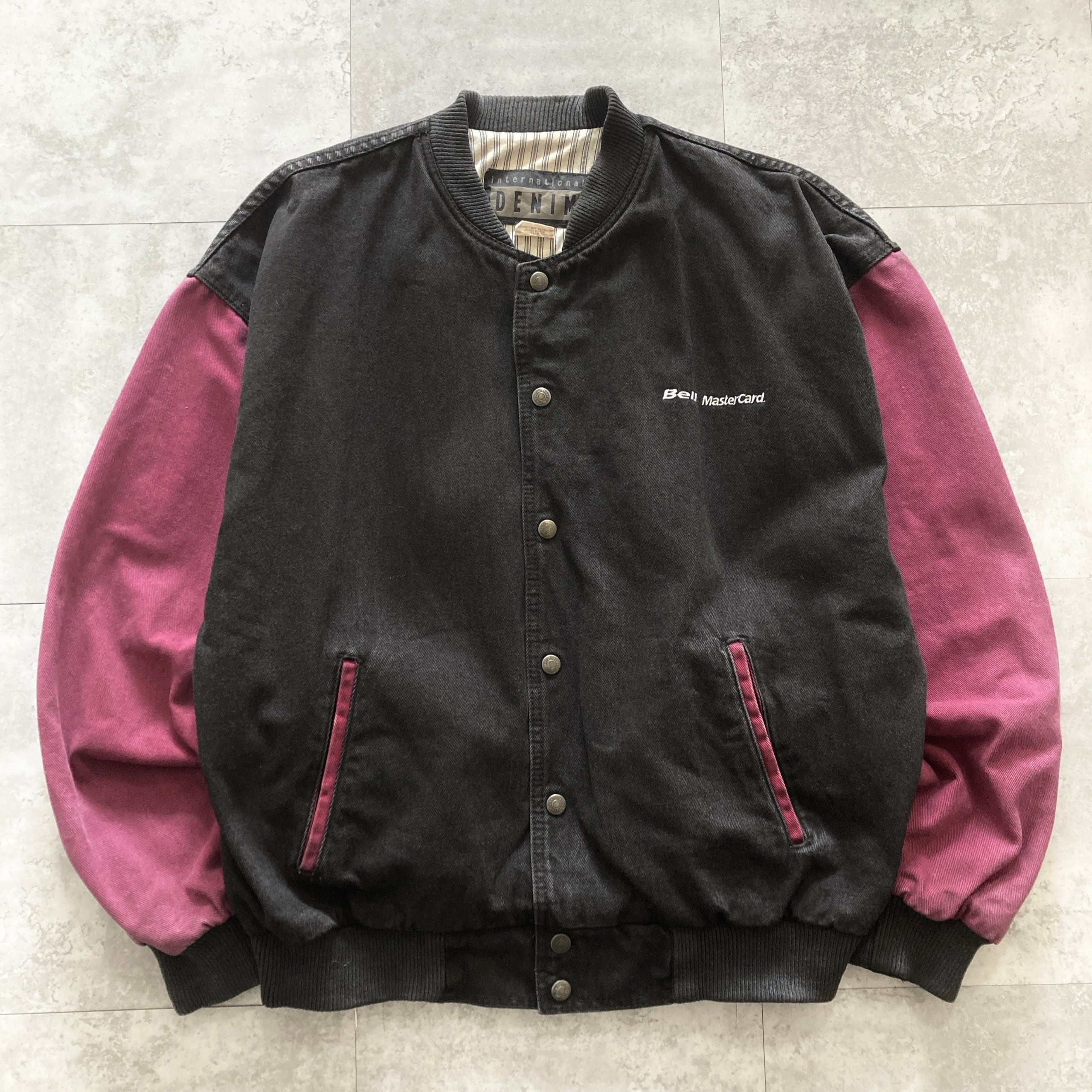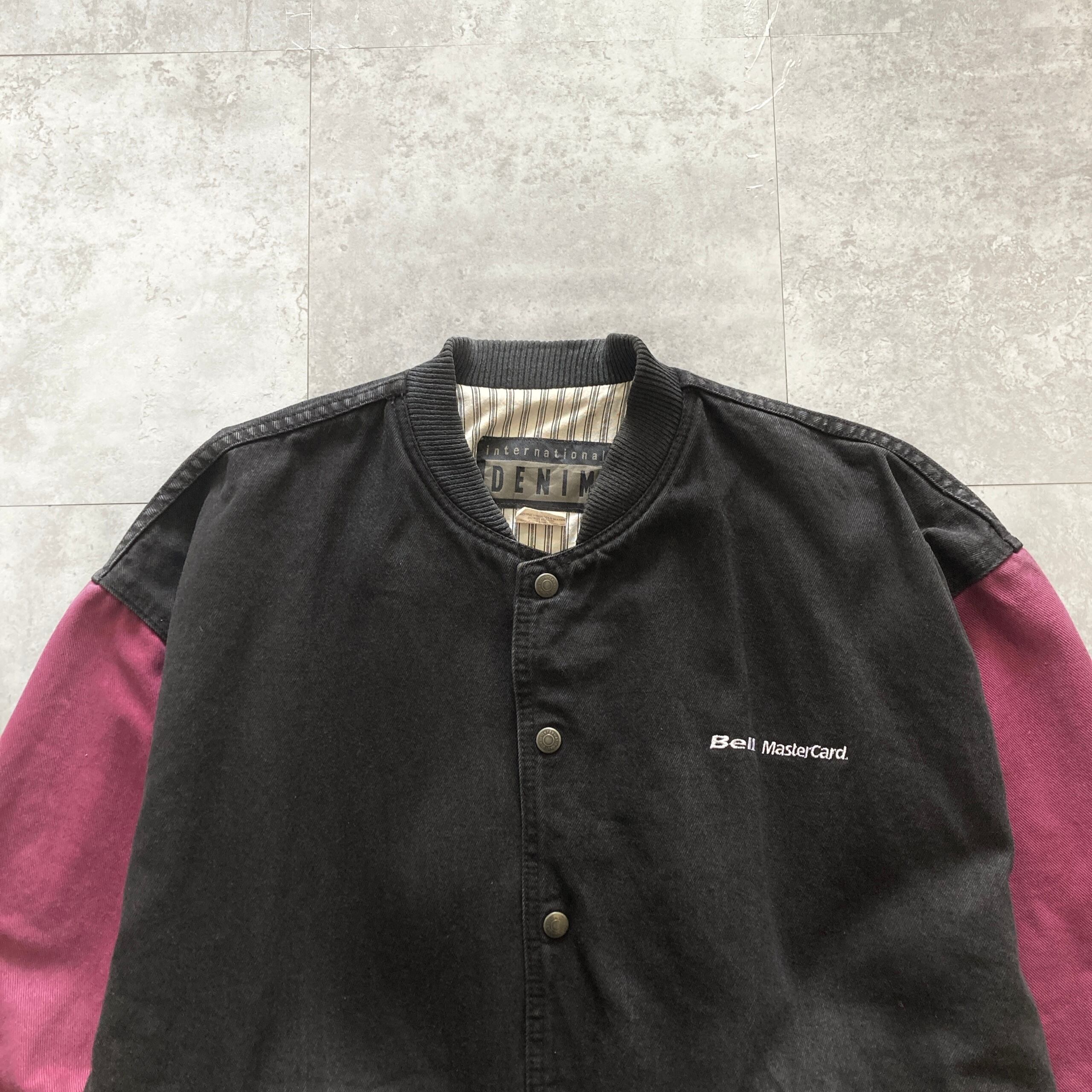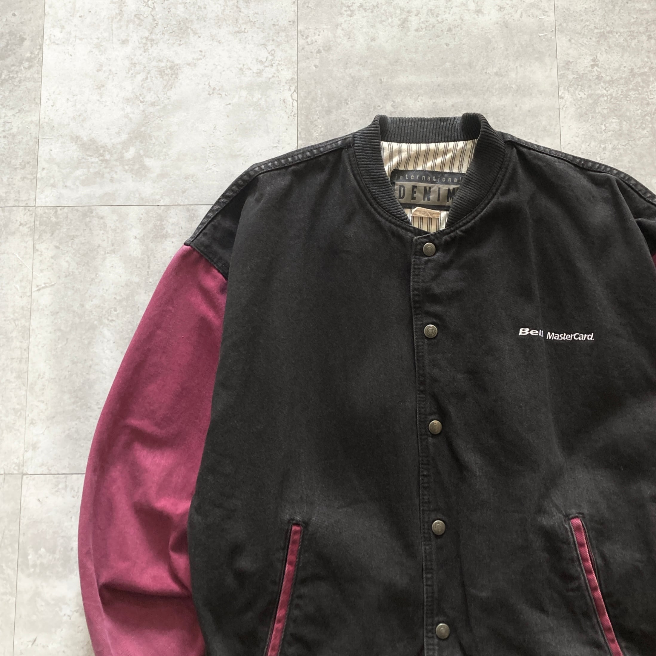【90s】企業物 international DENIM 表記L MasterCard ロゴ刺繍 スナップボタン 裏地ストライプ柄 ツートンカラー デニムジャケット デニムスタジャン | Only_Denim+