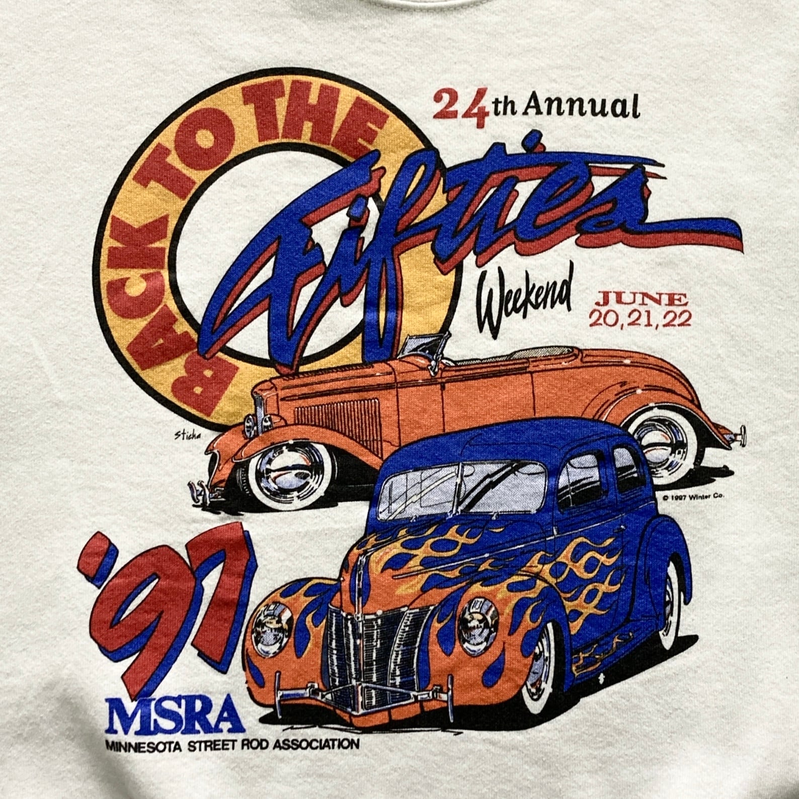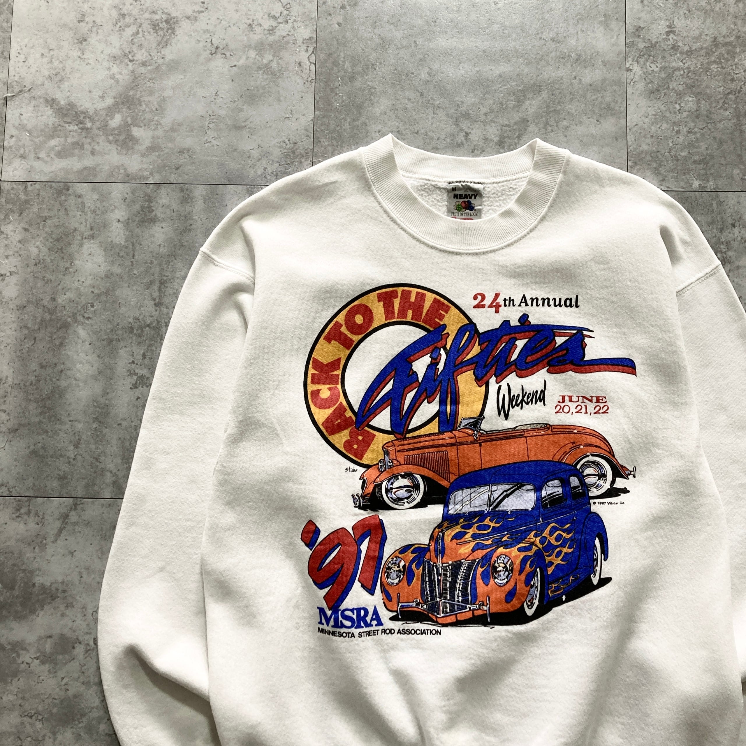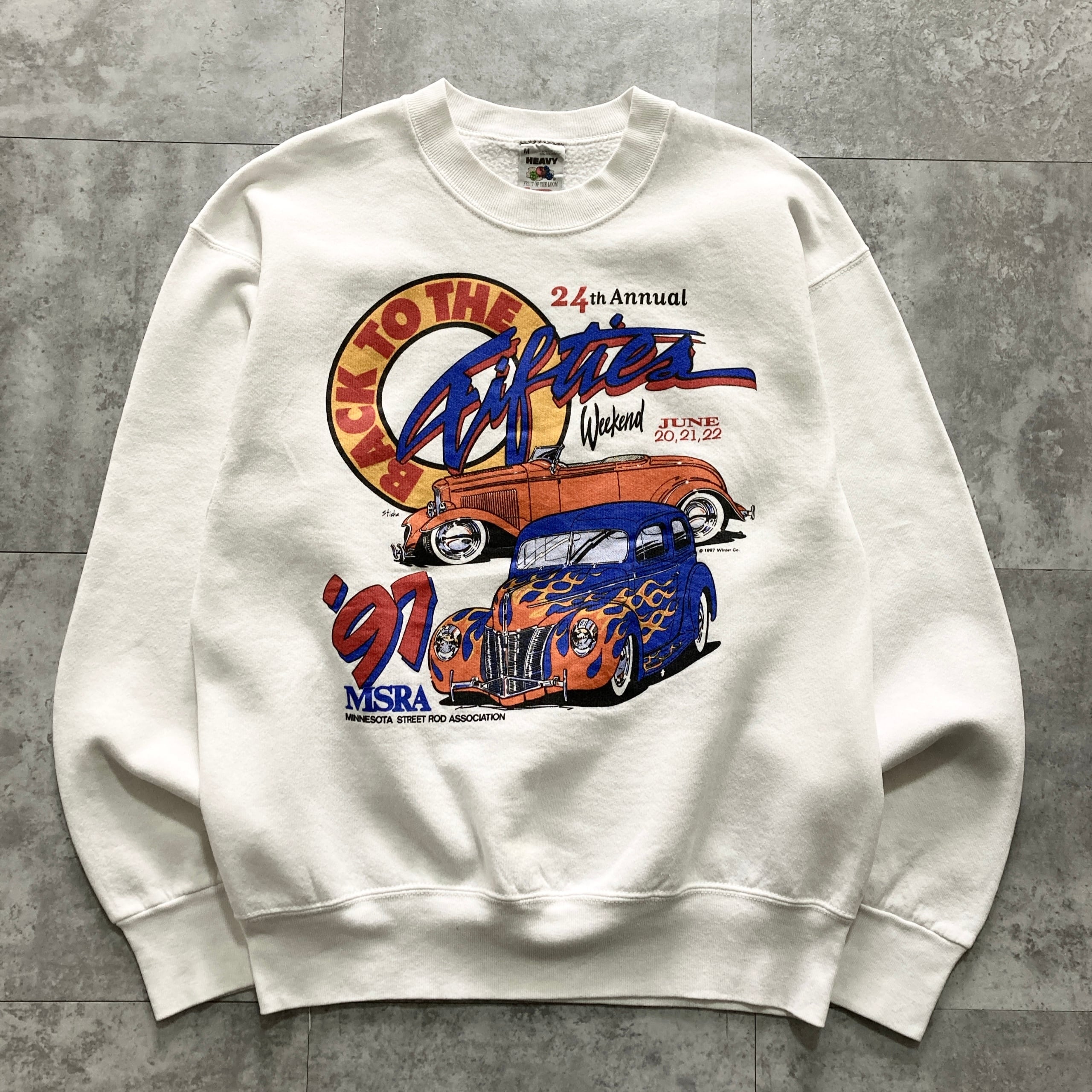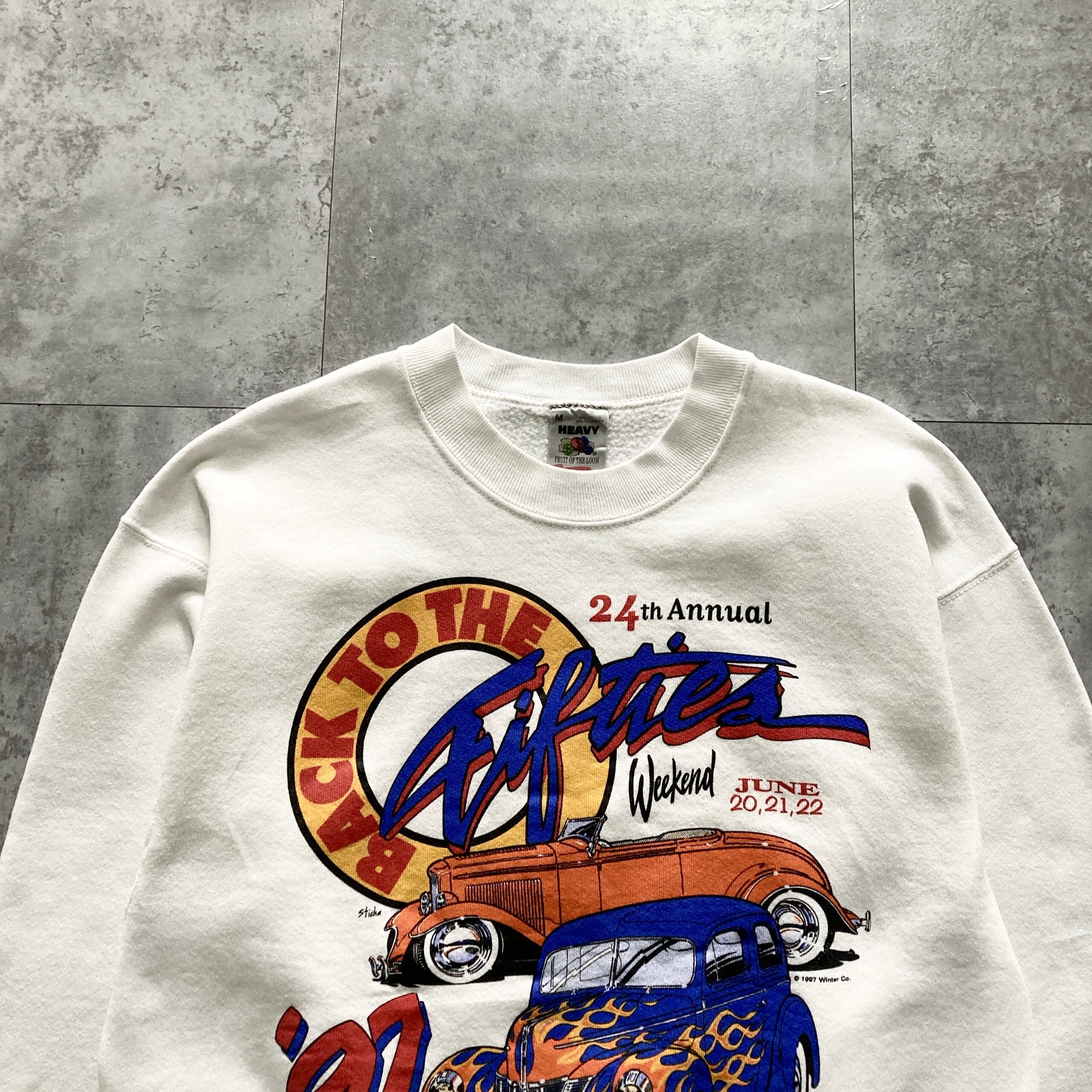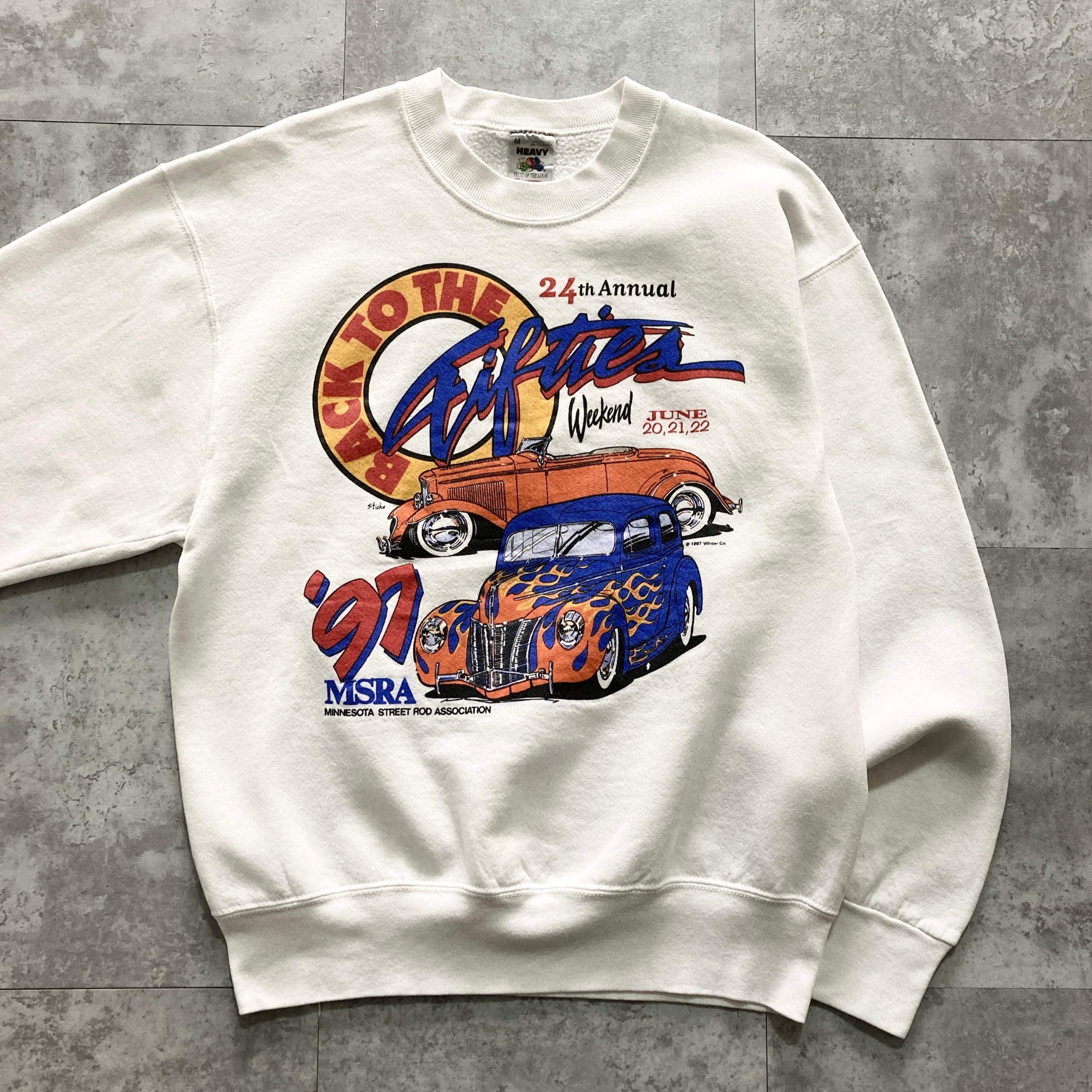 【USA製】90s FRUIT OF THE ROOM フルーツオブザルーム 表記M アメリカ製 コピーライト1997年 クラシックカー ホットロッド MSRA ミネソタストリートロッド協会 Back to the Fifties Weekend ホワイト スウェット | Only_Denim+