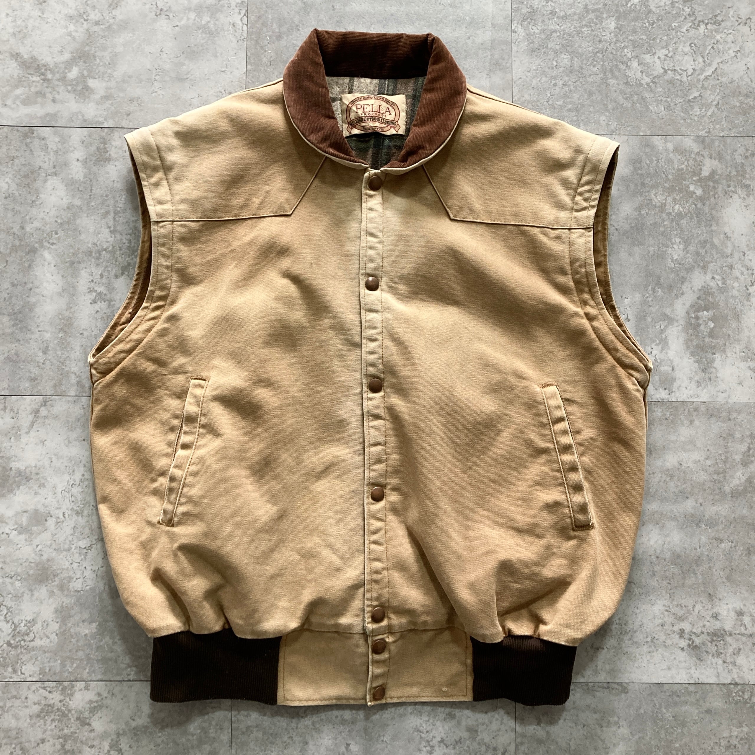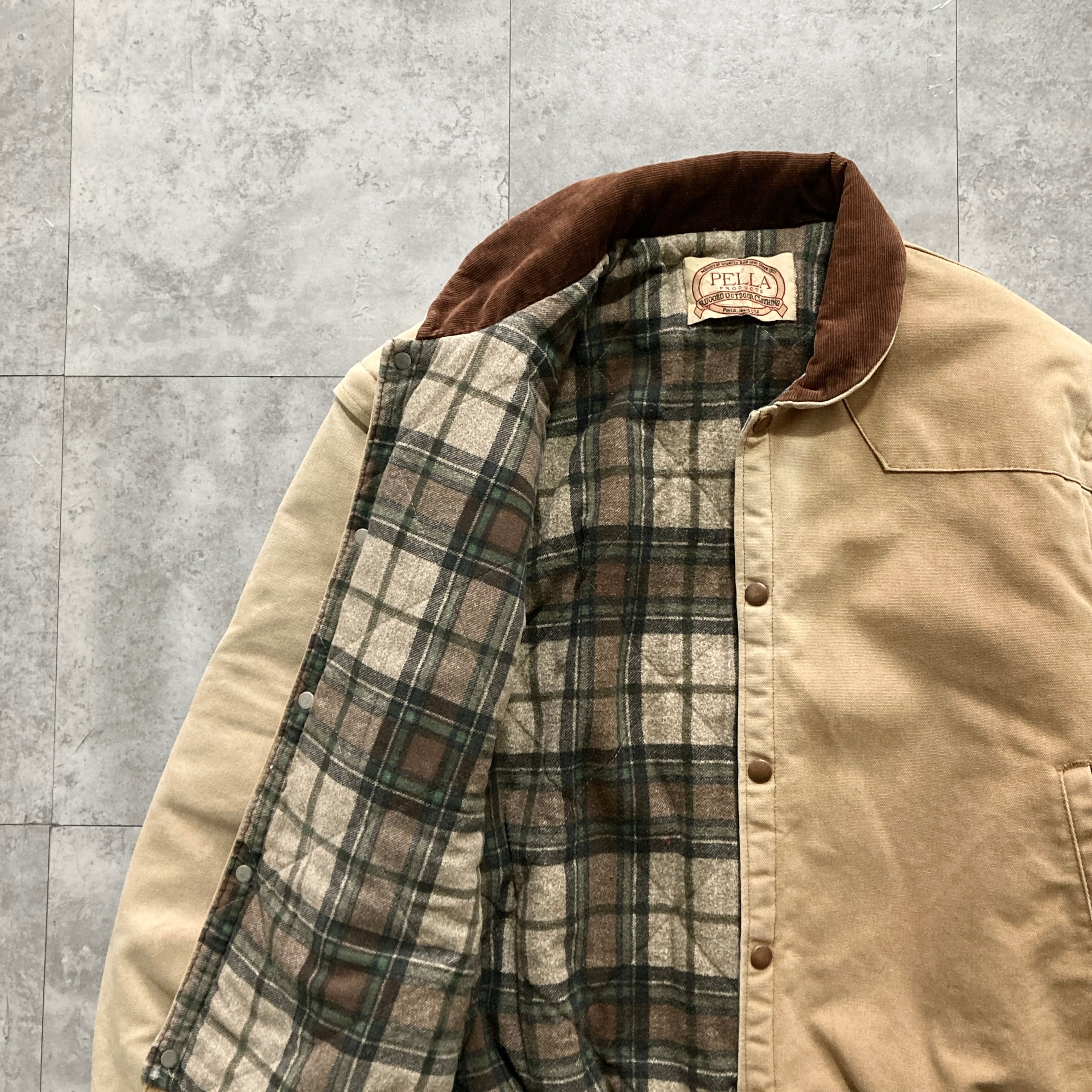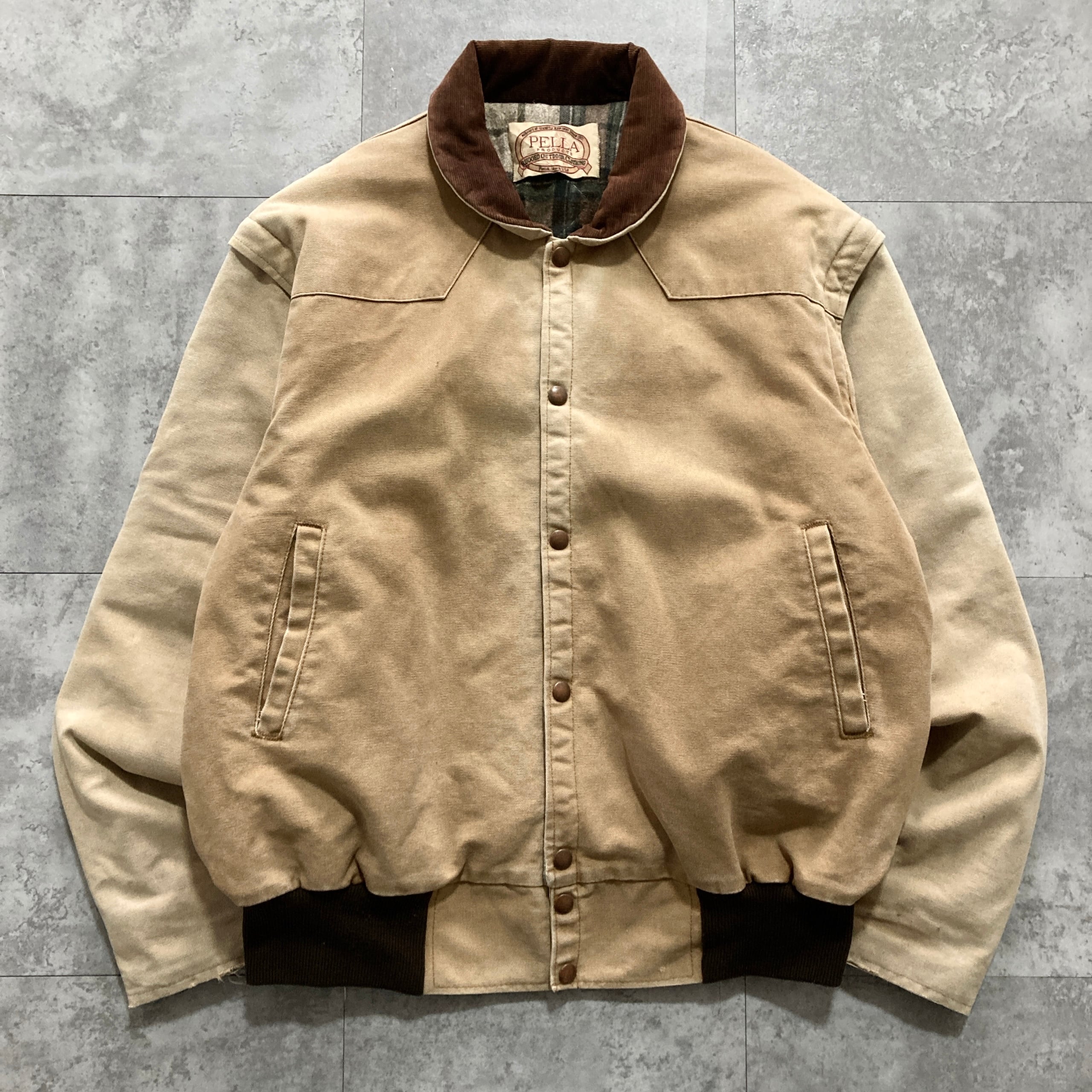 【USA製】80s-90s PELLA PRODUCTS ペラプロダクツ 表記L アメリカ製 ダック生地 袖着脱可 襟コーデュロイ 裏地チェック柄 フェード感 ダックジャケット/ワークジャケット | Only_Denim+