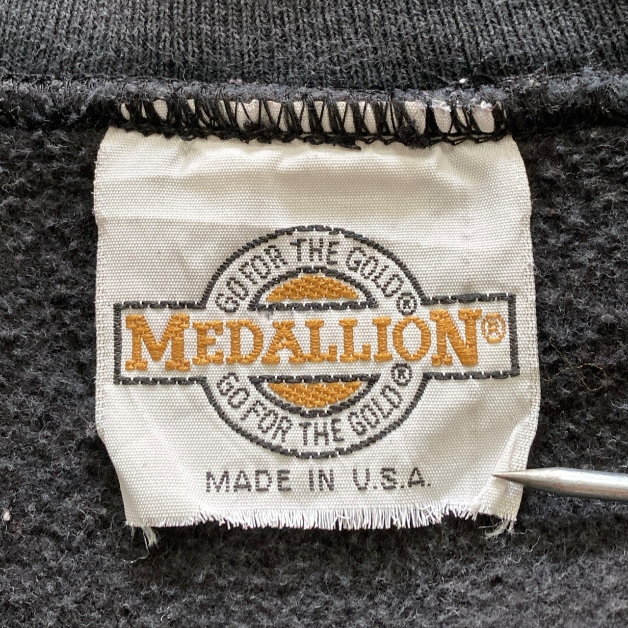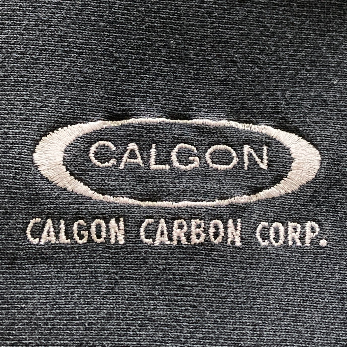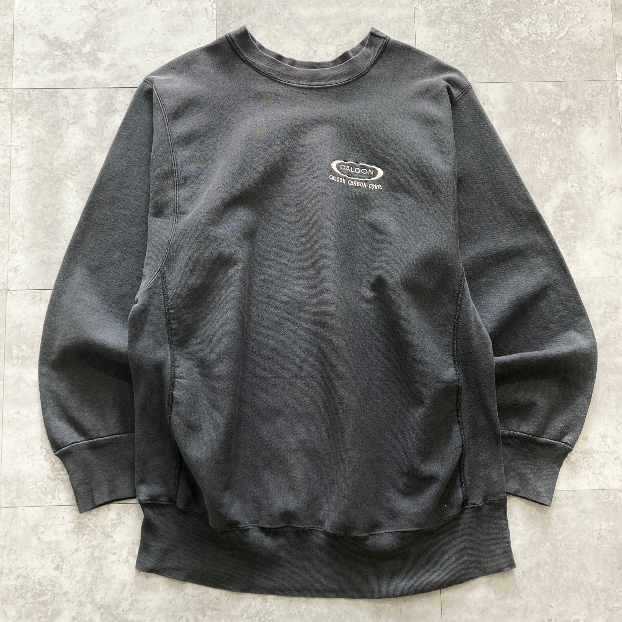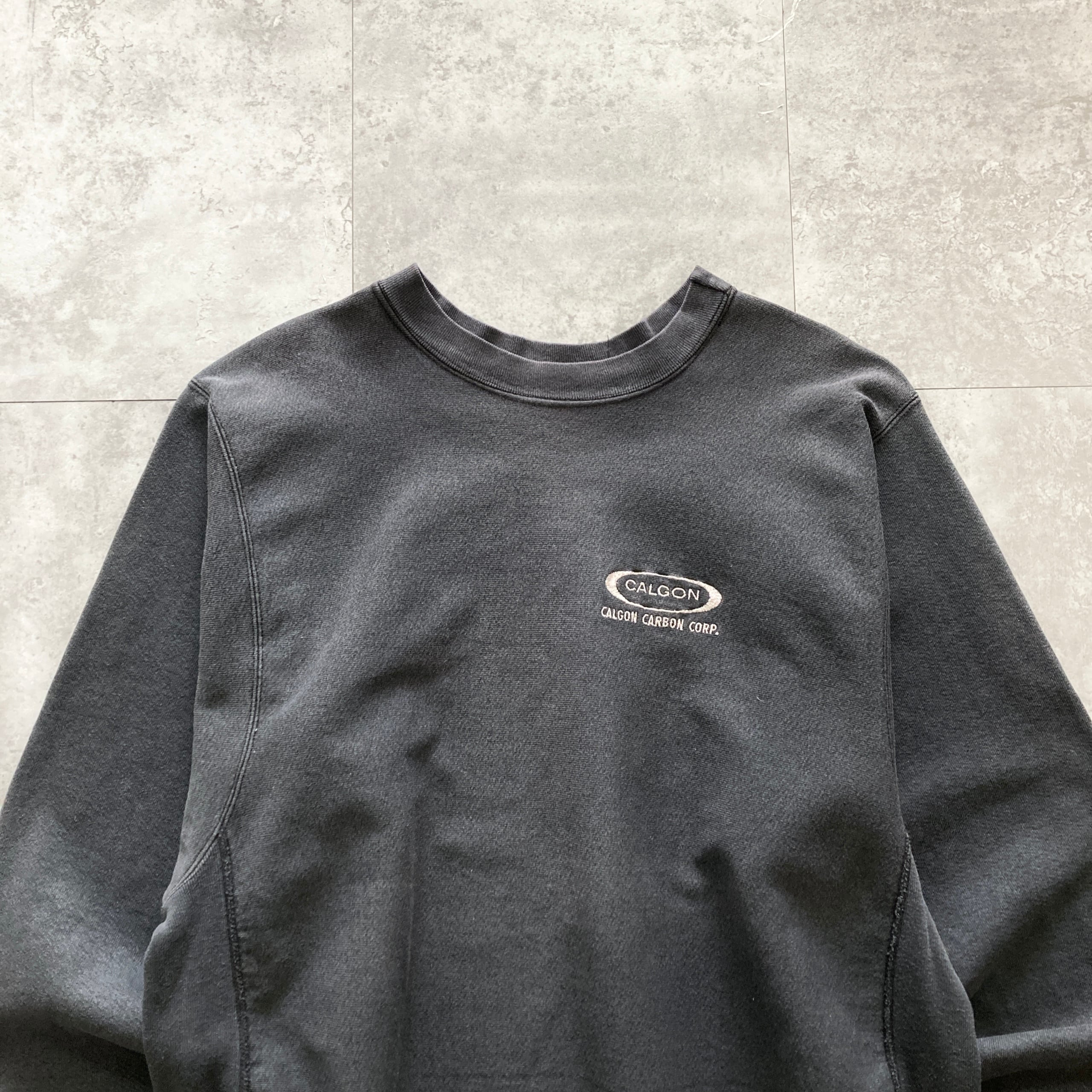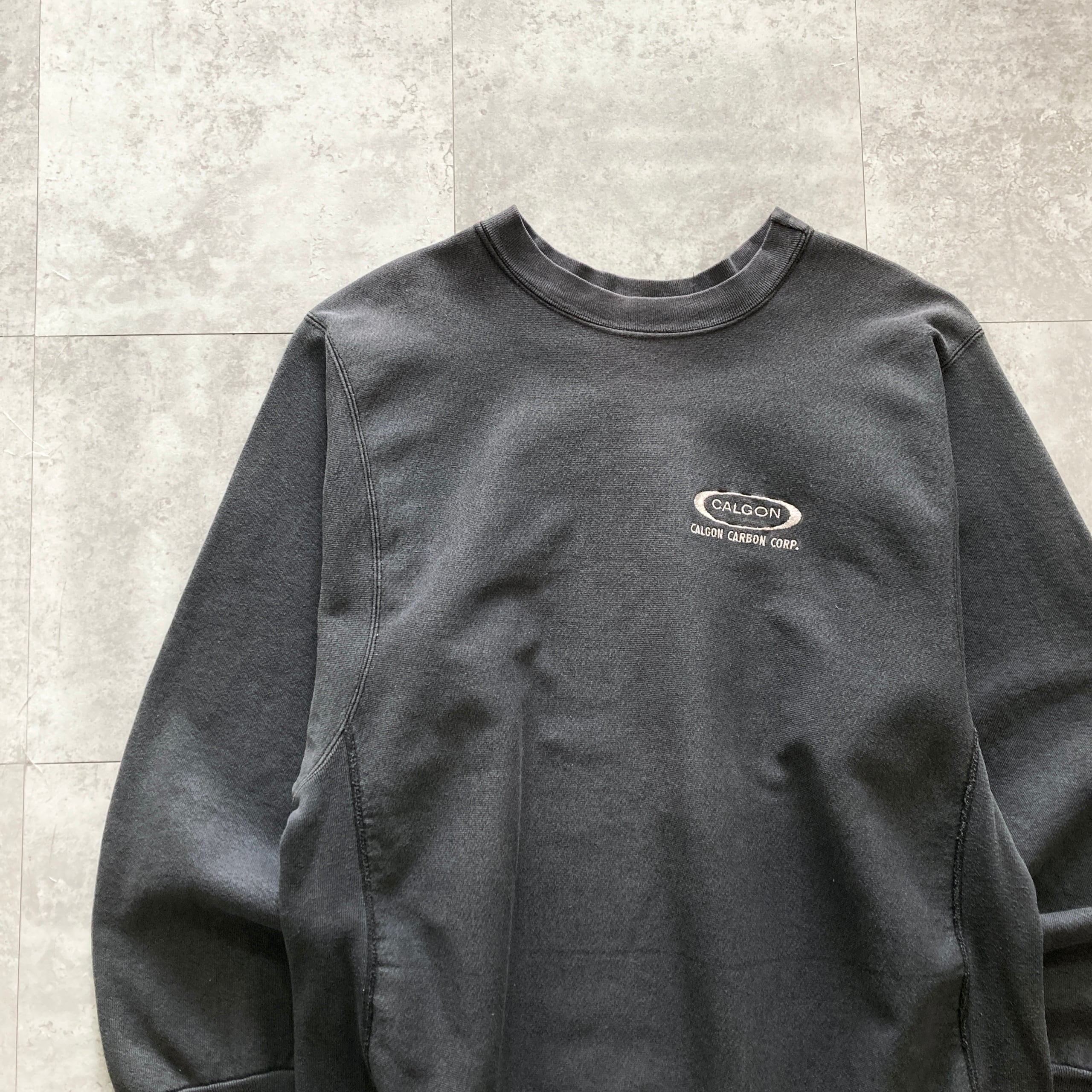 【USA製】80s-90s 企業物 MEDALLION メダリオン 表記XL アメリカ製 CALGON CARBON CORP カルゴンカーボン社 ワンポイント ロゴ刺繍 リバースウィーブタイプ 先染めブラック フェード感 肉厚 スウェット | Only_Denim+