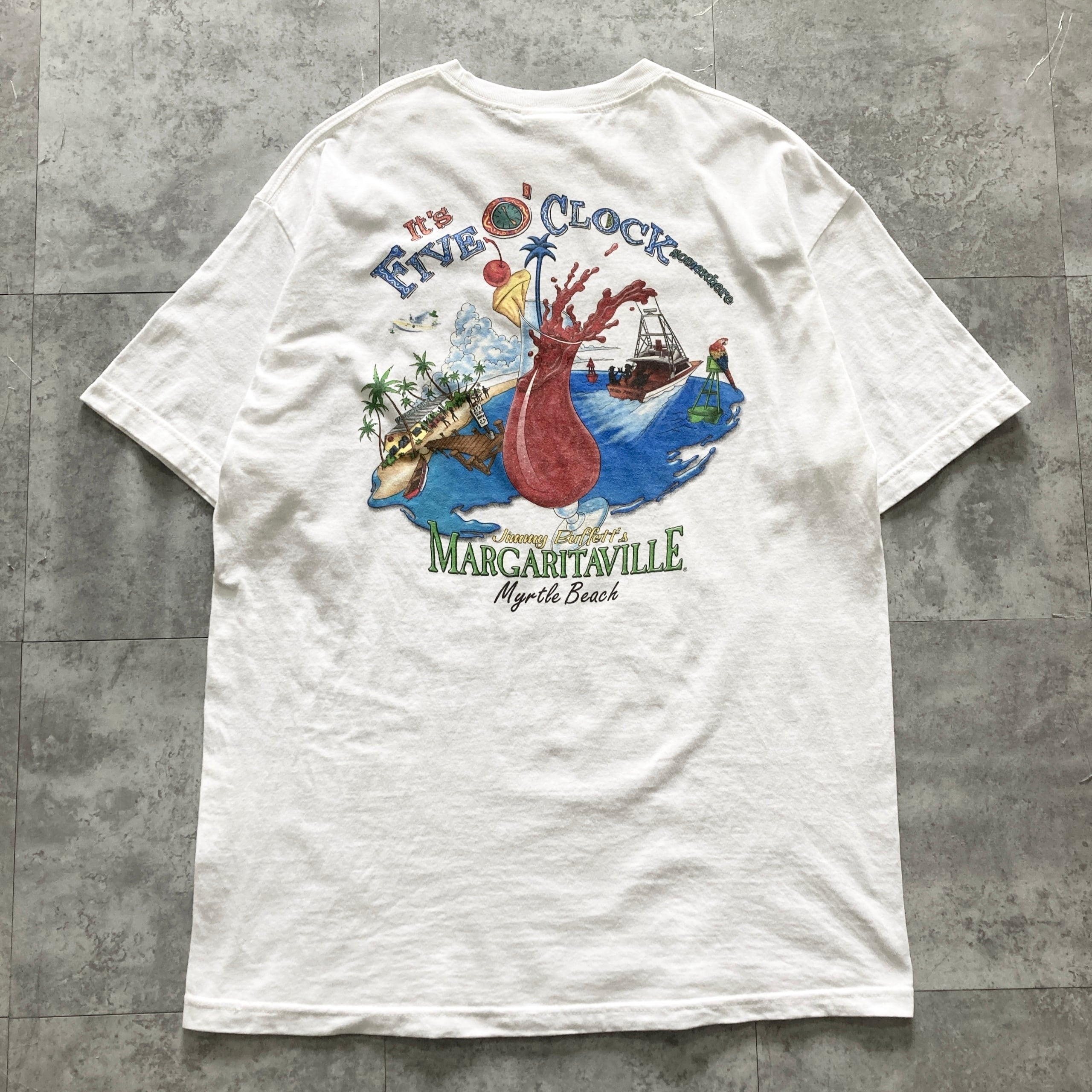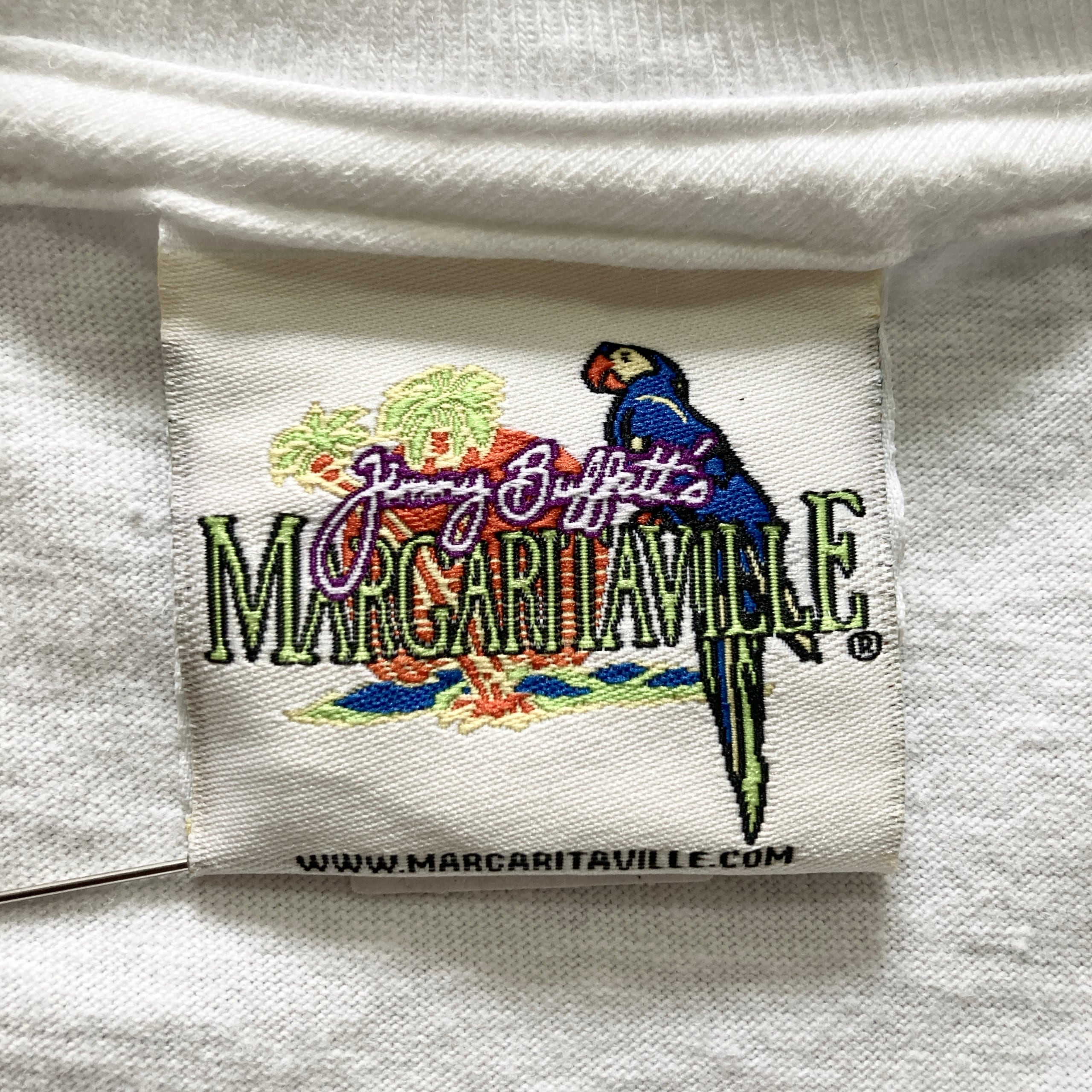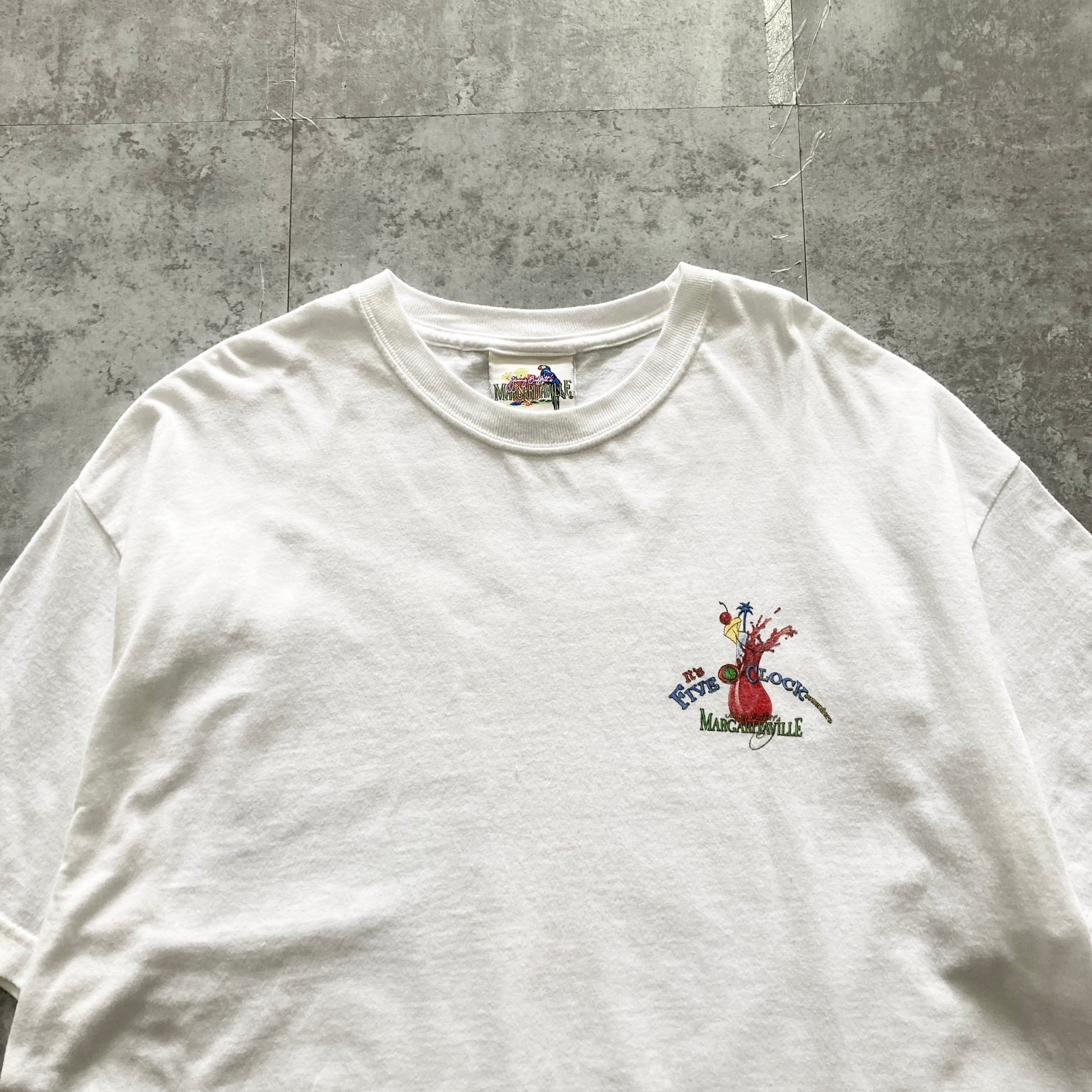 【USA製】00s Jimmy Buffett's MARGARITAVILLE ジミーバフェットマーガリタヴィル 表記XL アメリカ製 両面プリント カクテル ホワイト Tシャツ