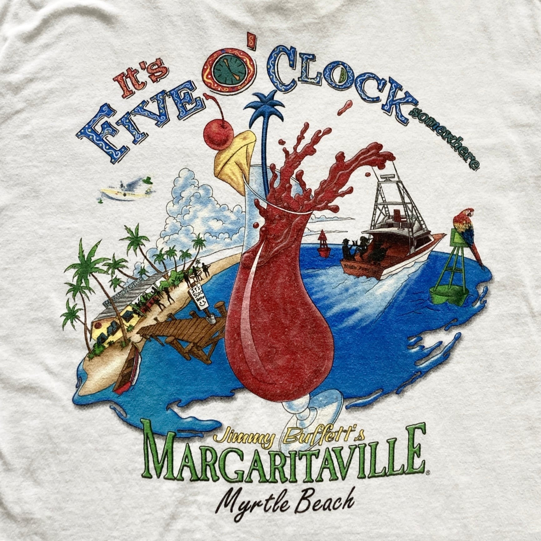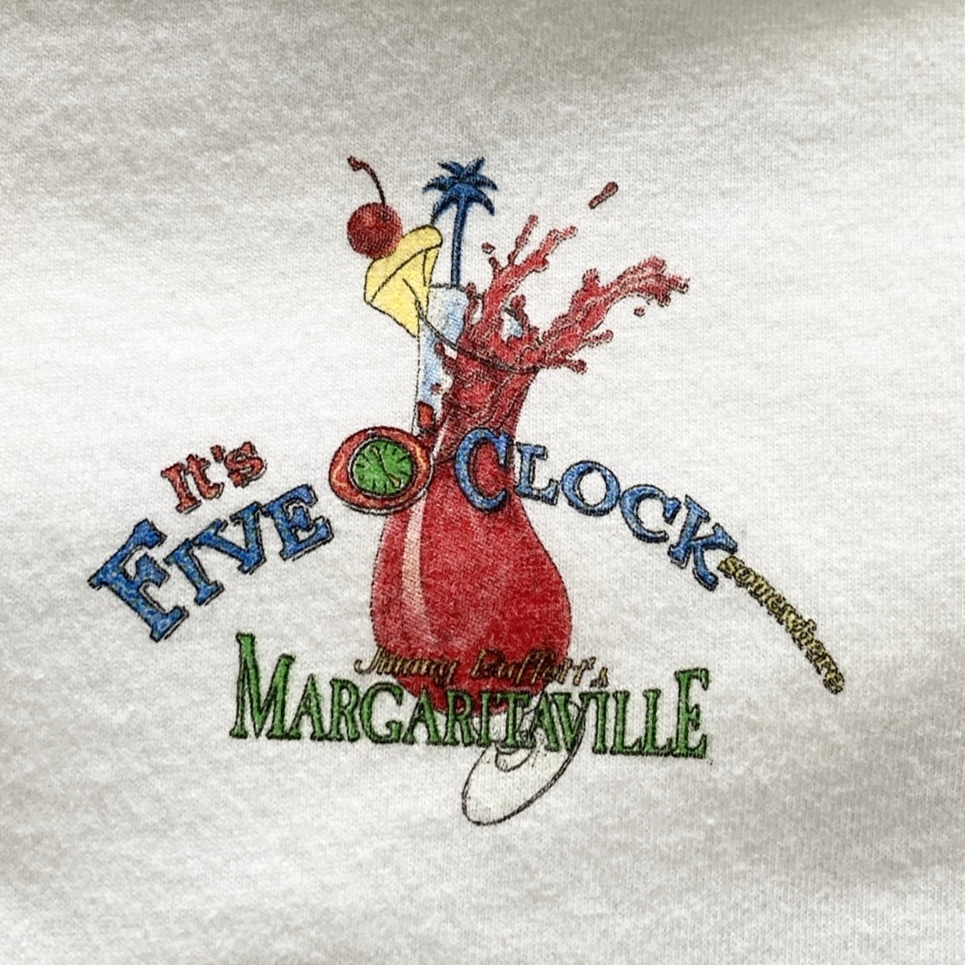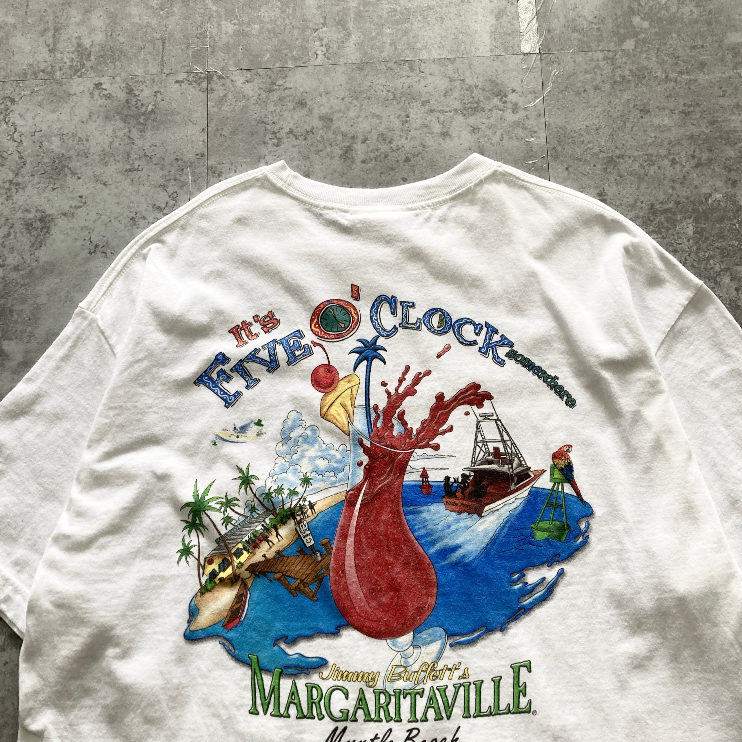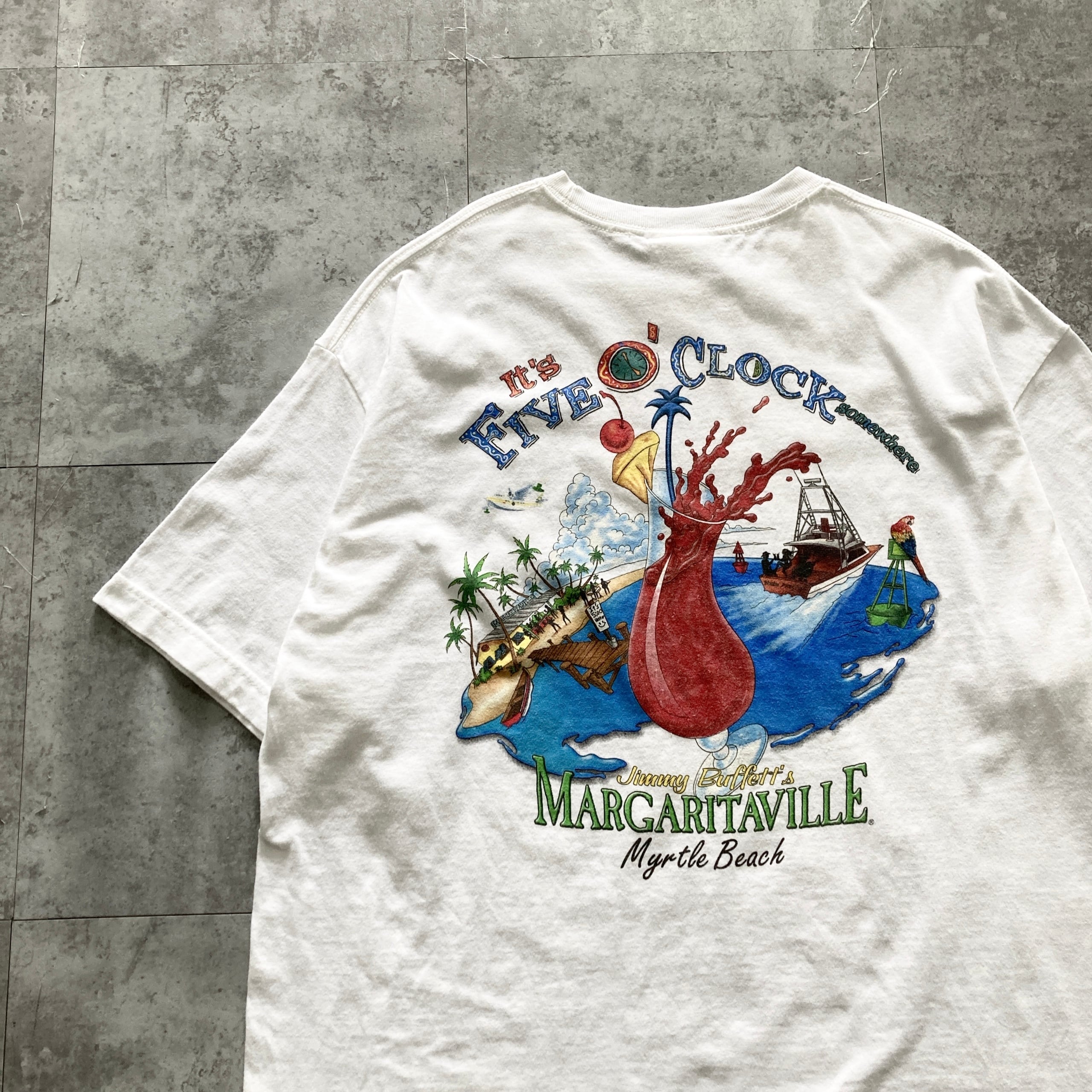 【USA製】00s Jimmy Buffett's MARGARITAVILLE ジミーバフェットマーガリタヴィル 表記XL アメリカ製 両面プリント カクテル ホワイト Tシャツ
