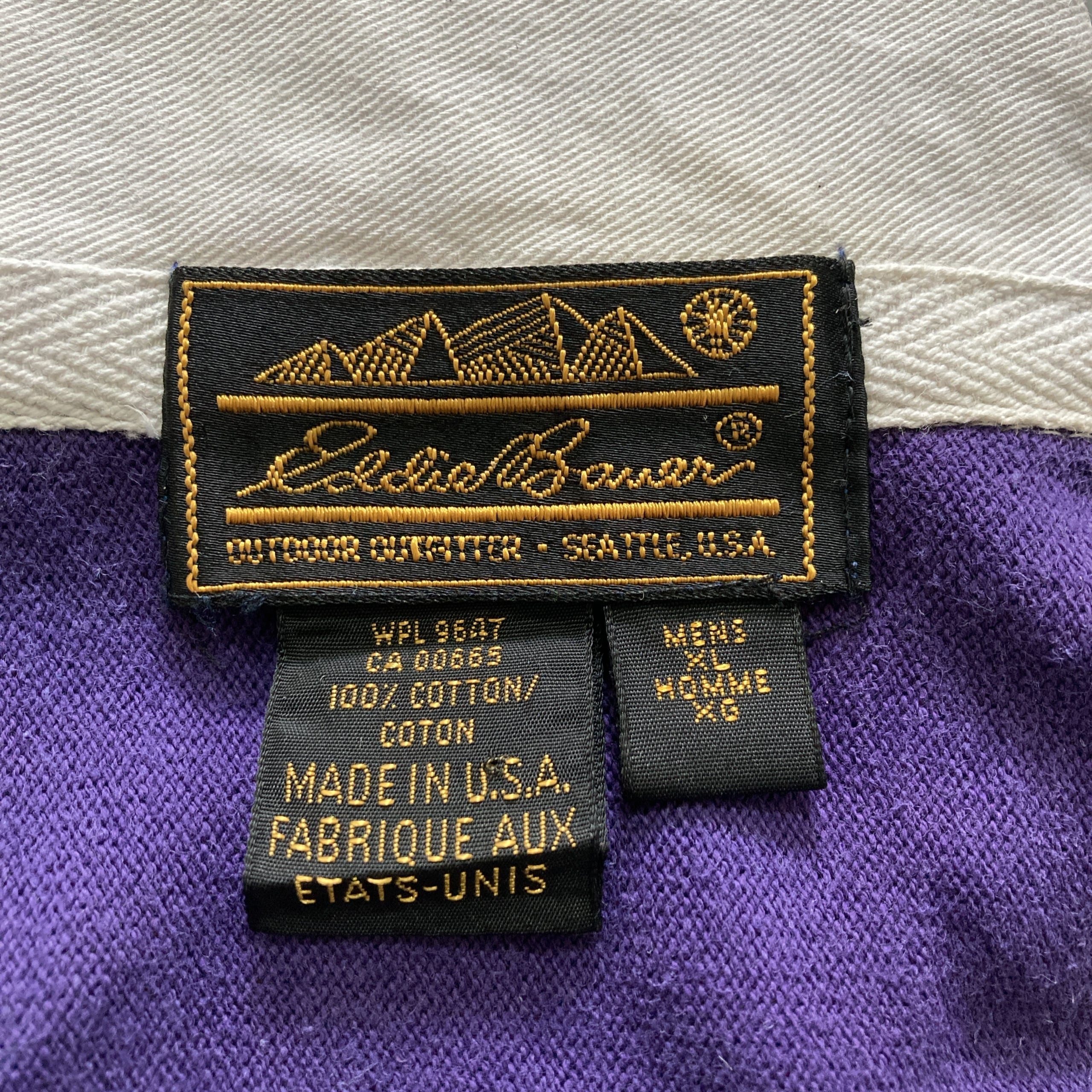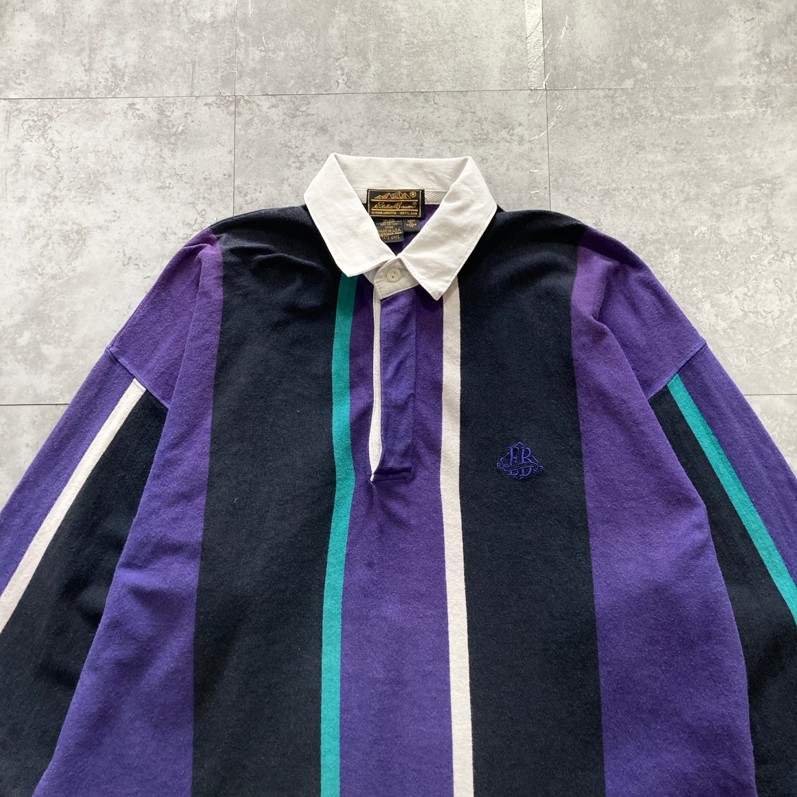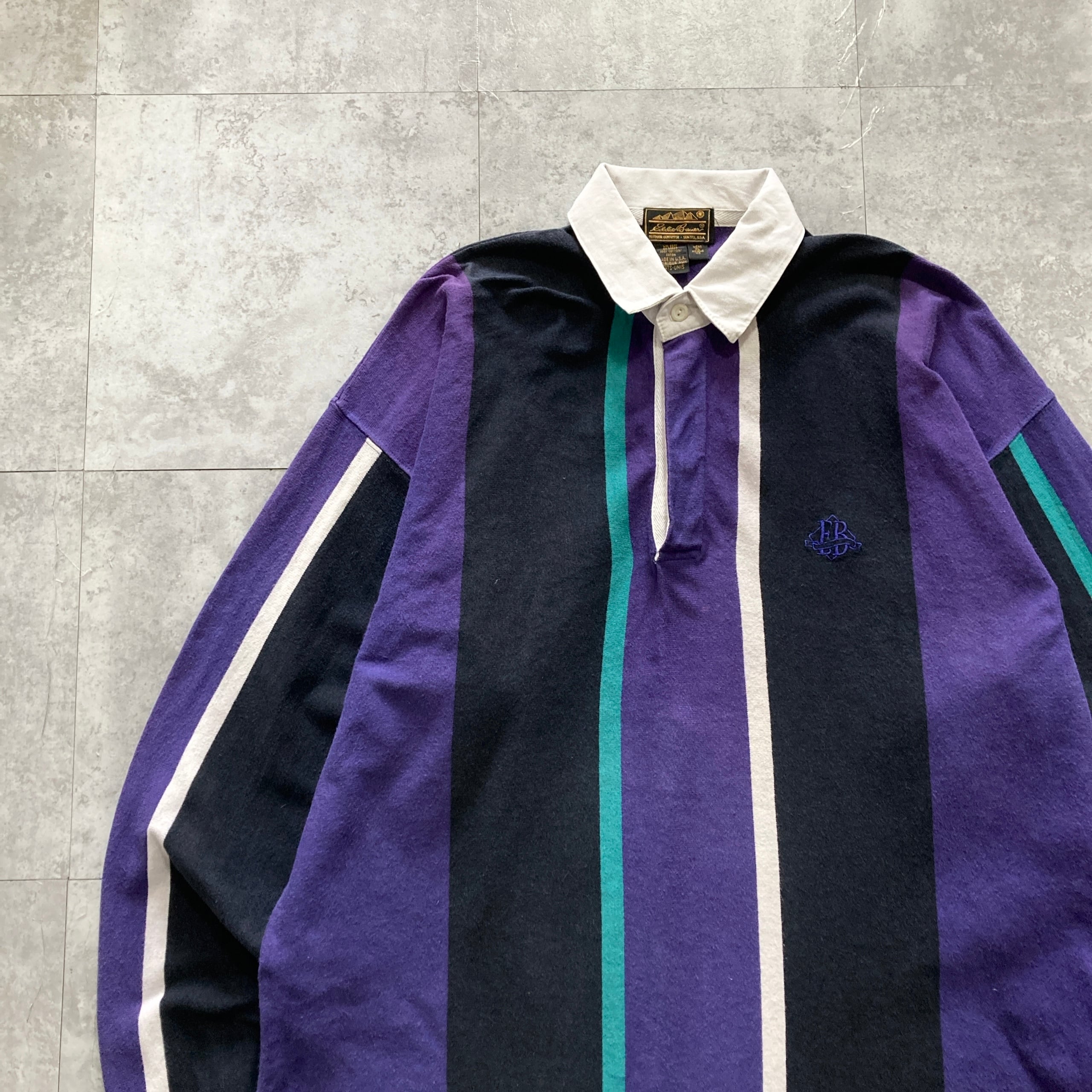 【USA製】80s Eddie Bauer エディーバウアー 表記XL アメリカ製 ワンポイント ロゴ刺繍 マルチカラー ラガーシャツ