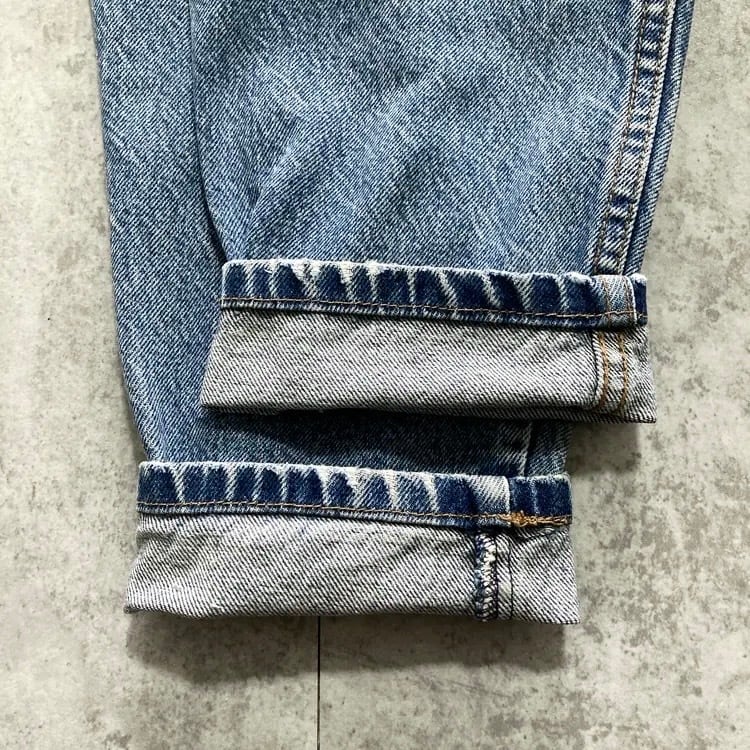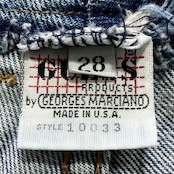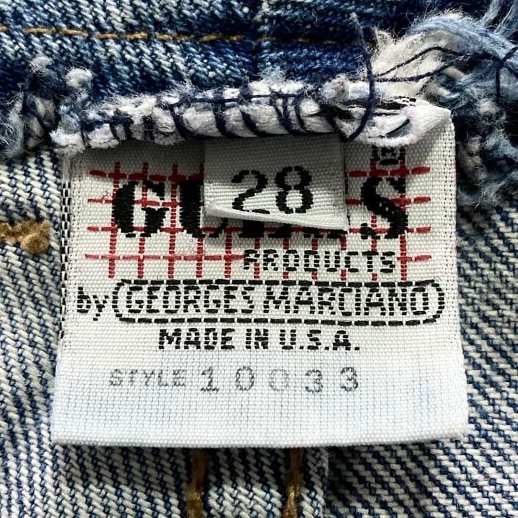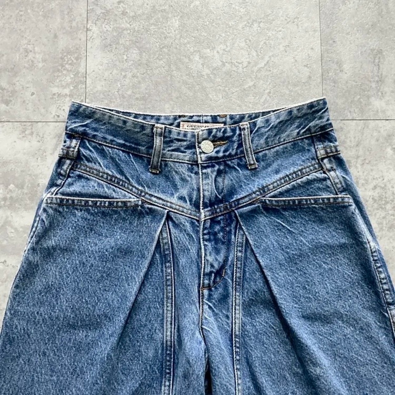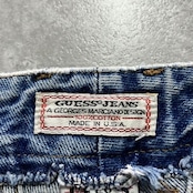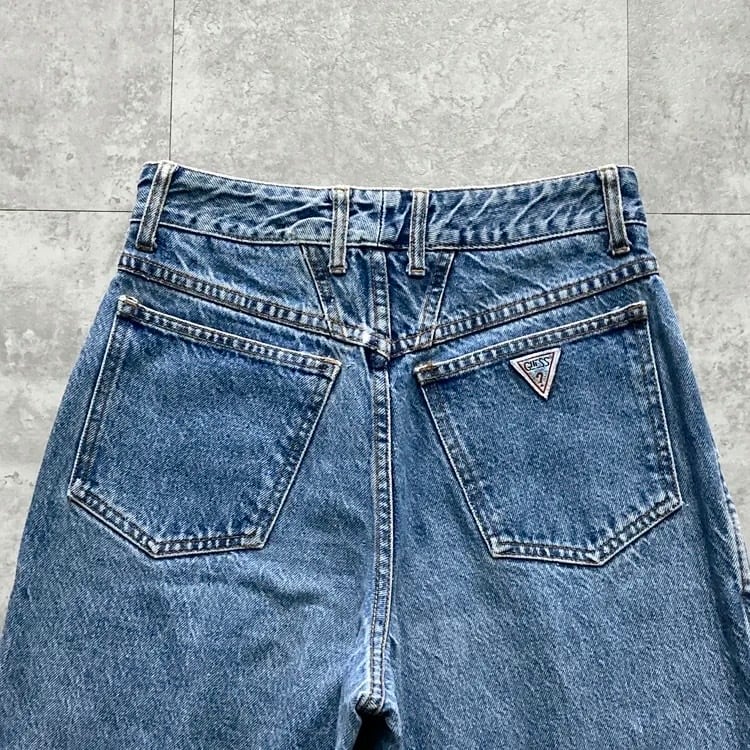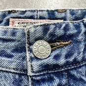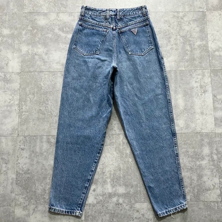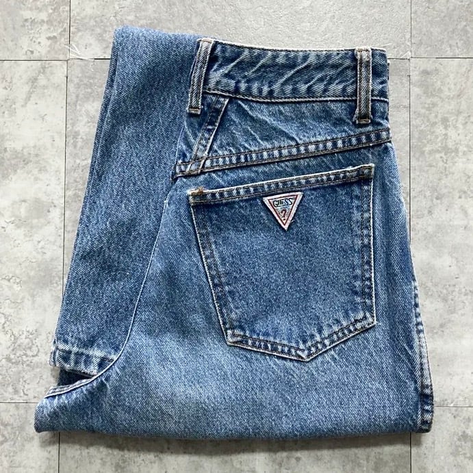 【USA製】90’s GUESS ゲス 表記28 アメリカ製 ワンポイントロゴ刺繍 ジップフライ ワンタック(シングルタック) デニムパンツ ジーンズ