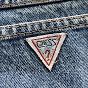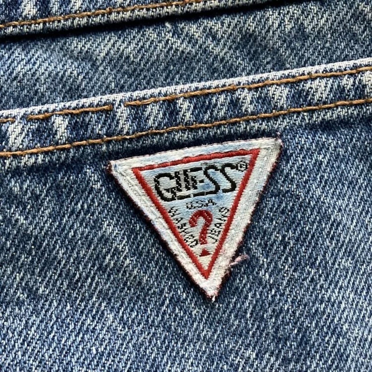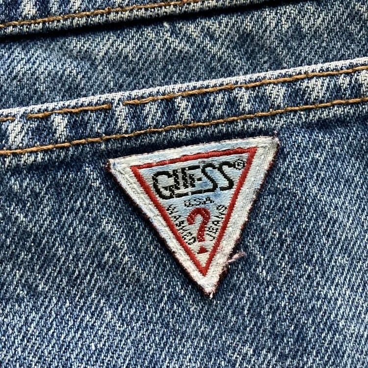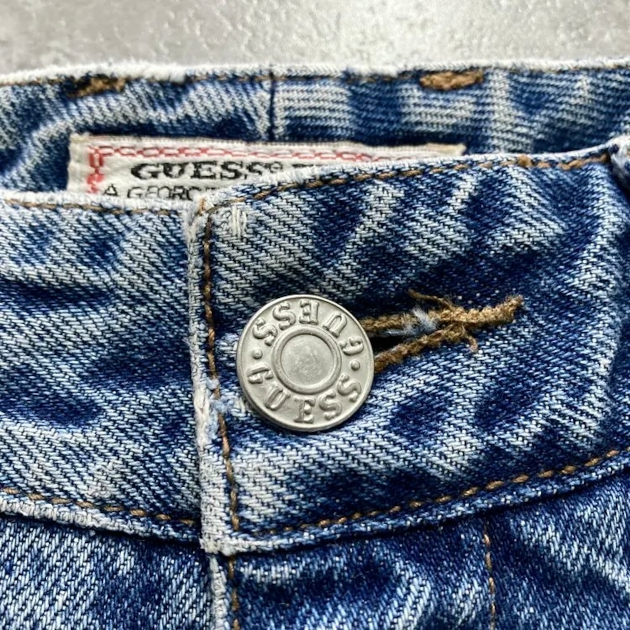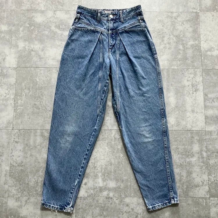 【USA製】90’s GUESS ゲス 表記28 アメリカ製 ワンポイントロゴ刺繍 ジップフライ ワンタック(シングルタック) デニムパンツ ジーンズ
