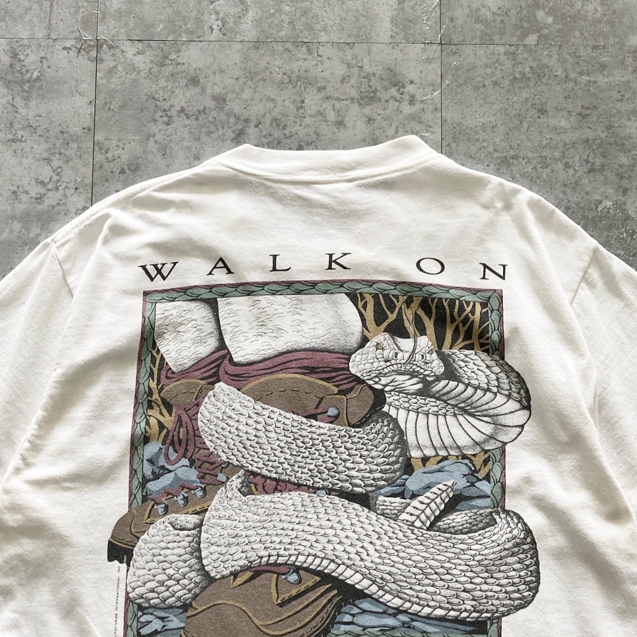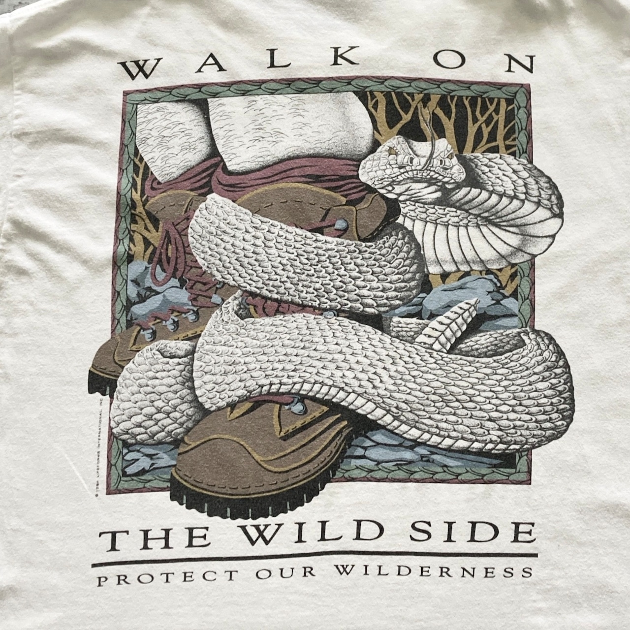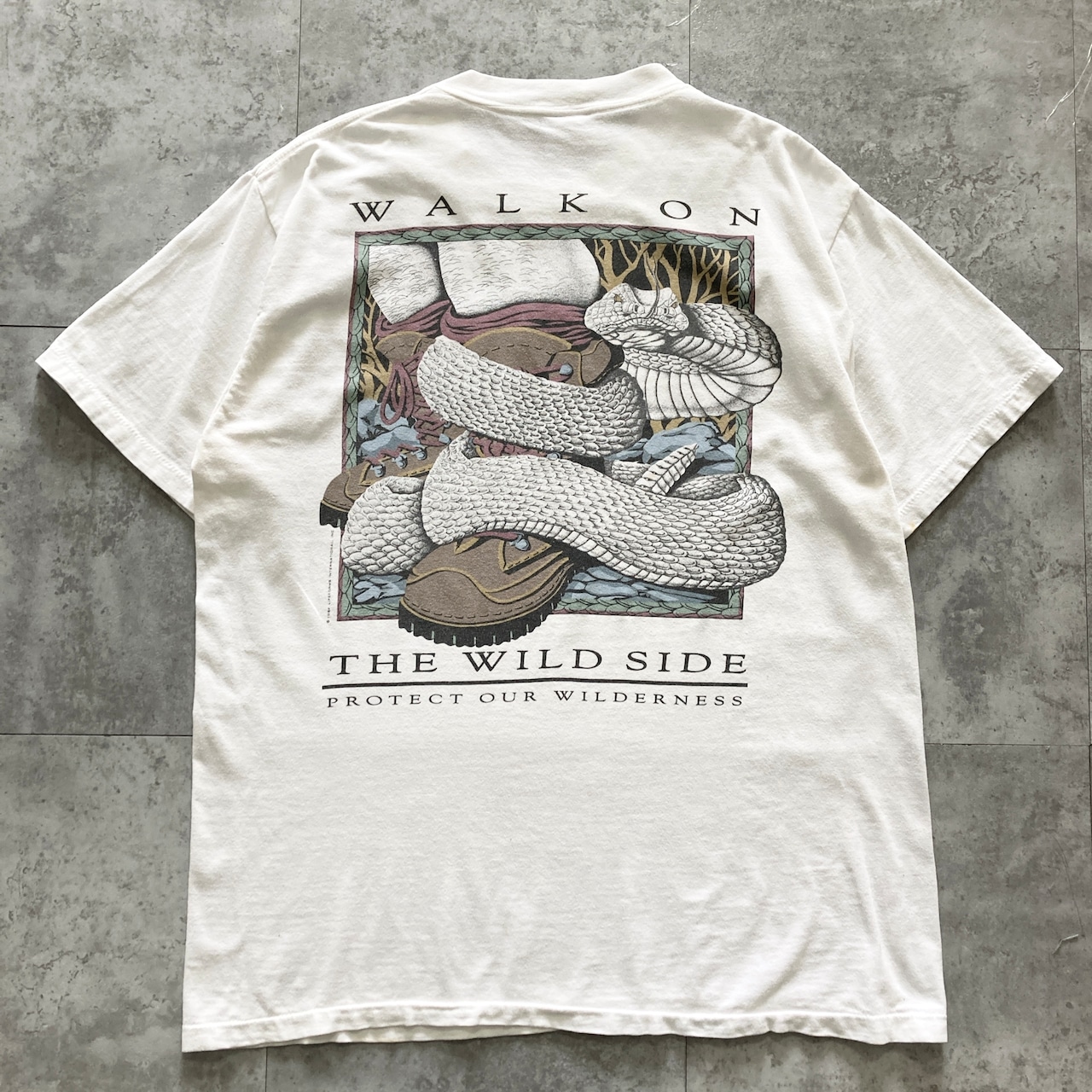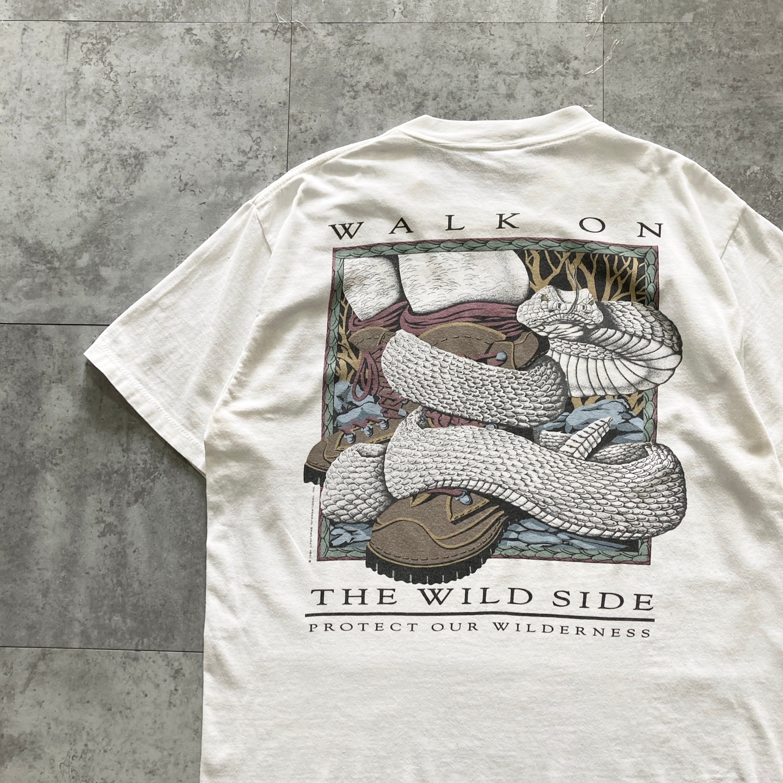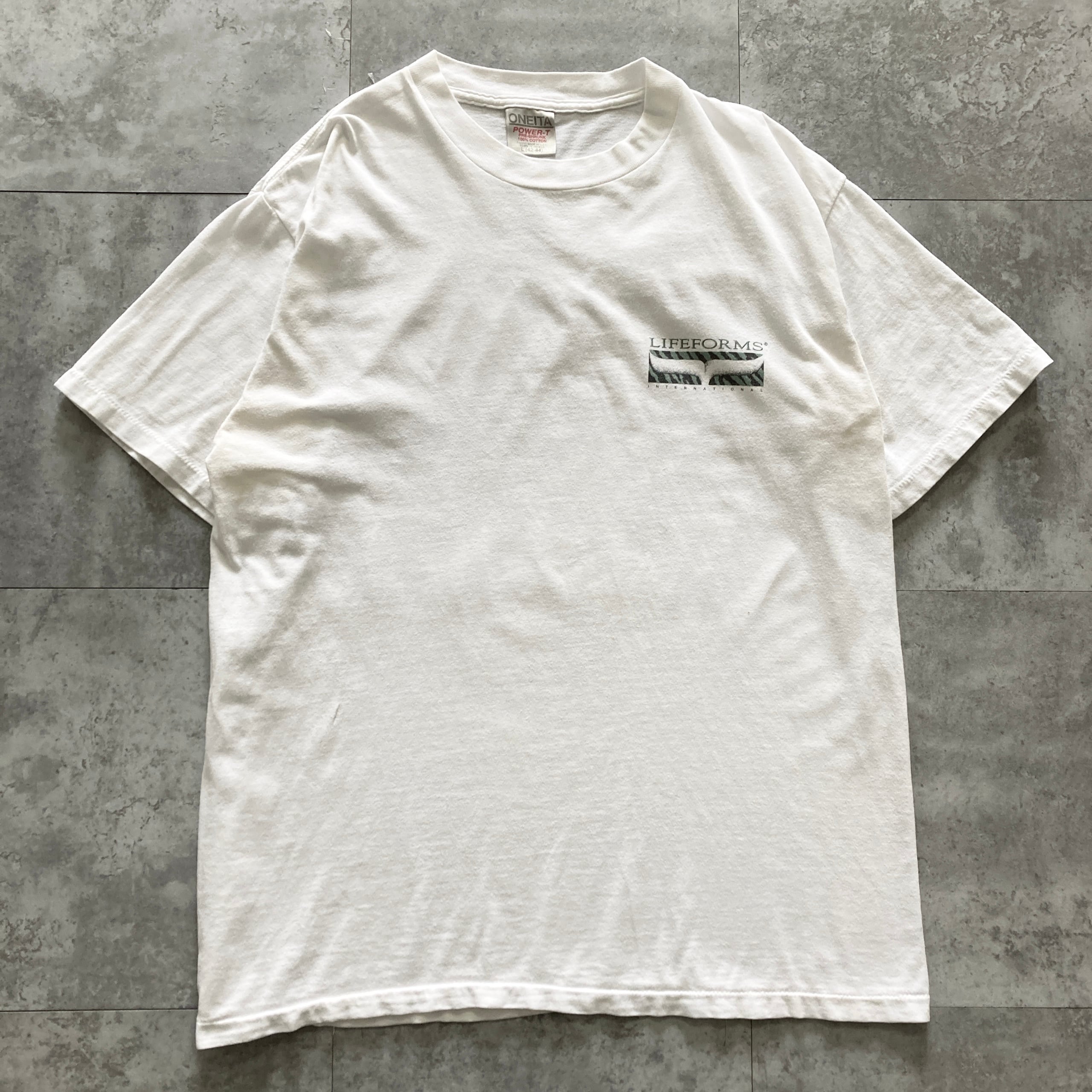 【90s】 ONEITA オニータ コピーライト1994 表記L シングルステッチ LIFEFORMS INTERNATIONAL 両面プリント スネーク ヘビ 蛇 WALK ON THE WILD SIDE バックプリント ホワイト Tシャツ