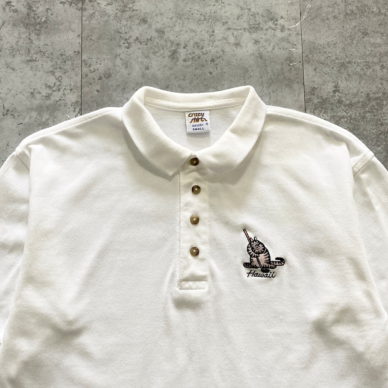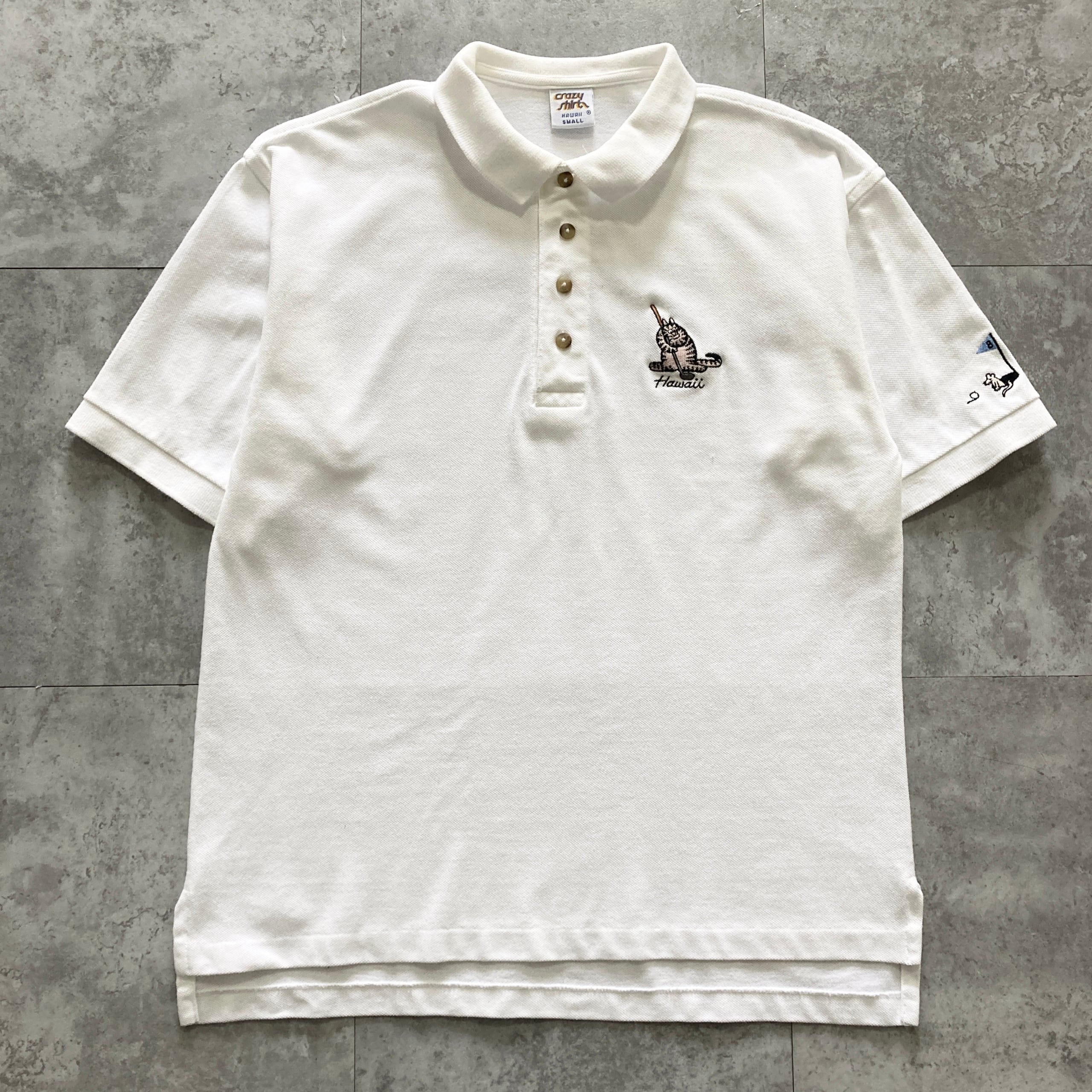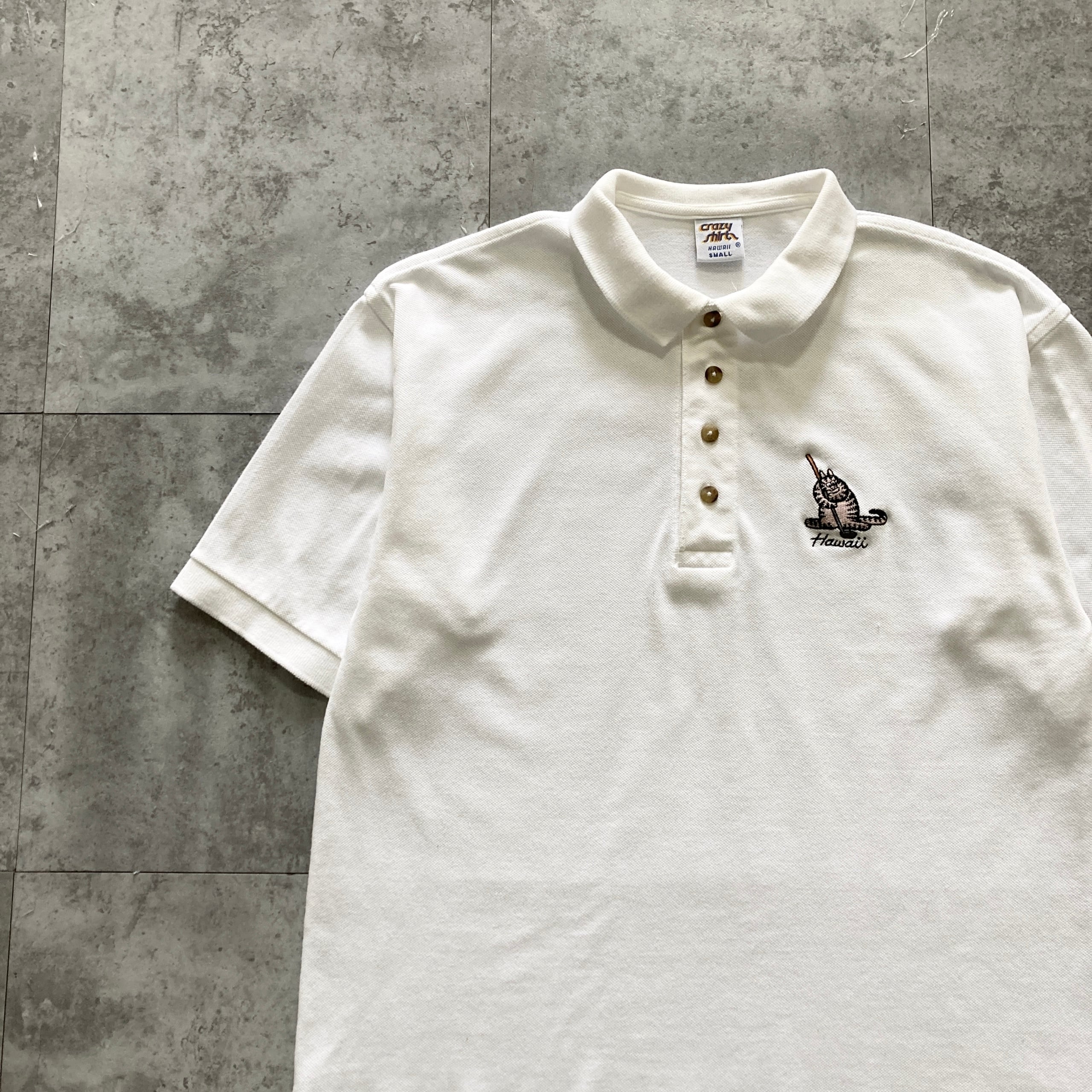 【USA製】90s Crazy Shirts クレイジーシャツ クリバンキャット 表記S 着用感M キャラクター刺繍 ブランドロゴボタン ホワイト ポロシャツ