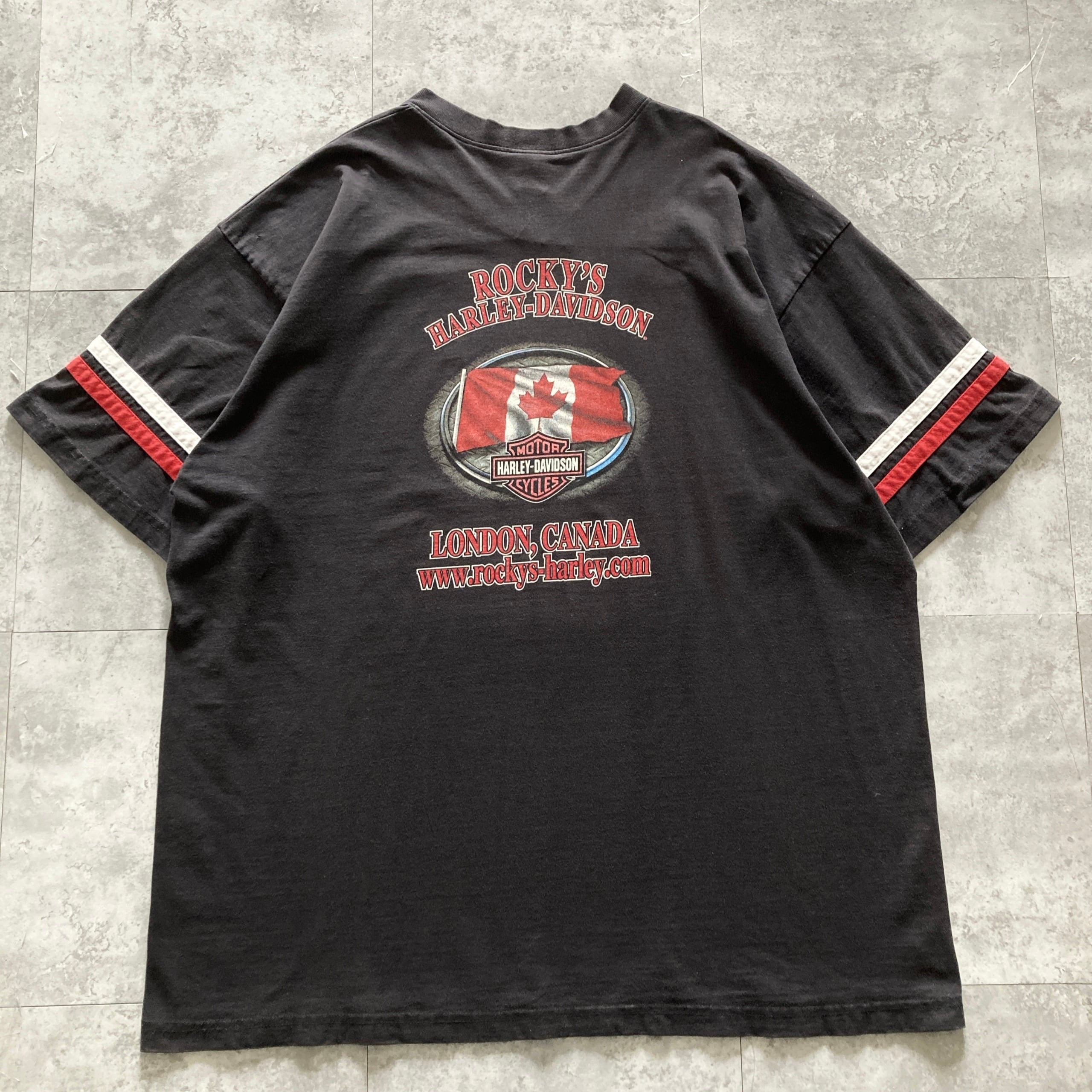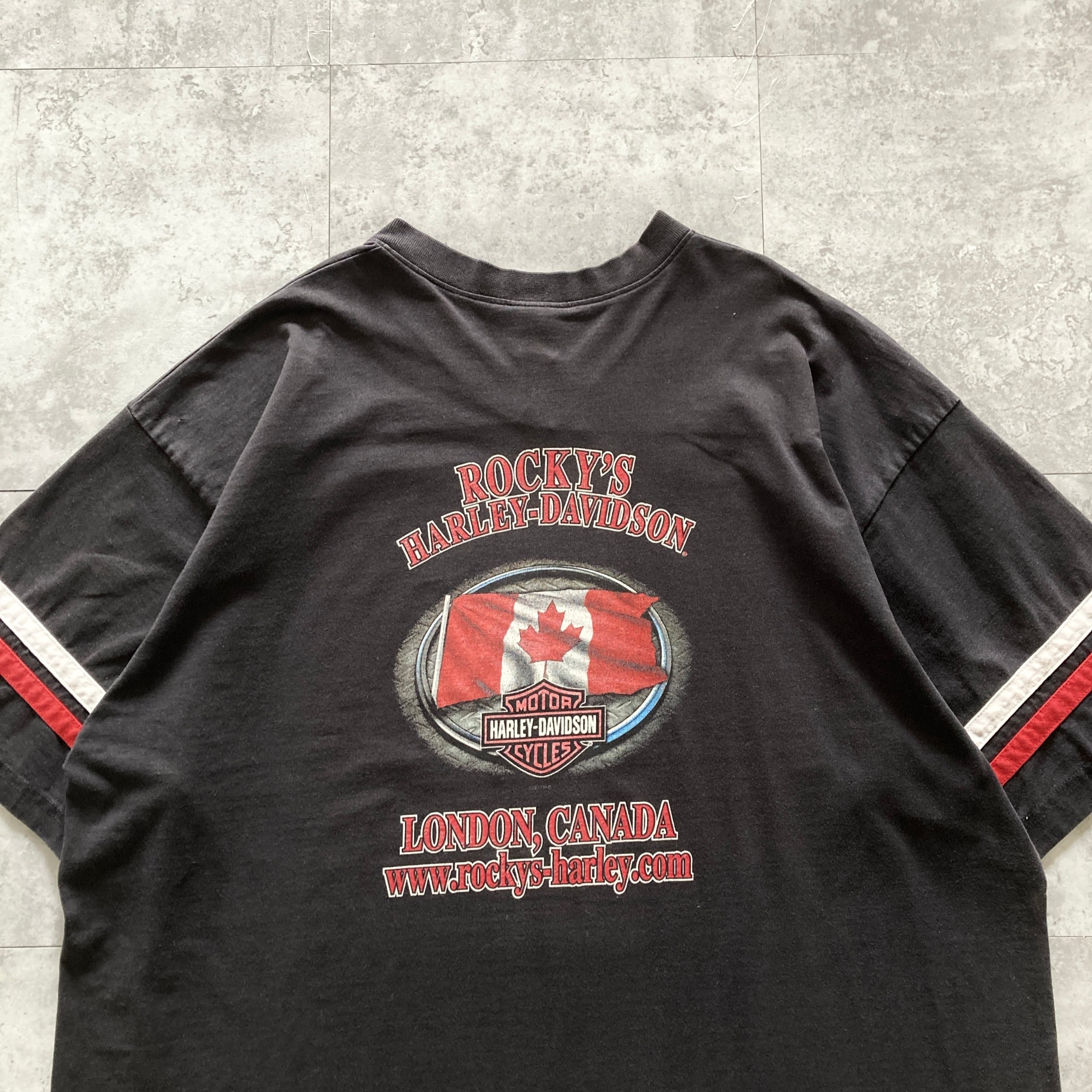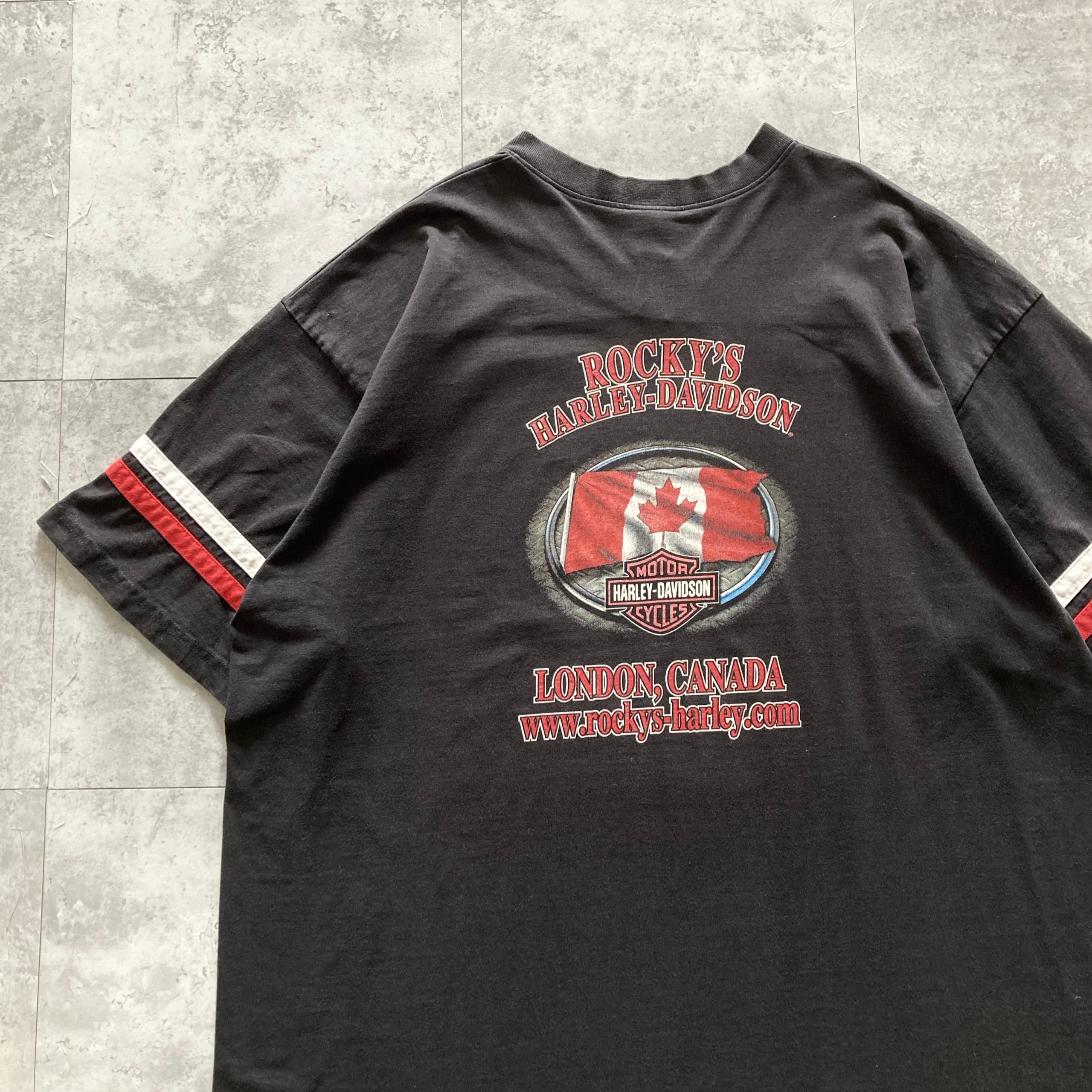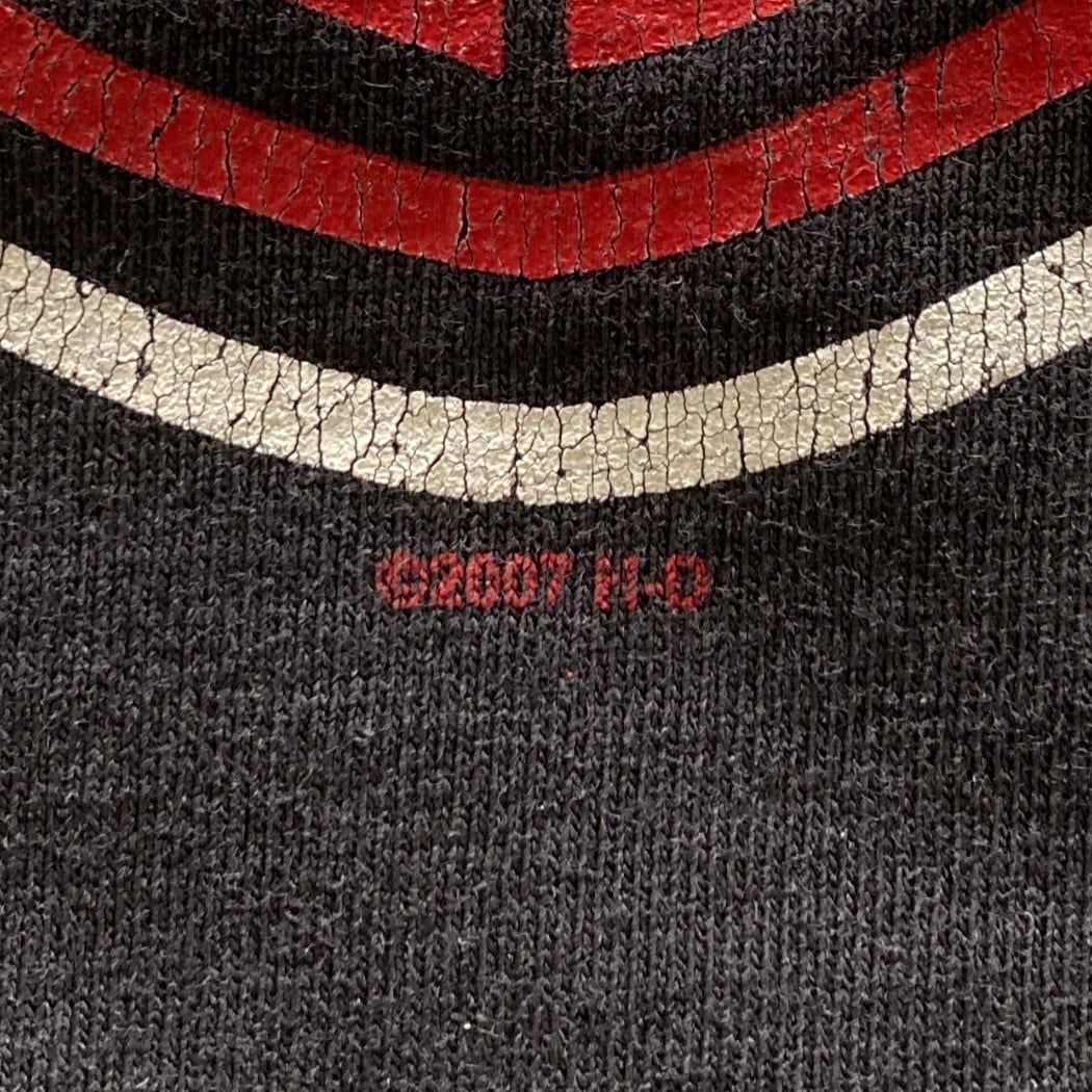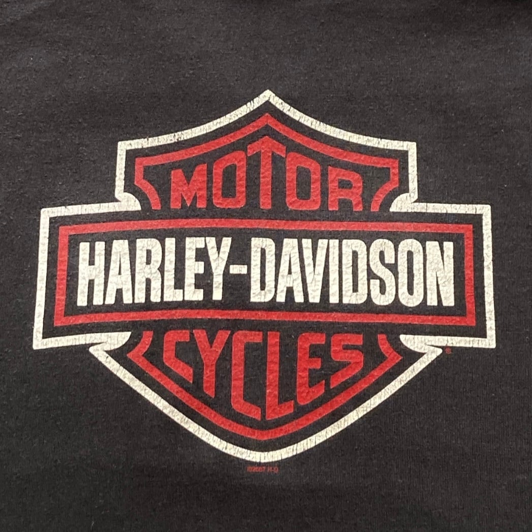 【USA製】00s ハーレーダビッドソン HARLEY-DAVIDSON 07年製 表記2XL アメリカ製 両面プリント 袖ライン ブラック Tシャツ