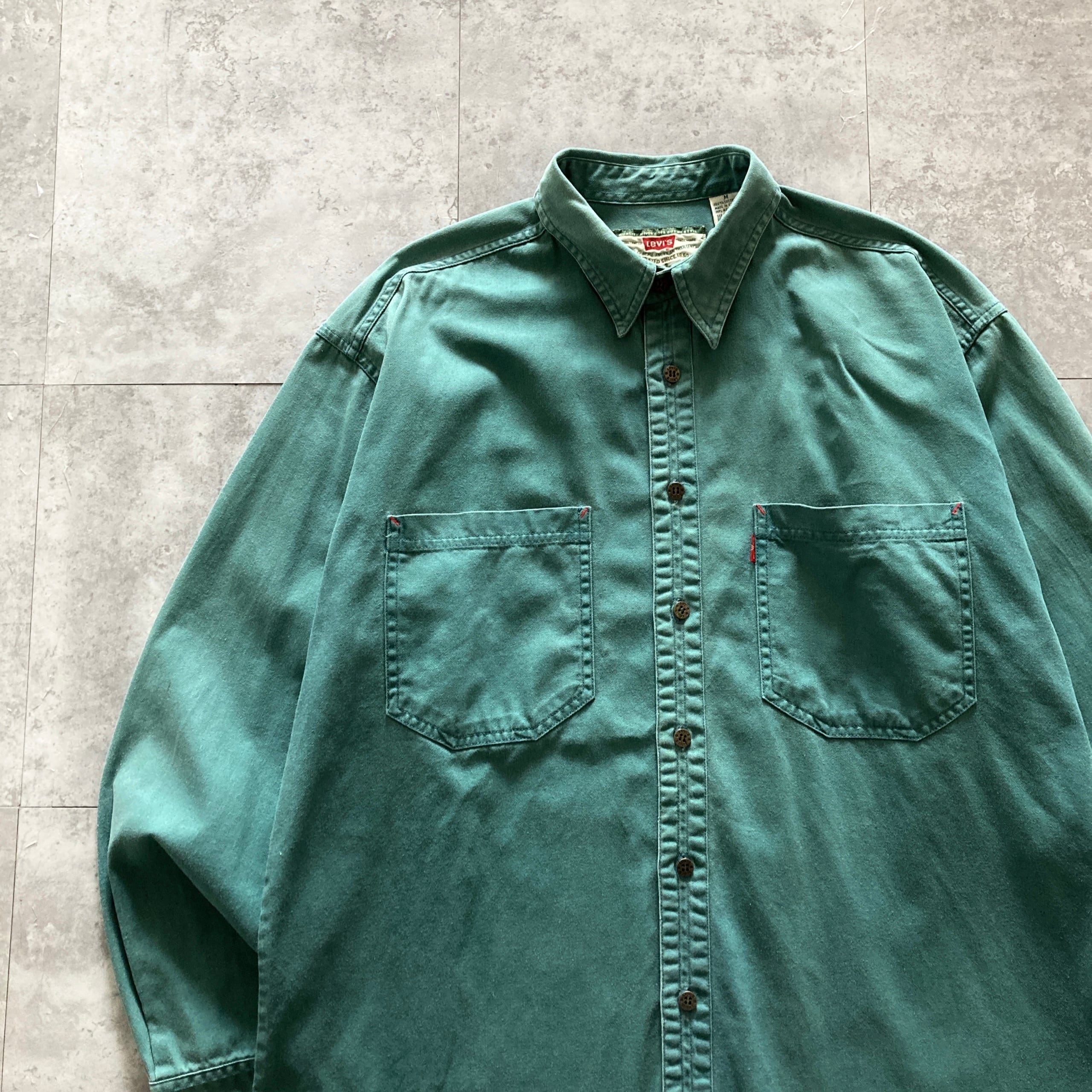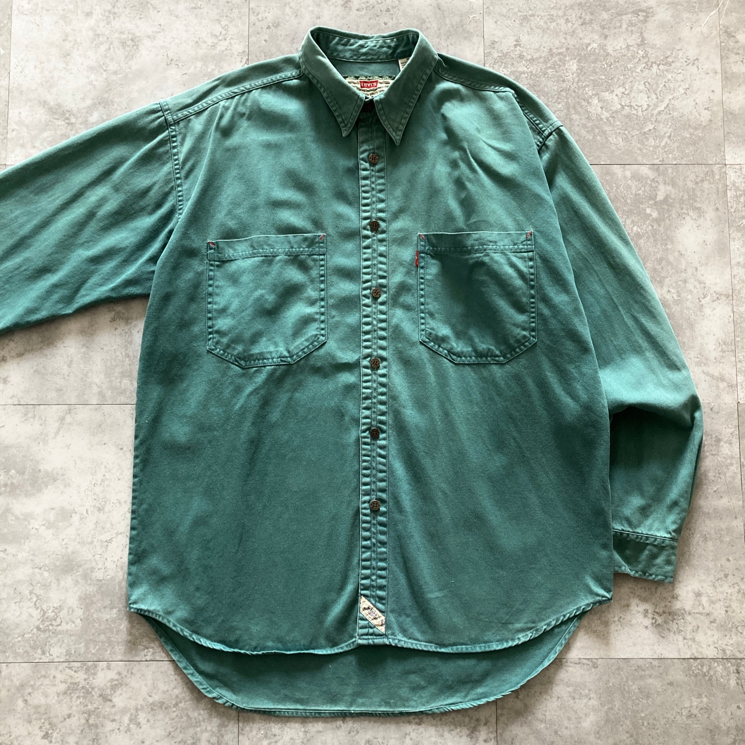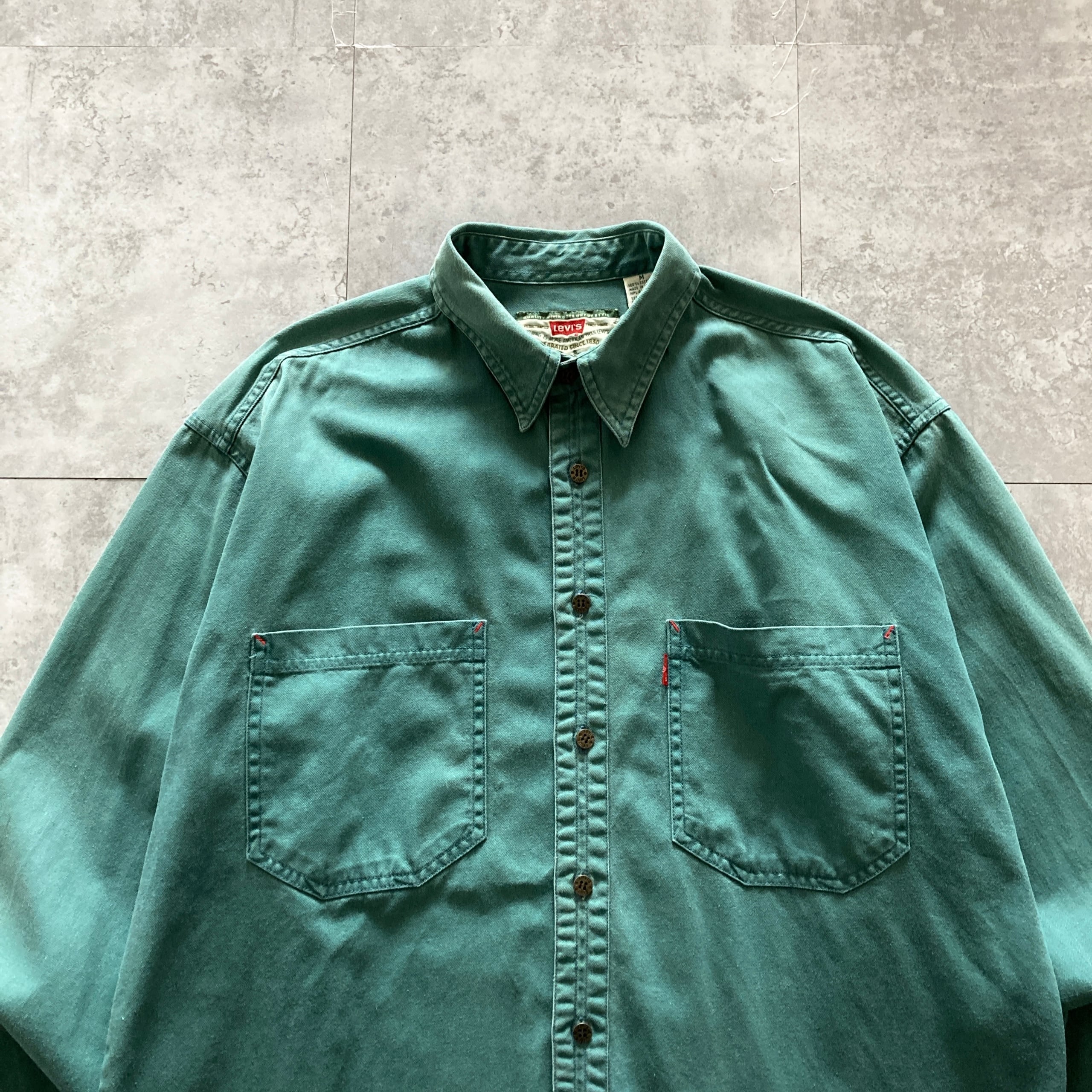 【Size.M】90‘s Levis リーバイス 92年製 ワンポイント ロゴ刺繍 メタルボタン ダブルポケット グリーン デニムシャツ