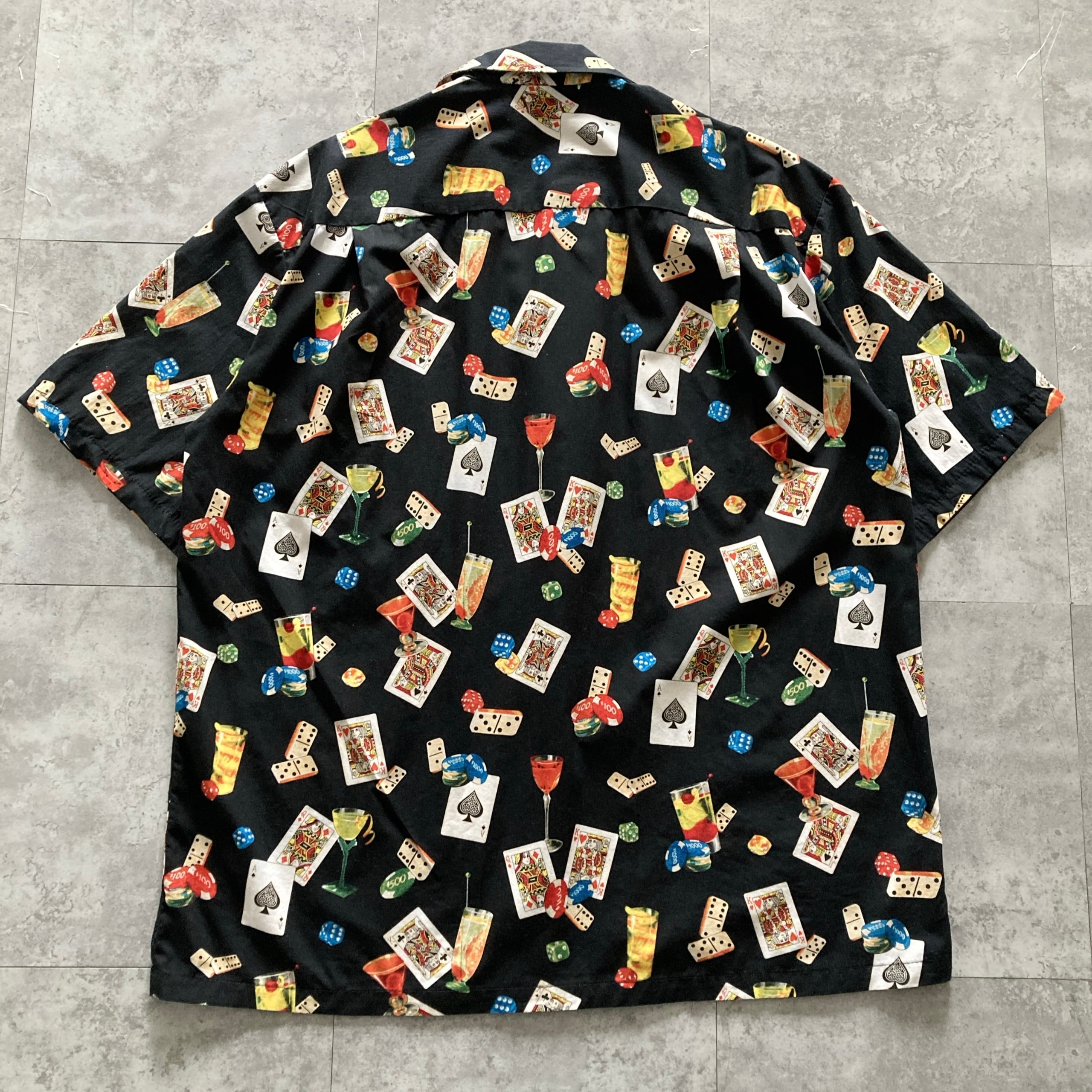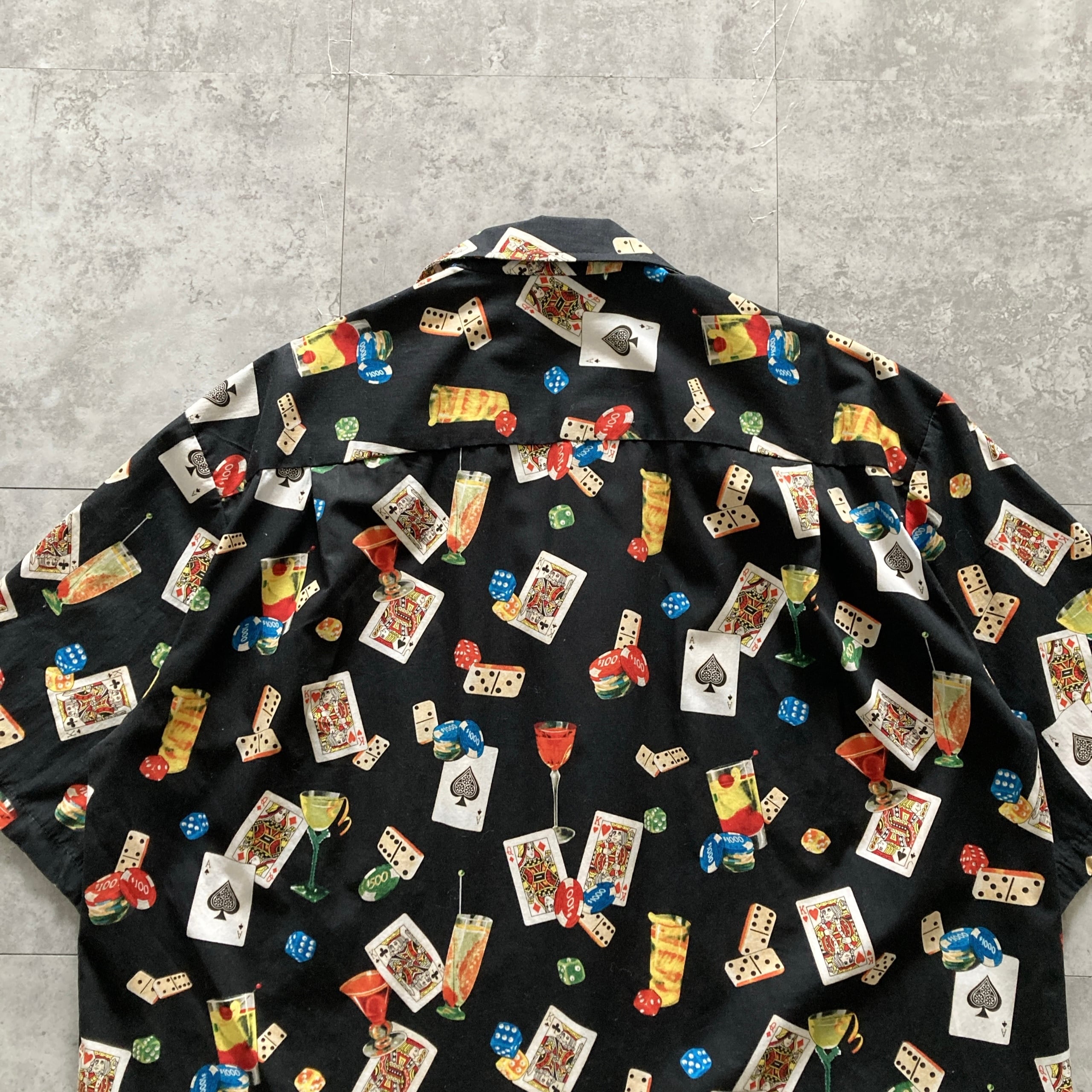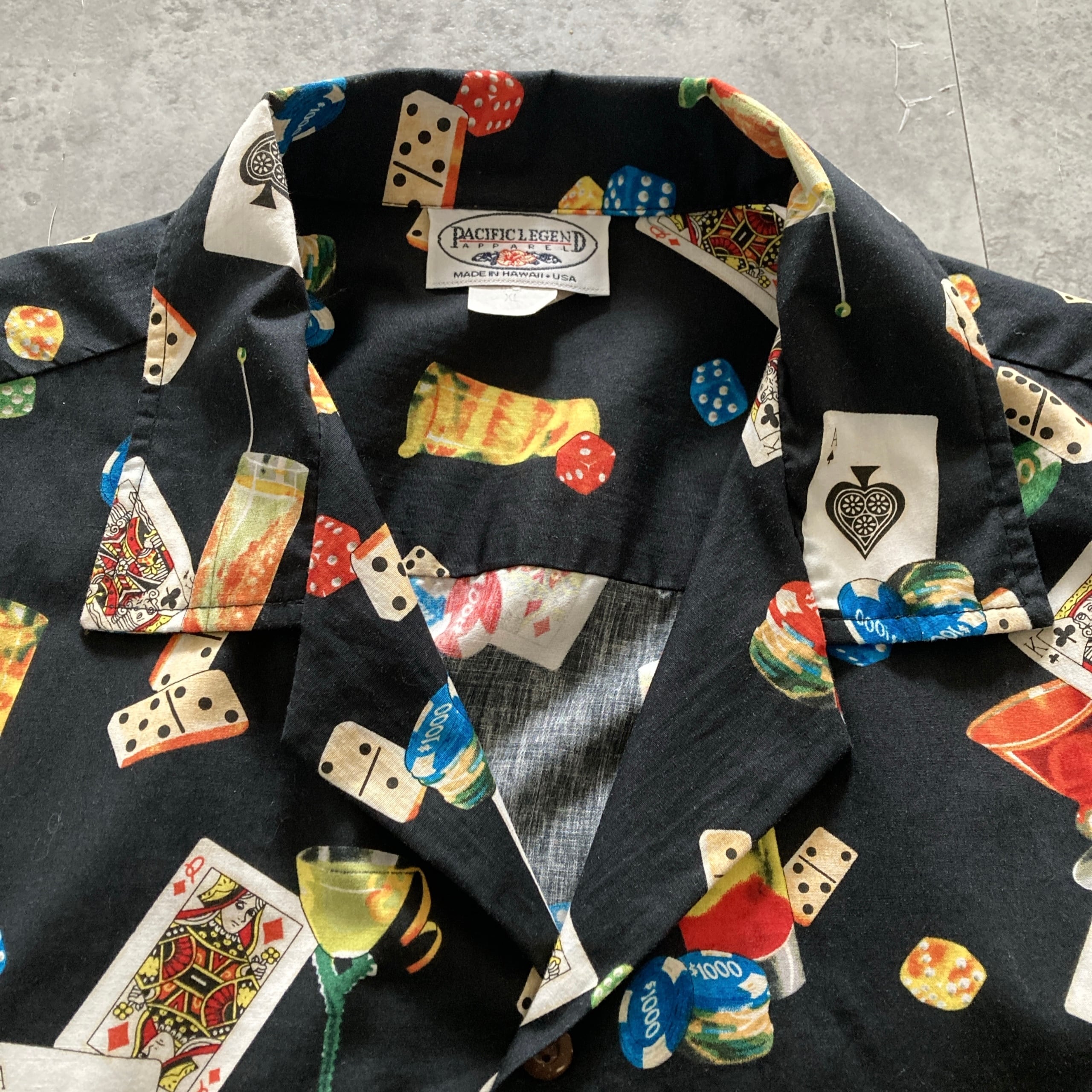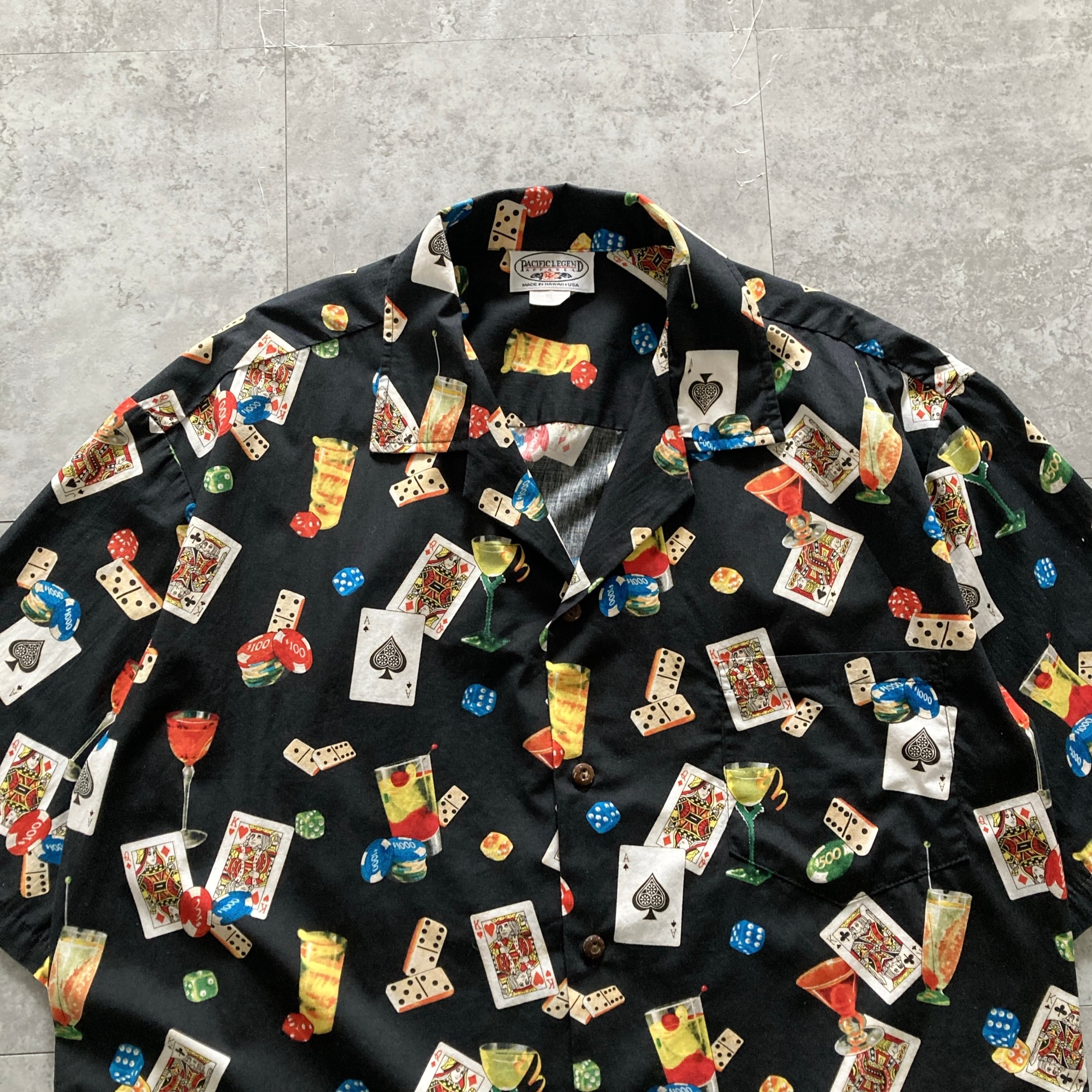 【USA製】80s-90s PACIFIC LEGEND パブリックレジェンド 表記XL トランプ カクテル サイコロ ブラック 総柄 オープンカラーシャツ アロハシャツ