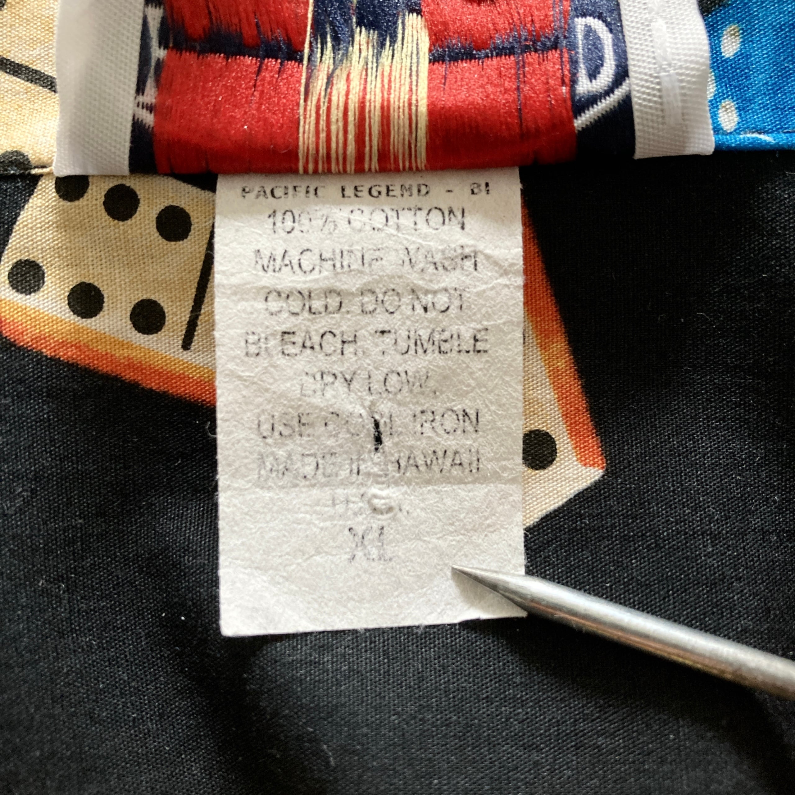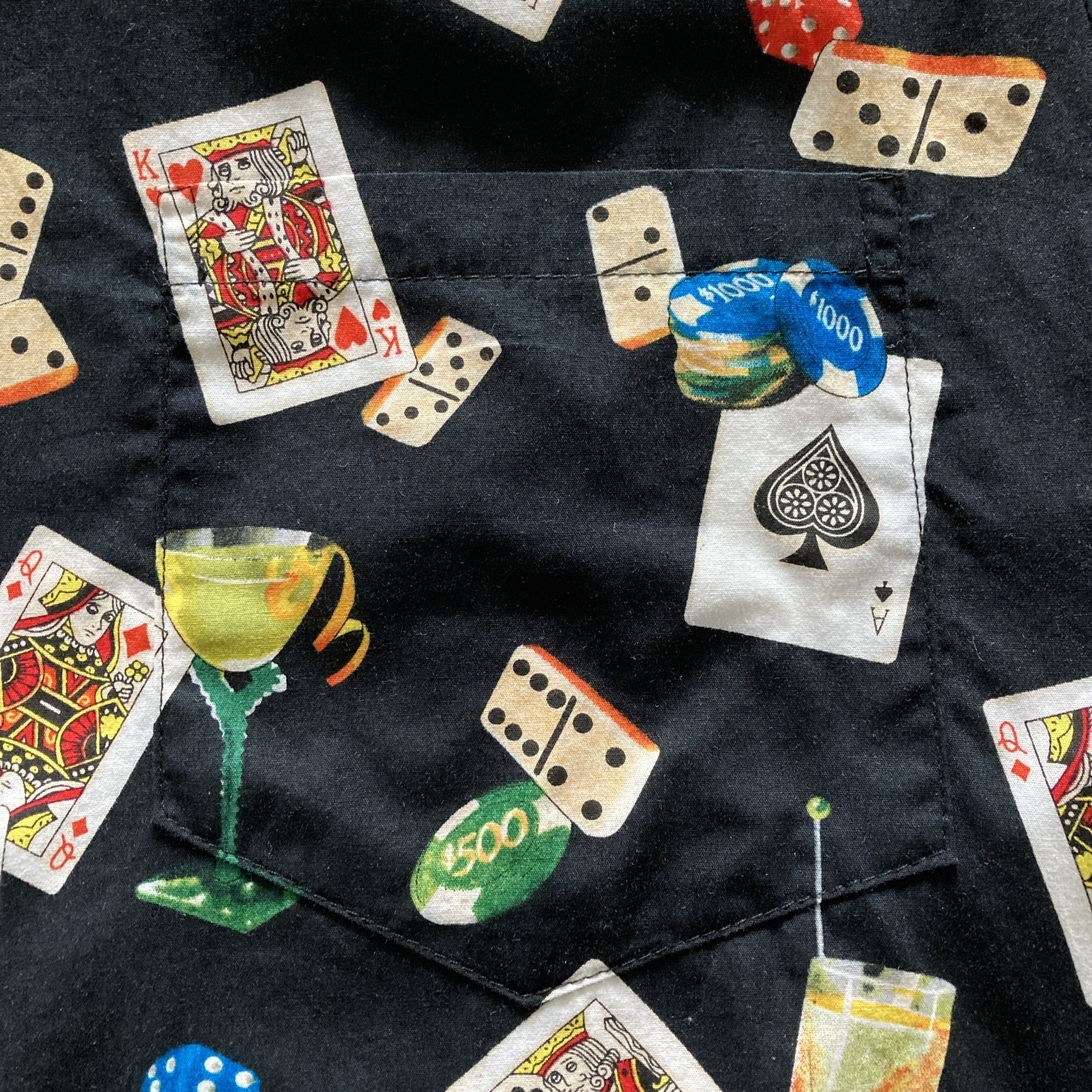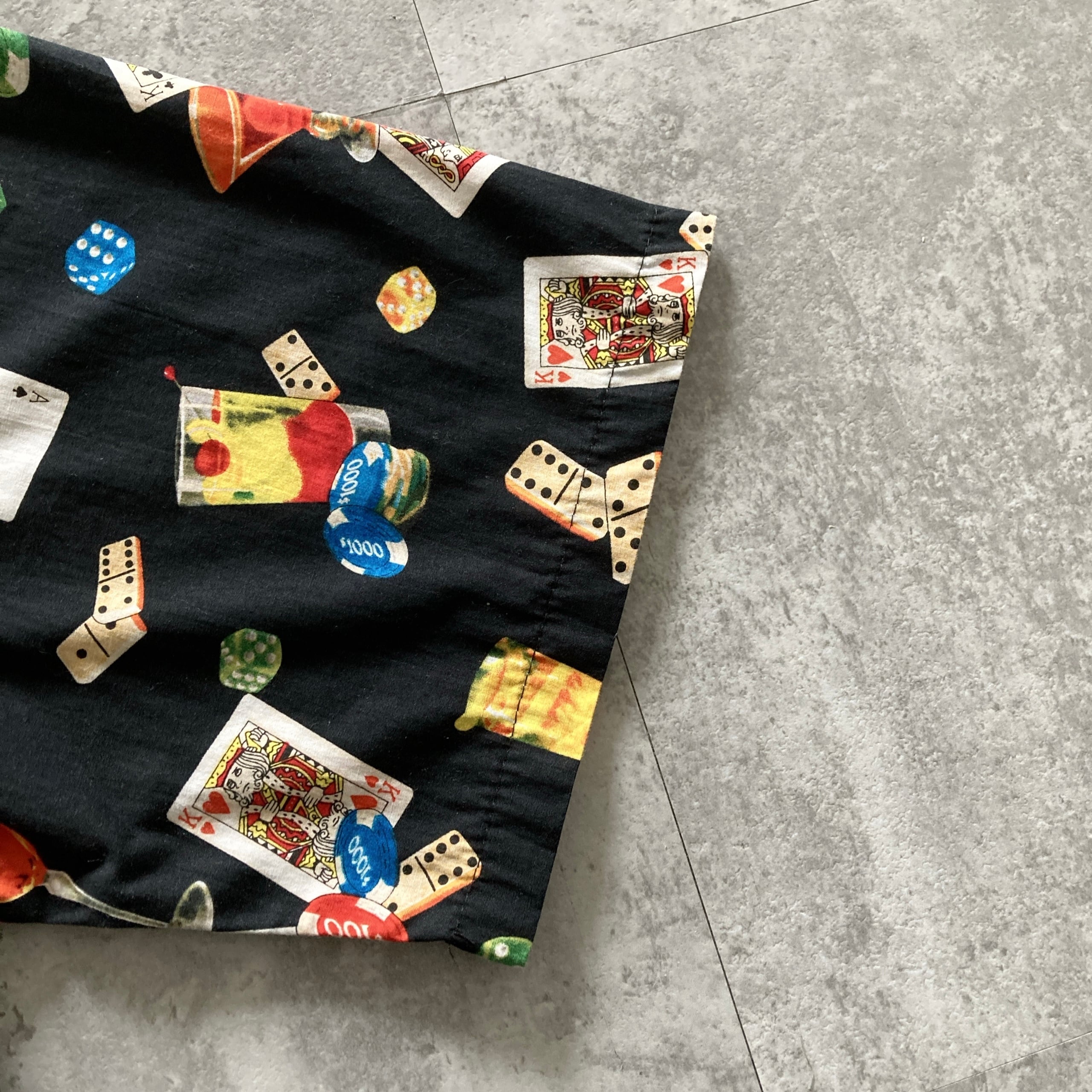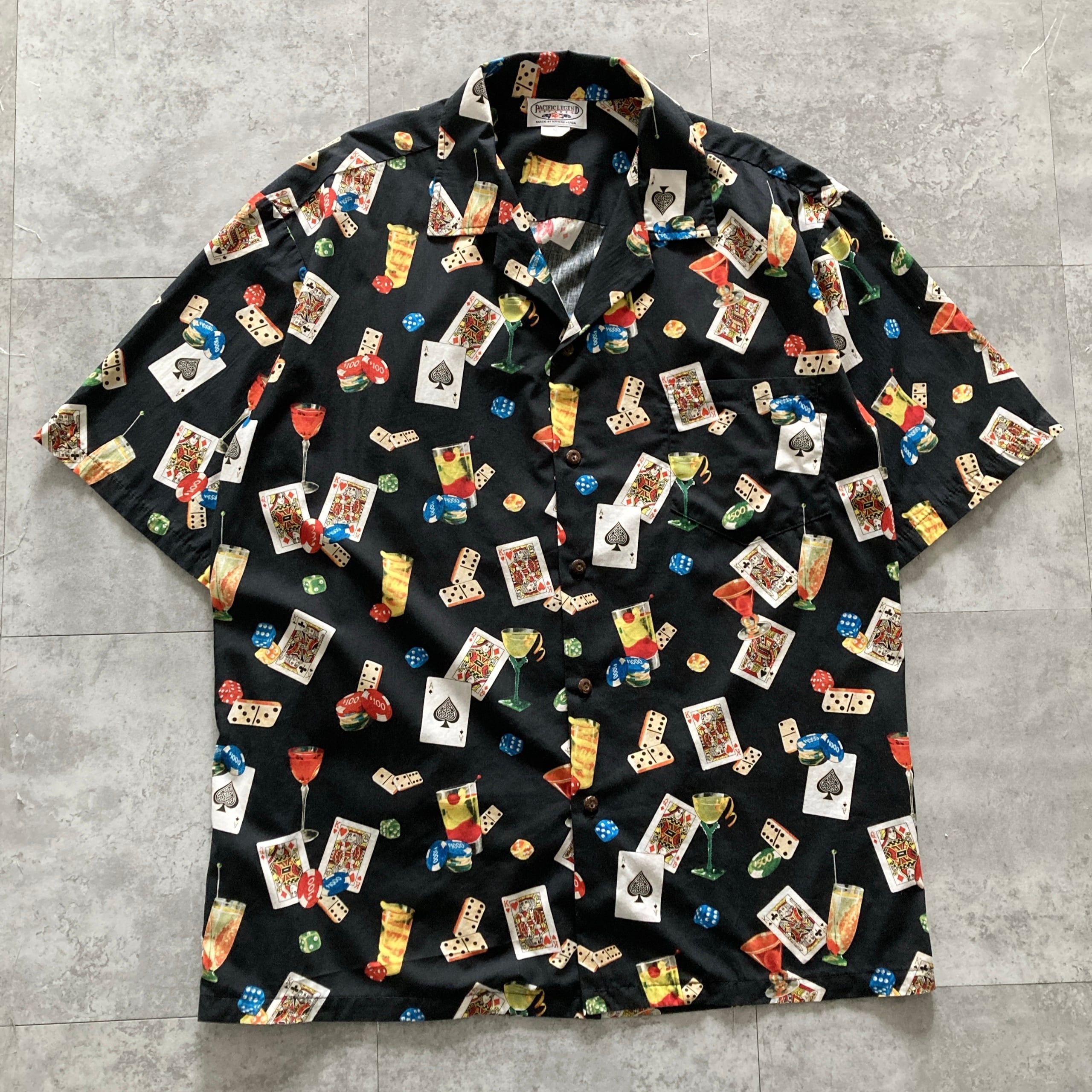 【USA製】80s-90s PACIFIC LEGEND パブリックレジェンド 表記XL トランプ カクテル サイコロ ブラック 総柄 オープンカラーシャツ アロハシャツ