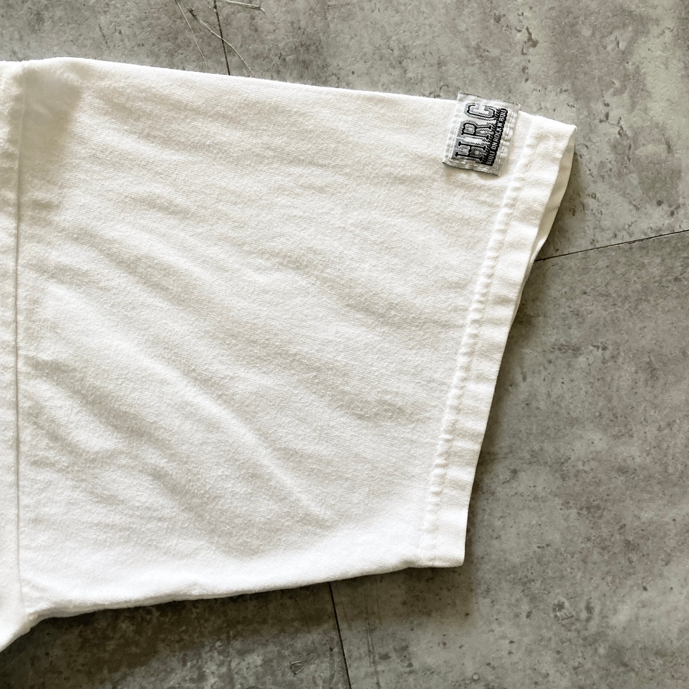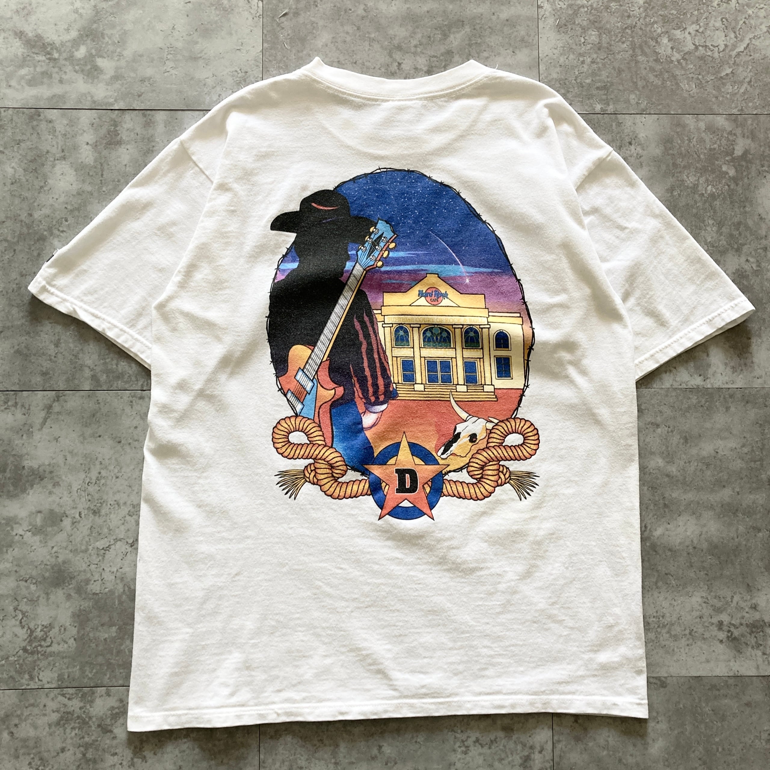 【USA製】Hard Rock CAFE ハードロックカフェ 表記L アメリカ製 両面プリント バックプリント ワンポイント DALLAS カーボーイ ギター ホワイト Tシャツ