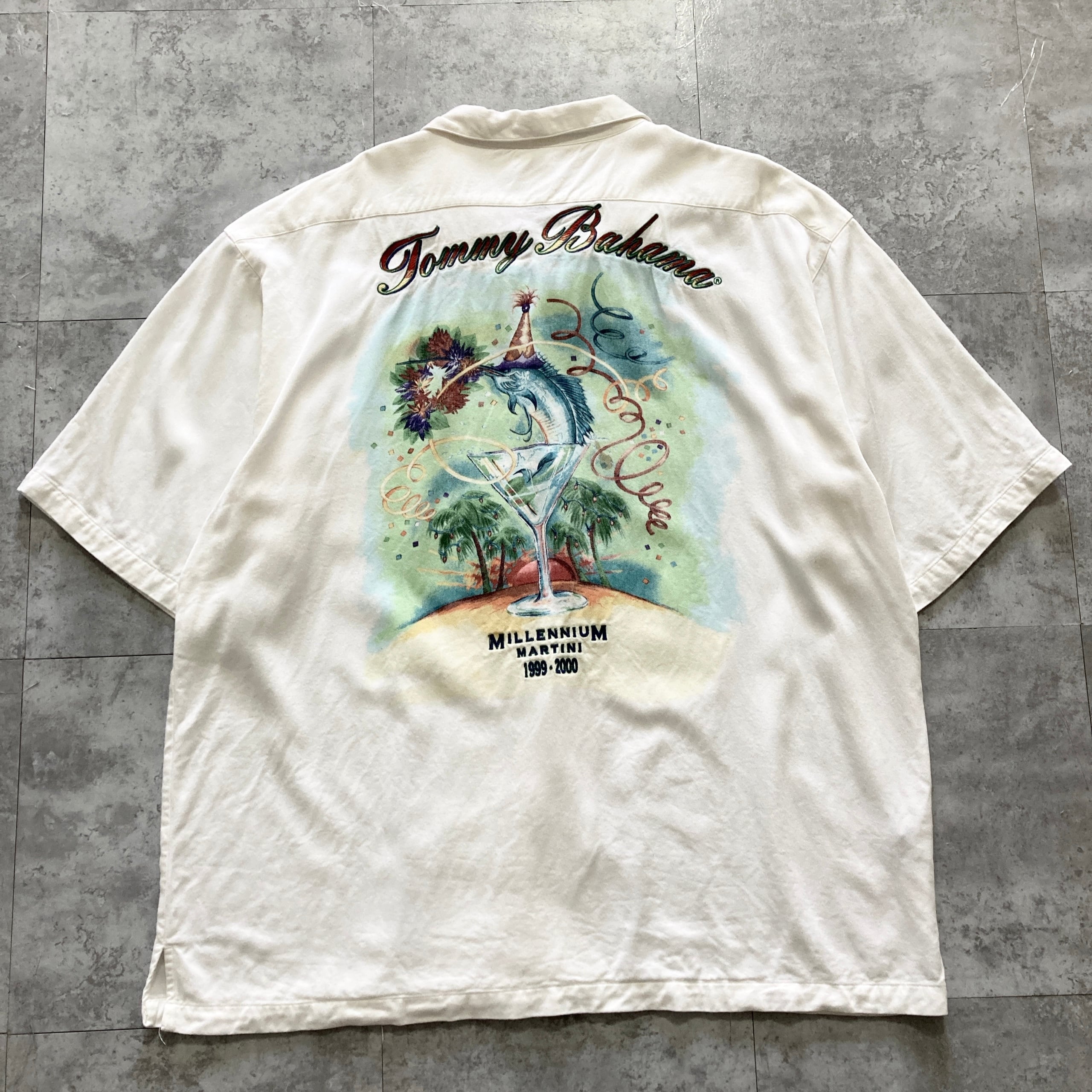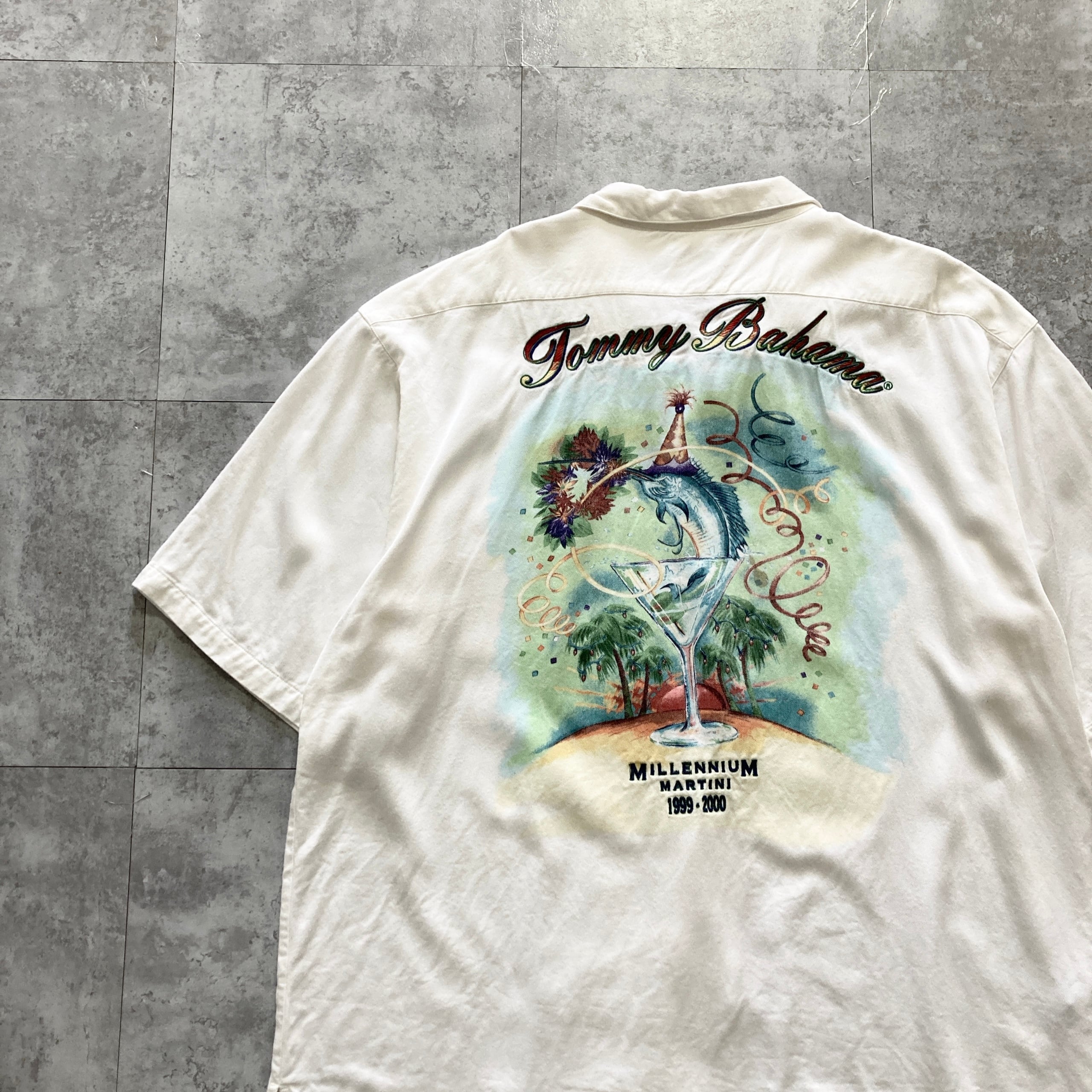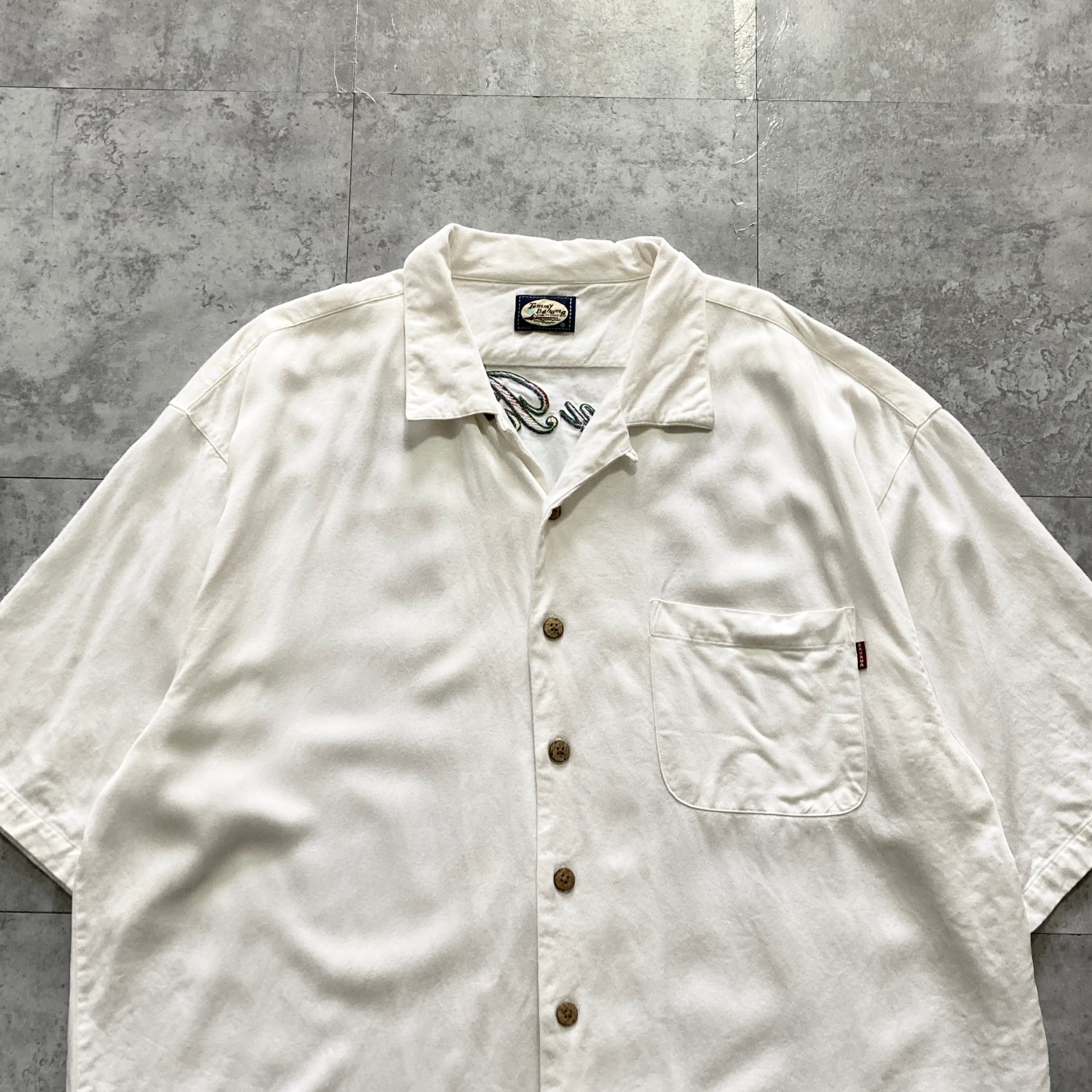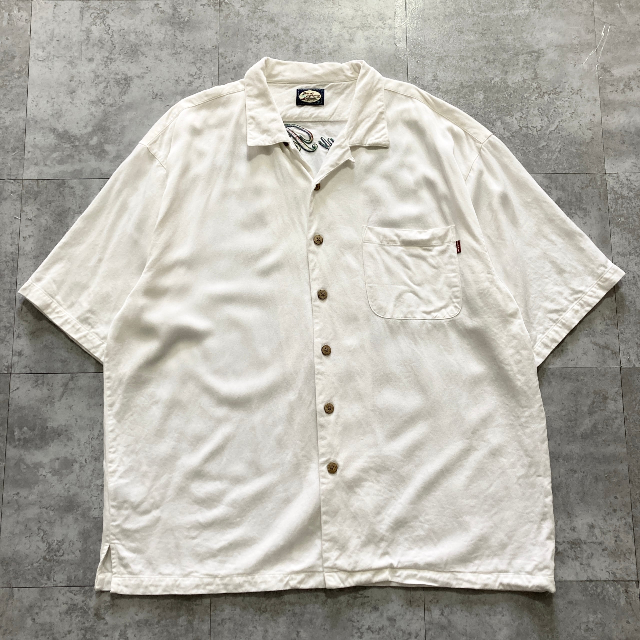 【90s】Tommy Bahama トミーバハマ 表記XL レーヨン100% バック刺繍 バックプリント 開襟シャツ オープンカラーシャツ アロハシャツ