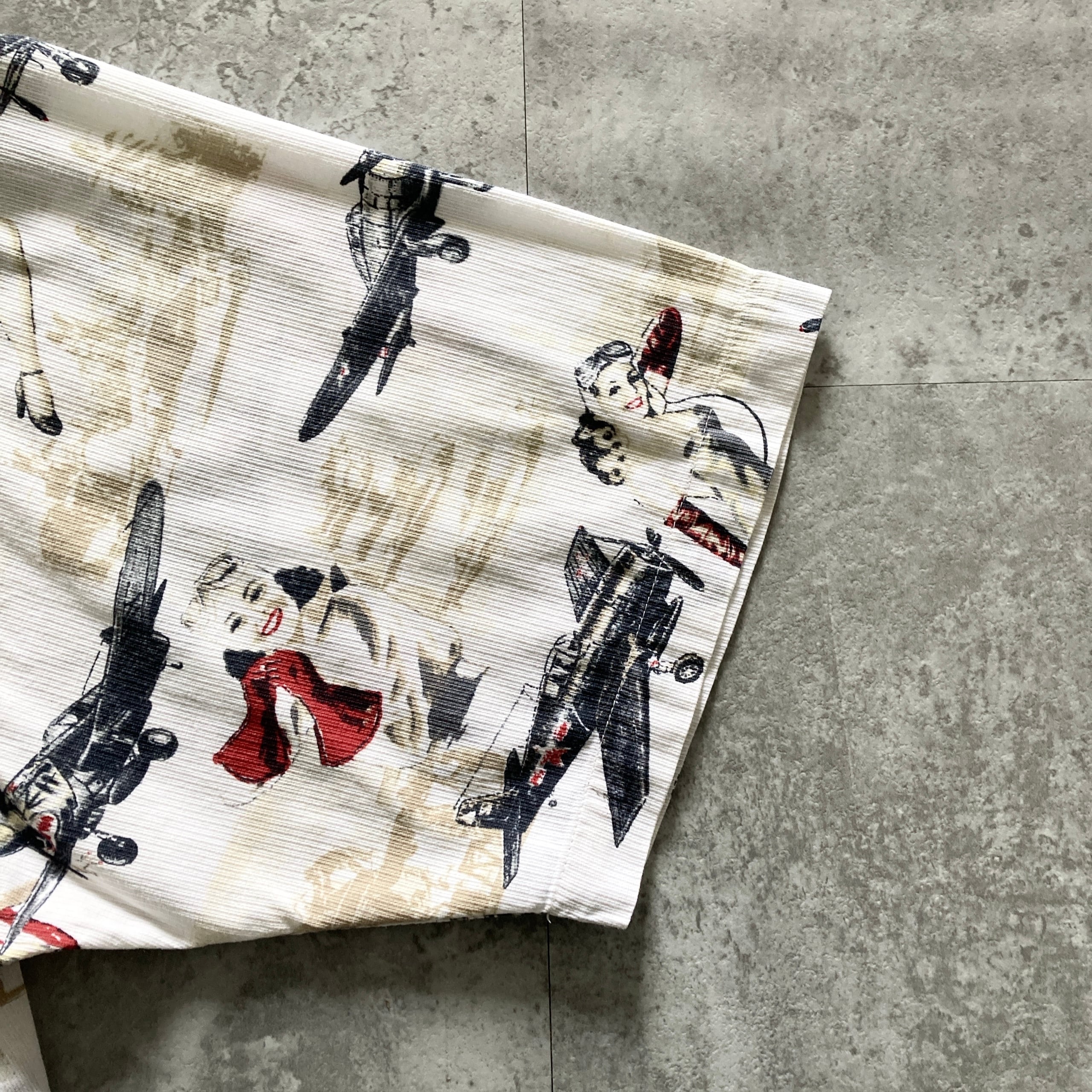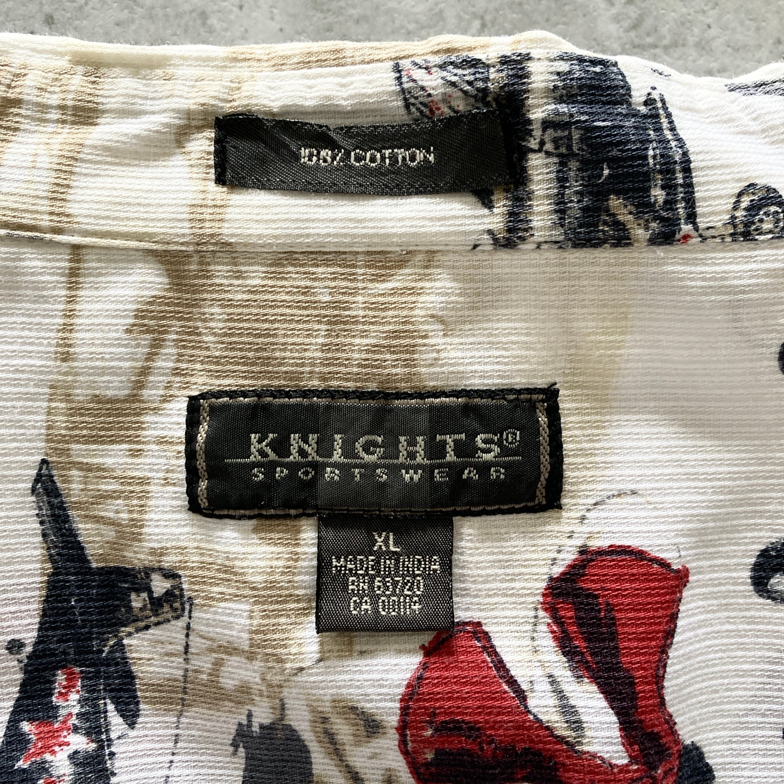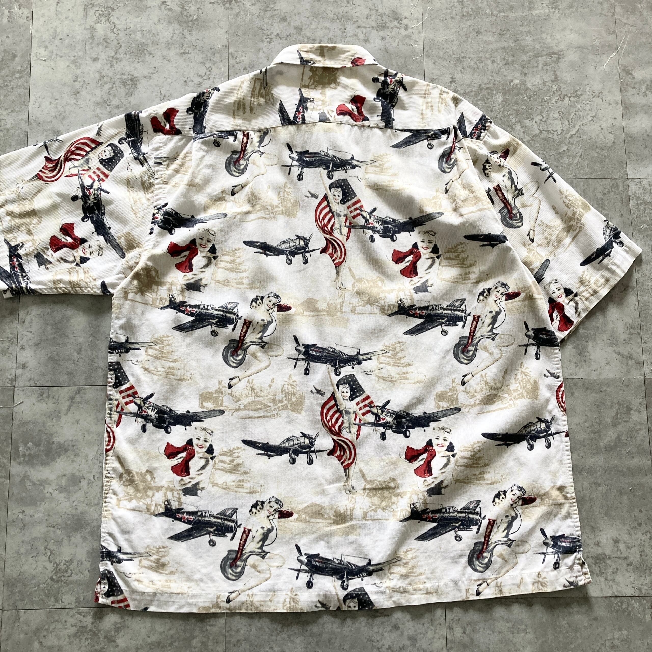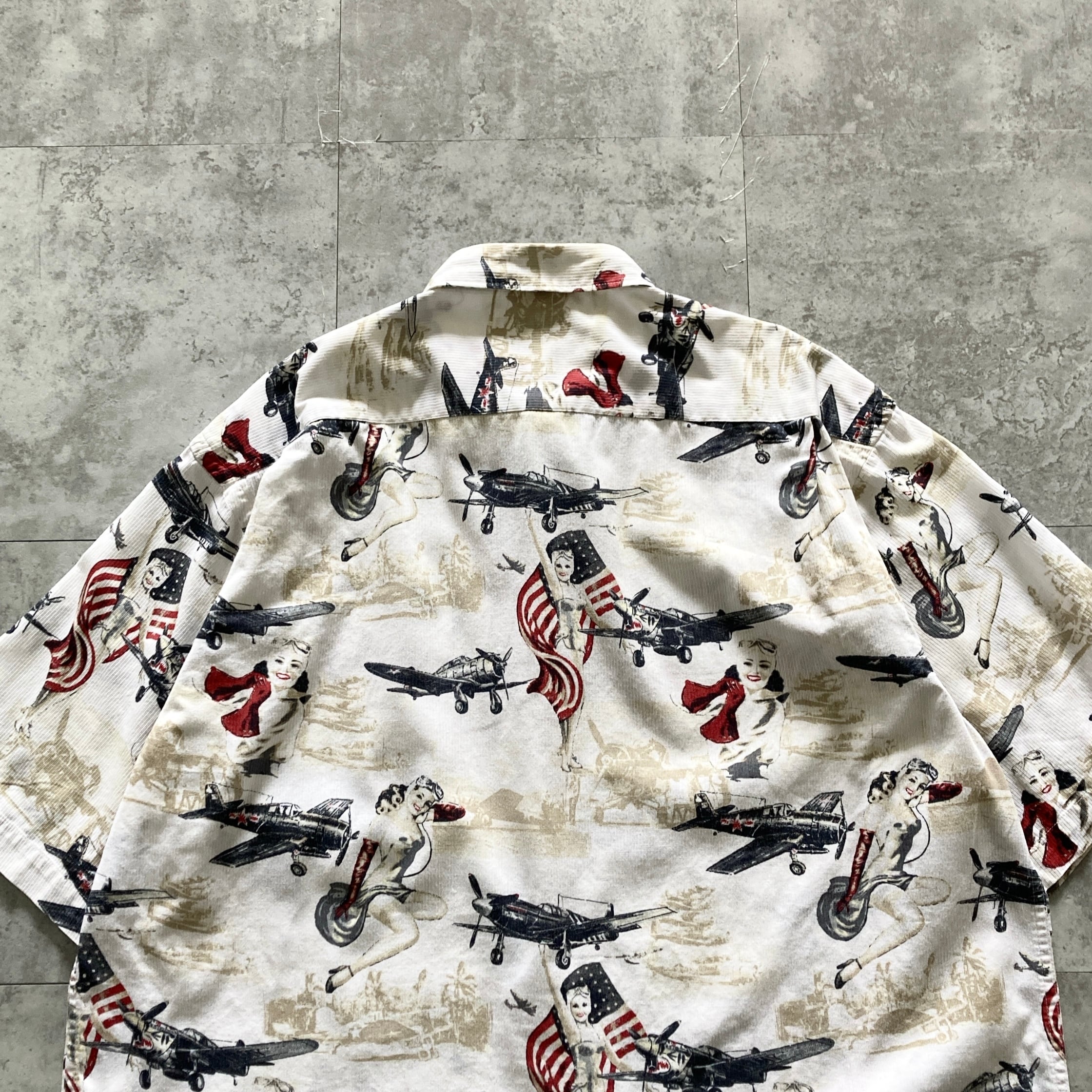 【90s-00s】KNIGHTS 表記XL 美女 戦闘機 胸ポケット 総柄 半袖 シャツ