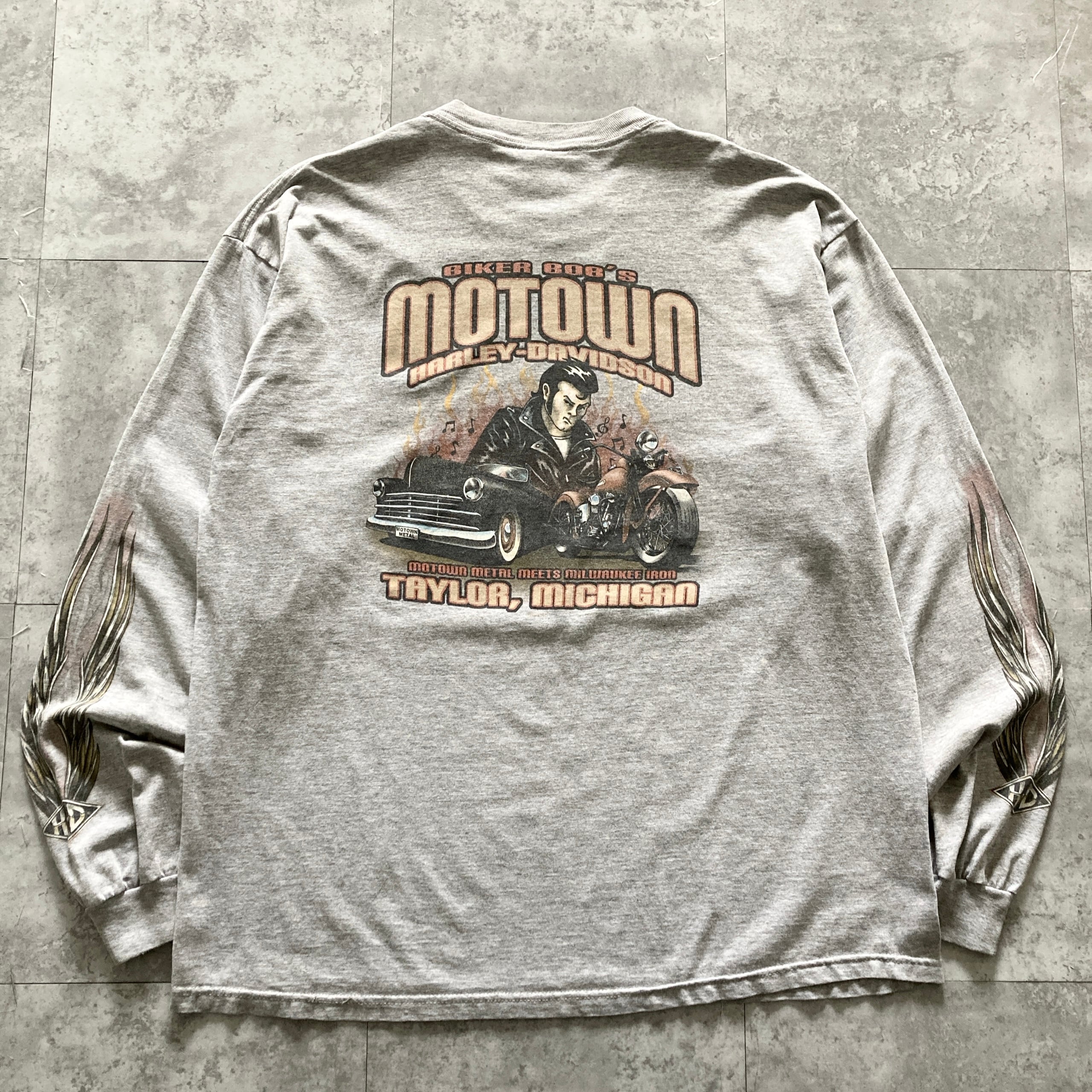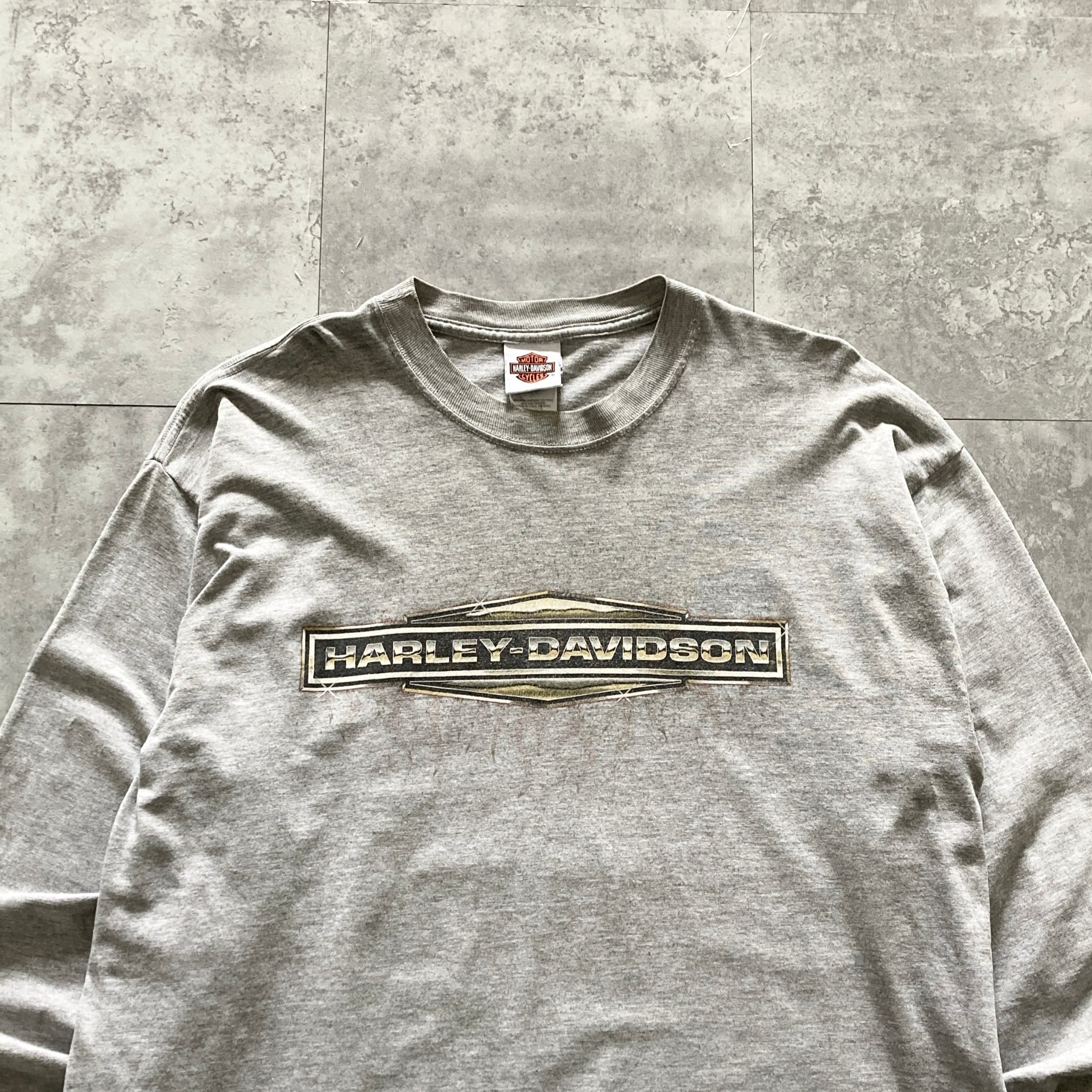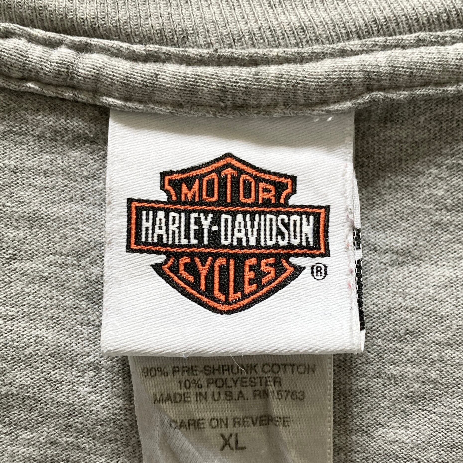 【USA製】ハーレーダビッドソン HARLEY-DAVIDSON 表記XL アメリカ製 両面プリント センターロゴ バックプリント スリーブロゴ バイク レトロカー リーゼント ロンT カットソー