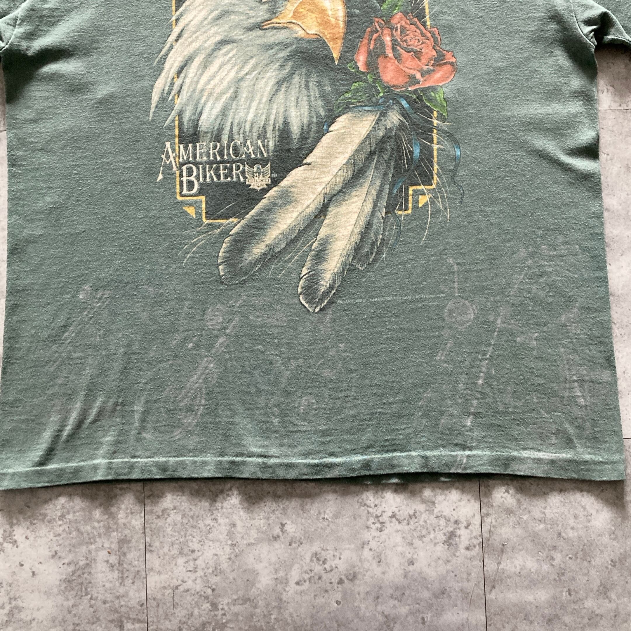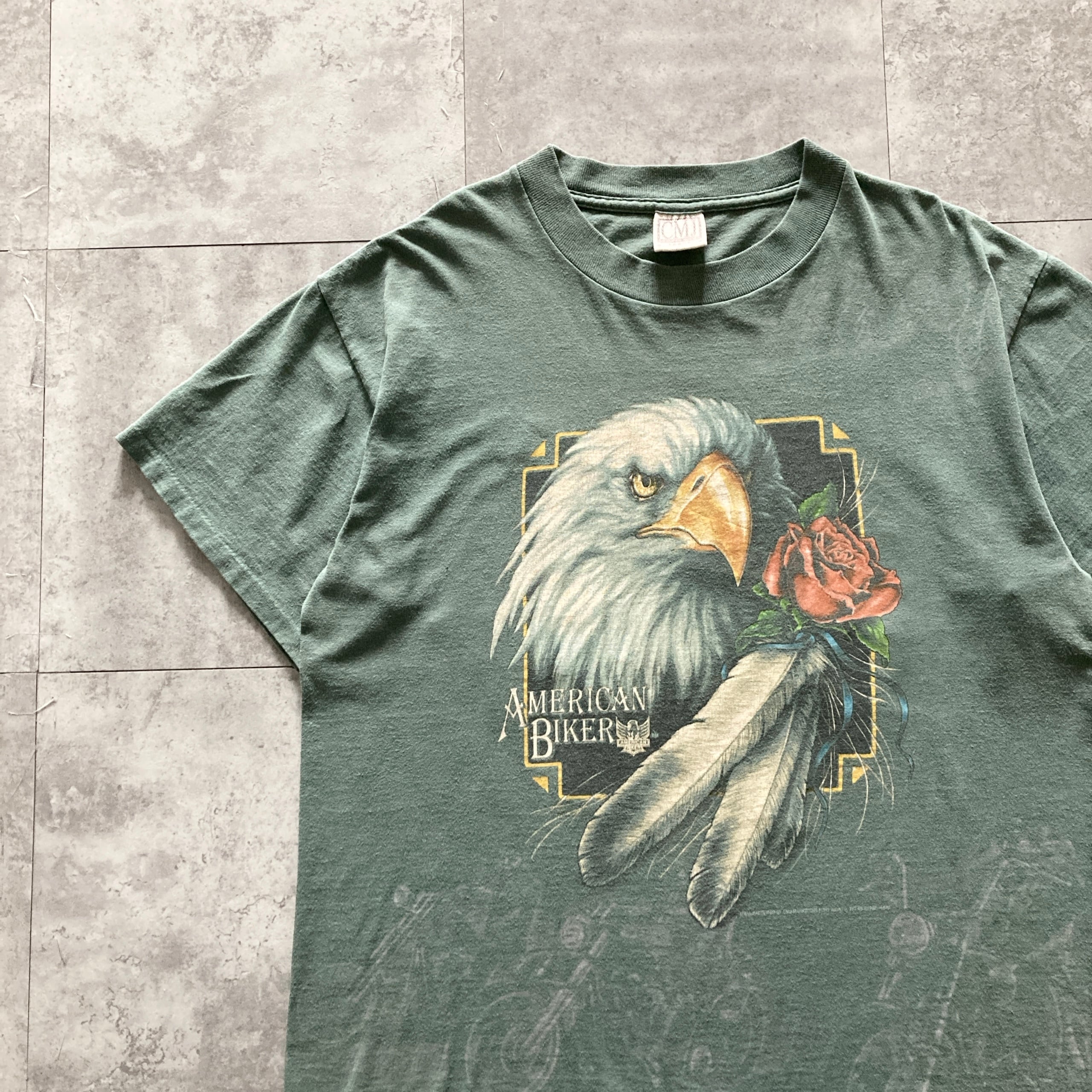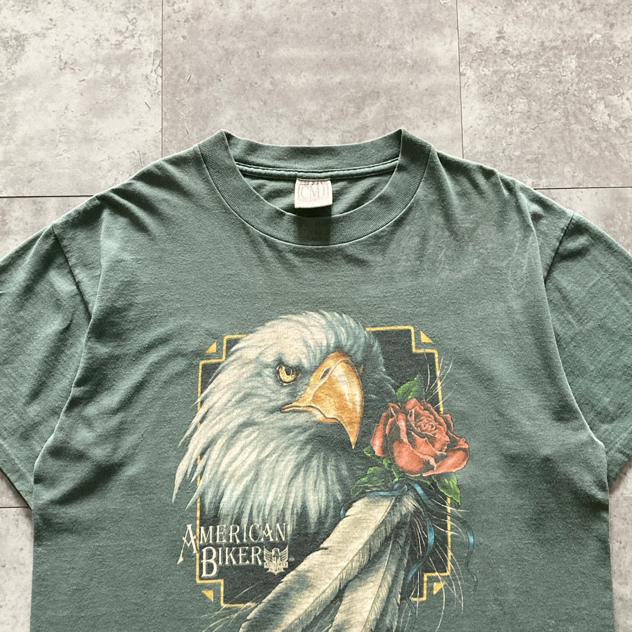 【USA製】90s CMJ 表記L シングルステッチ 両面プリント アメリカ製 イーグル 羽根 薔薇 インディアン モスグリーン Tシャツ
