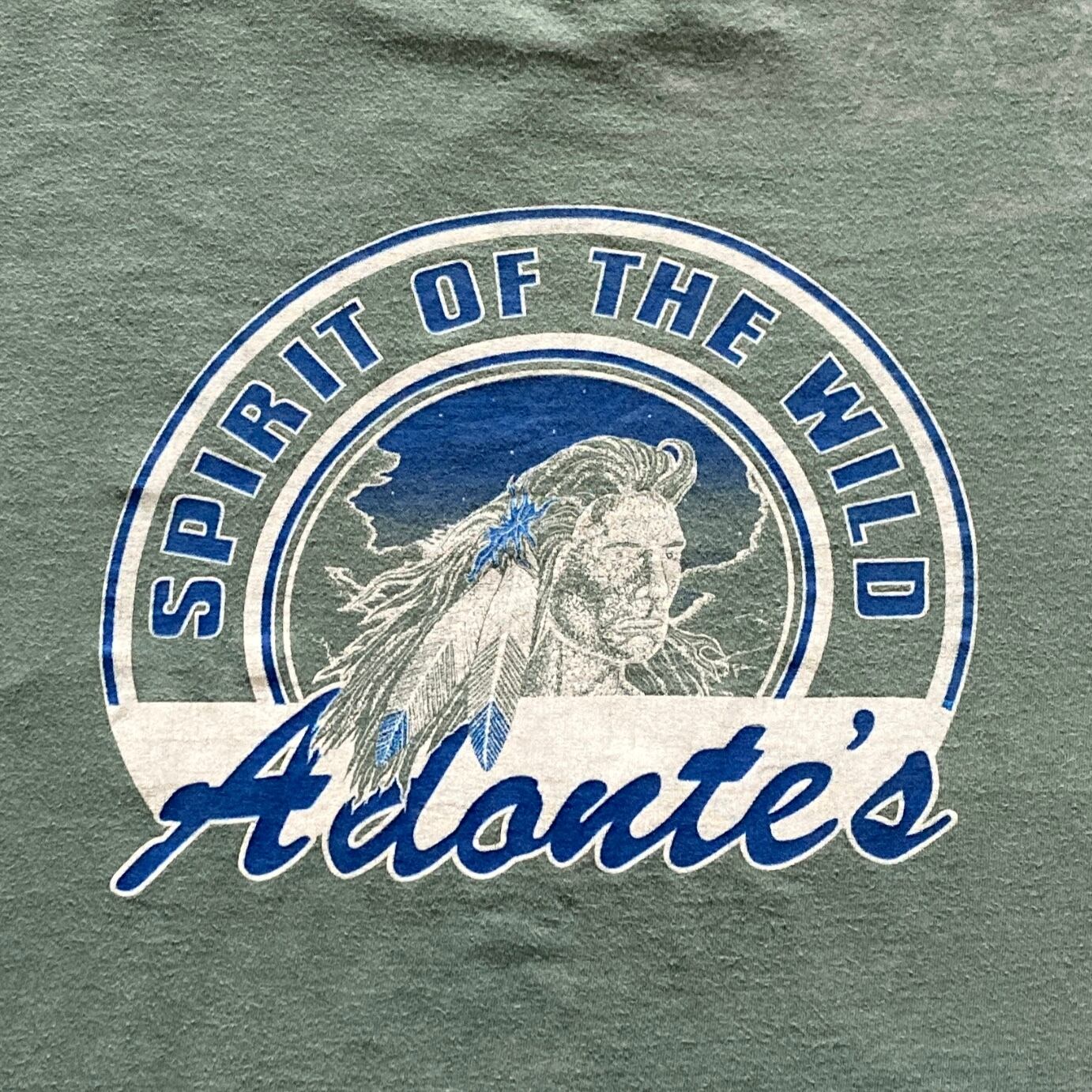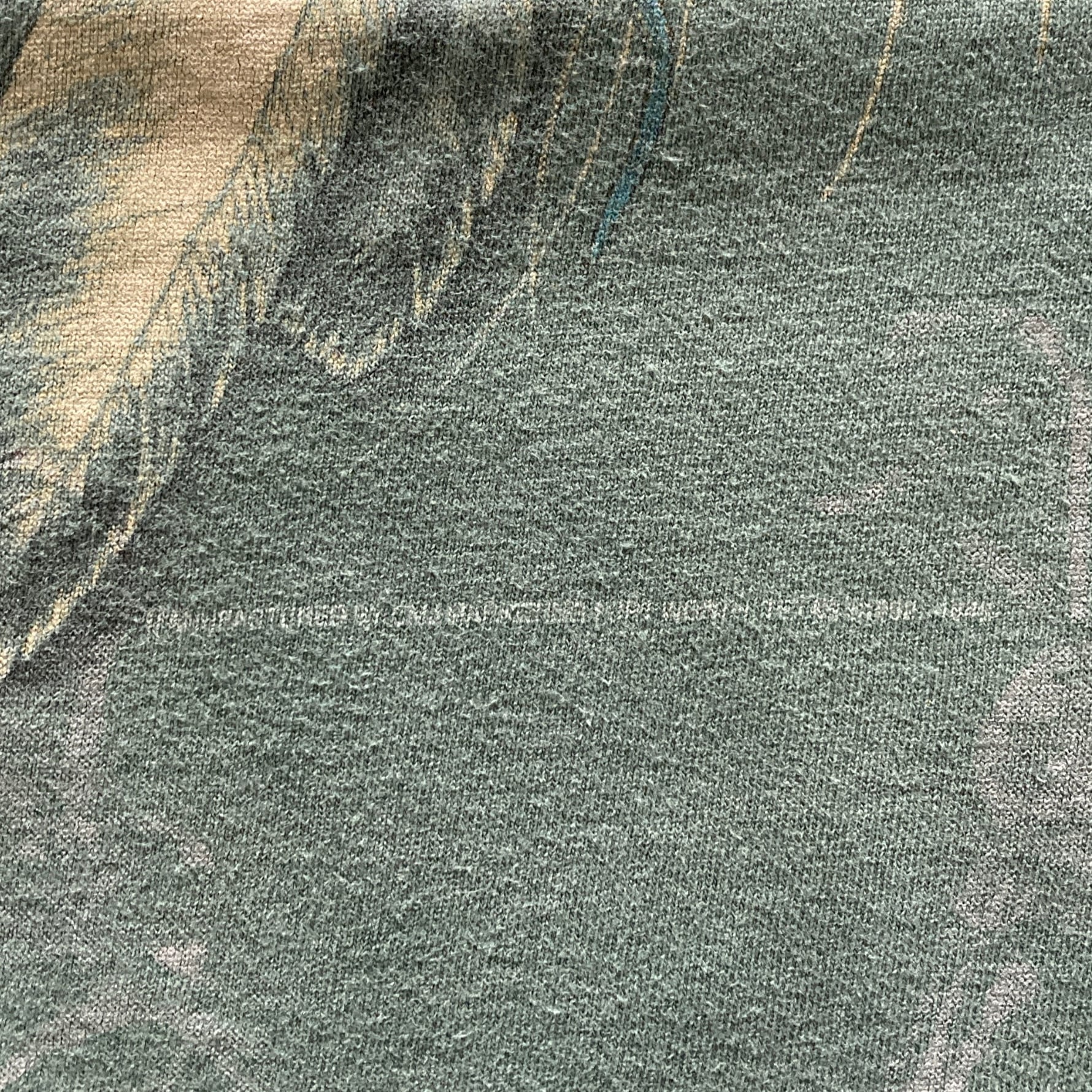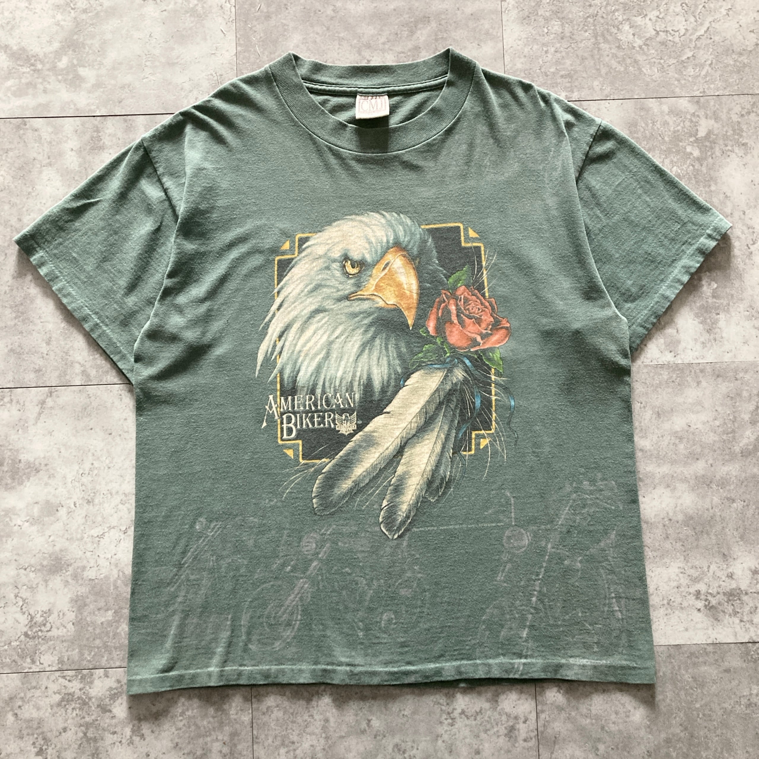 【USA製】90s CMJ 表記L シングルステッチ 両面プリント アメリカ製 イーグル 羽根 薔薇 インディアン モスグリーン Tシャツ