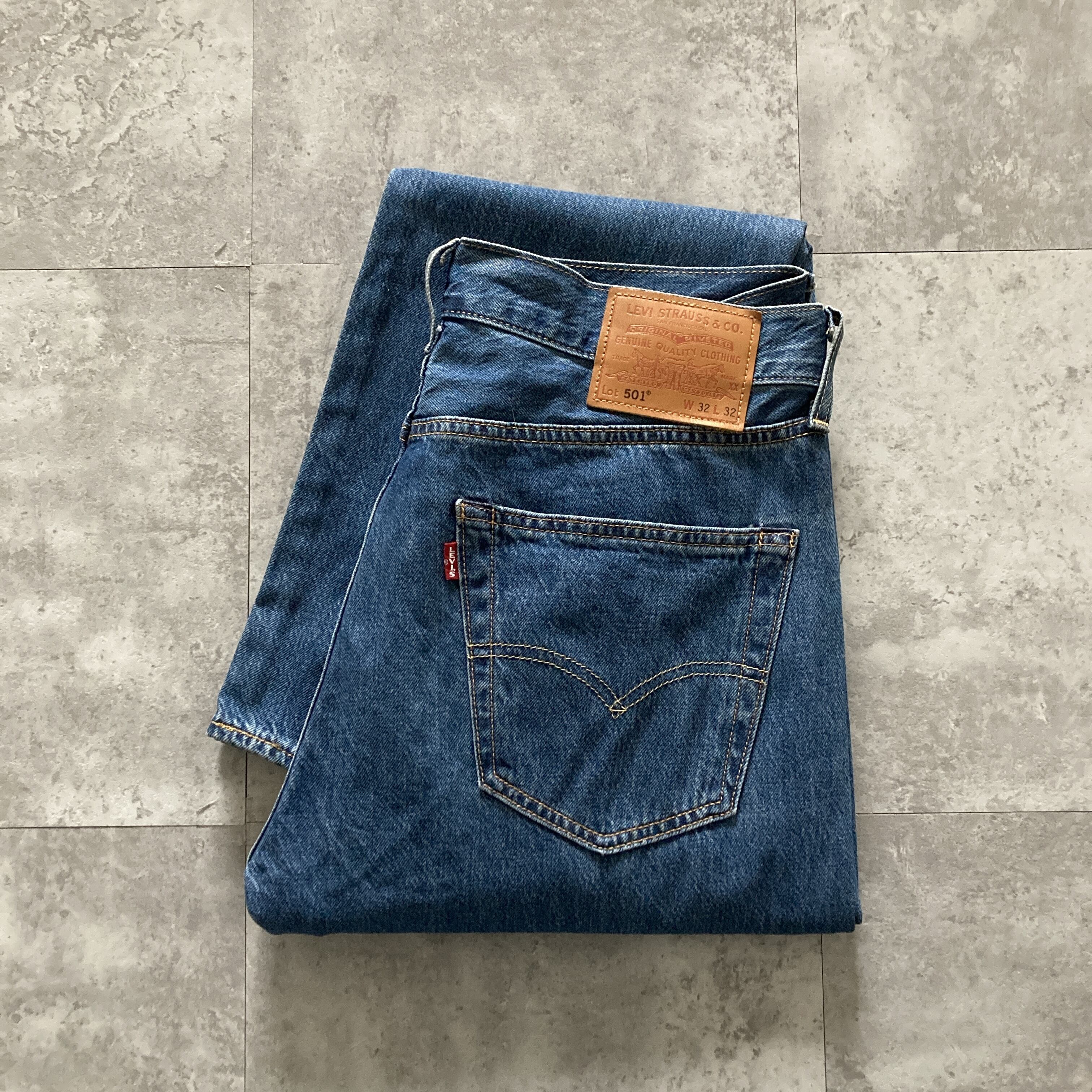 【W32 L32】Levis 501 リーバイス PREMIUM レザーパッチ BIGE チェーンステッチ ボタンフライ デニムパンツ ジーンズ