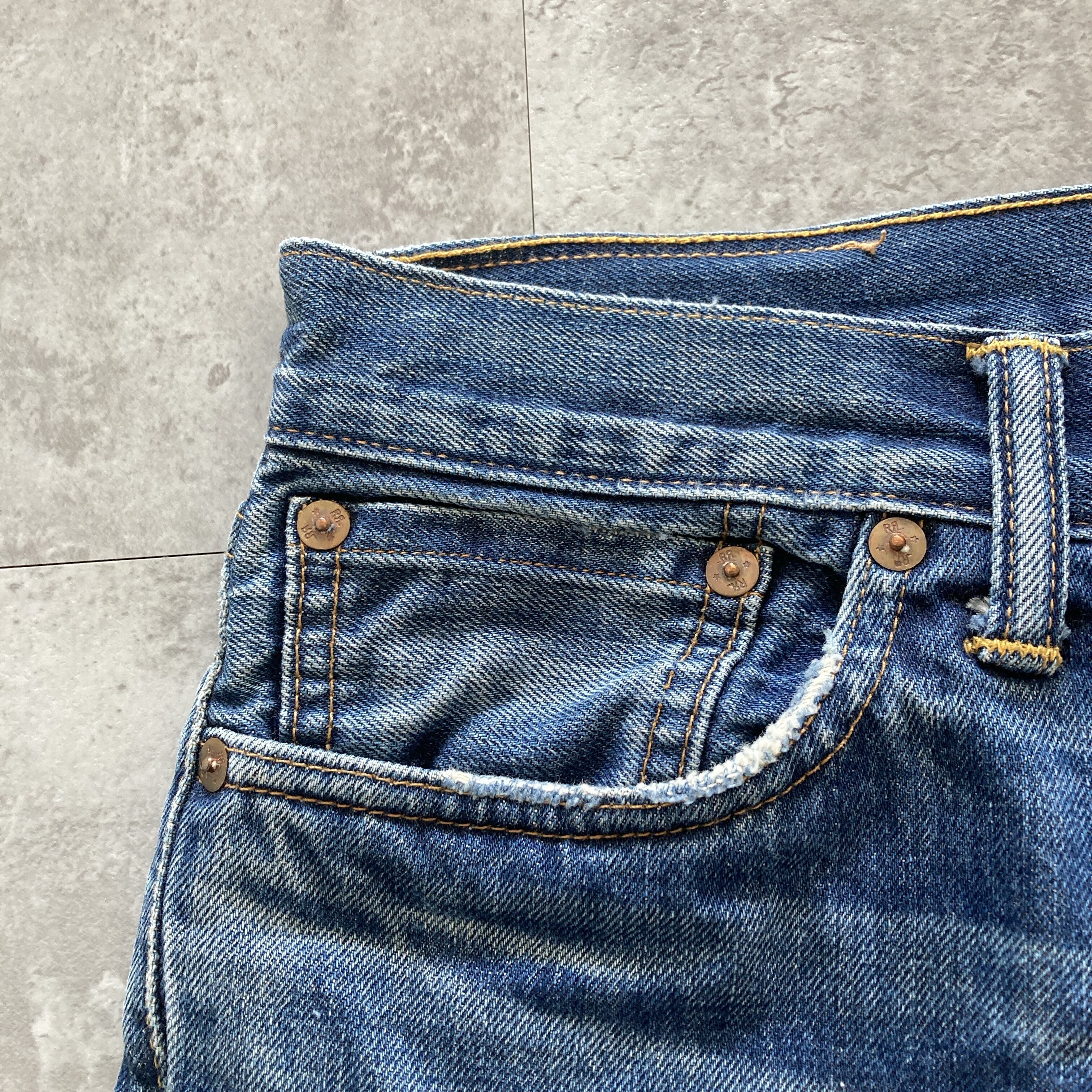【USA製】RRL ダブルアールエル ボタンフライ セルビッチ 赤耳 レザーパッチ チェーンステッチ アメリカ製 表記31 縦落ち ヒゲ ハチノス デニムパンツ ジーンズ